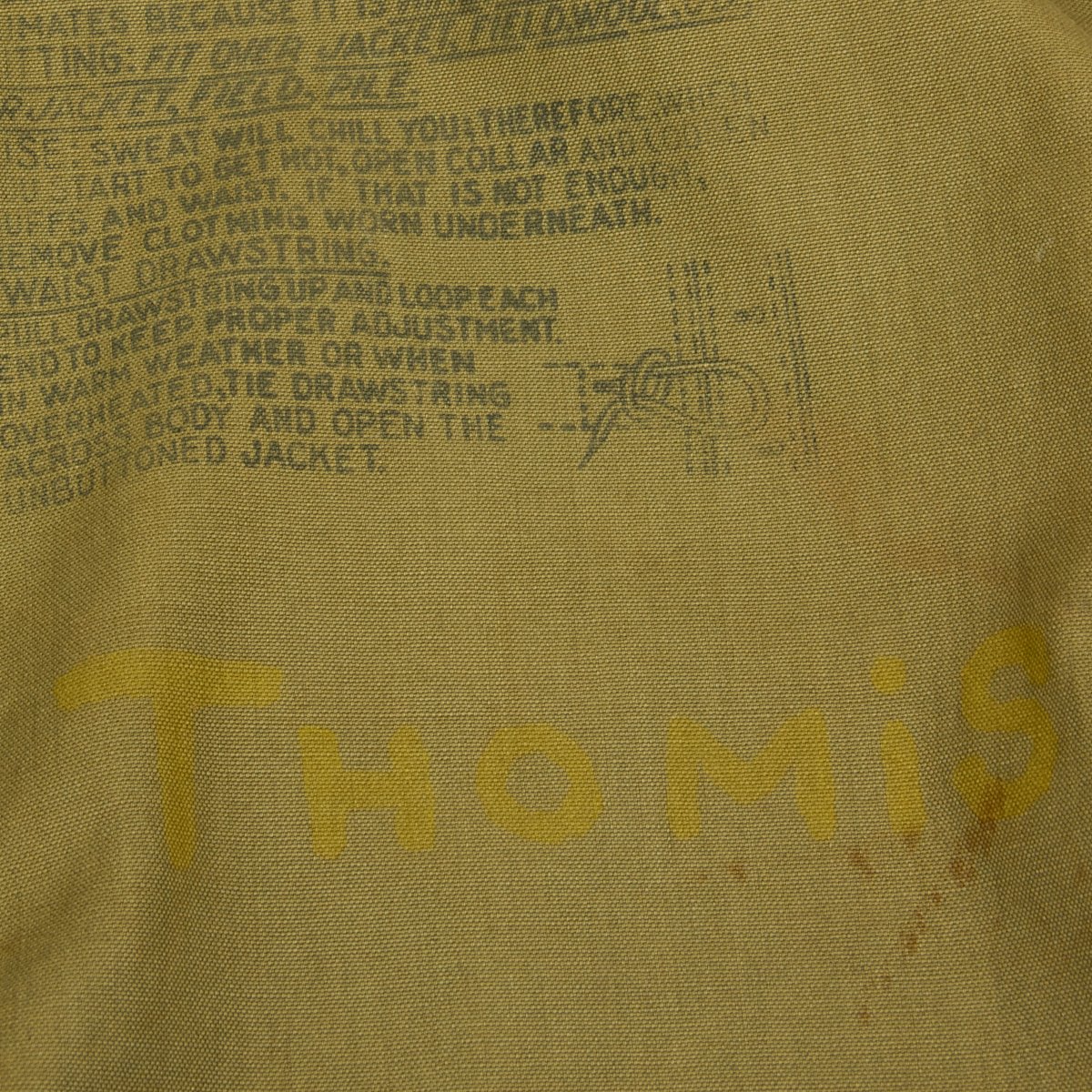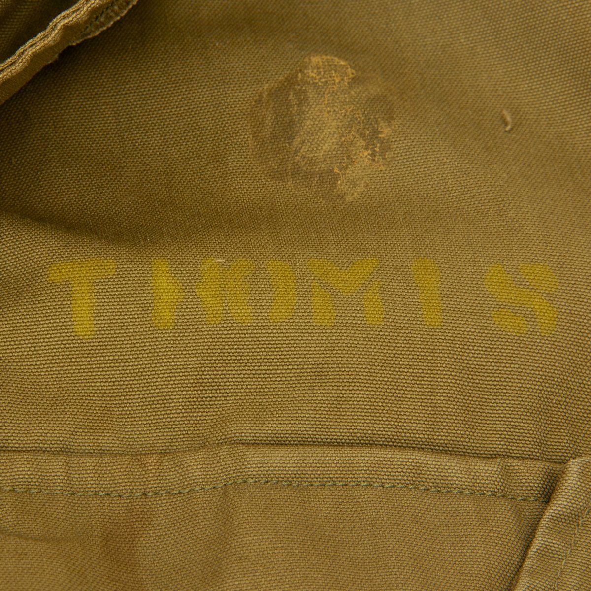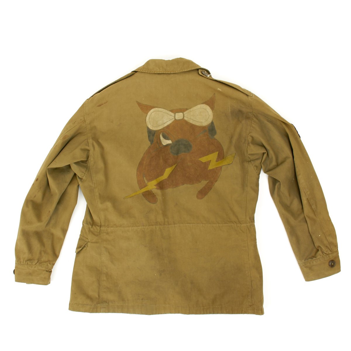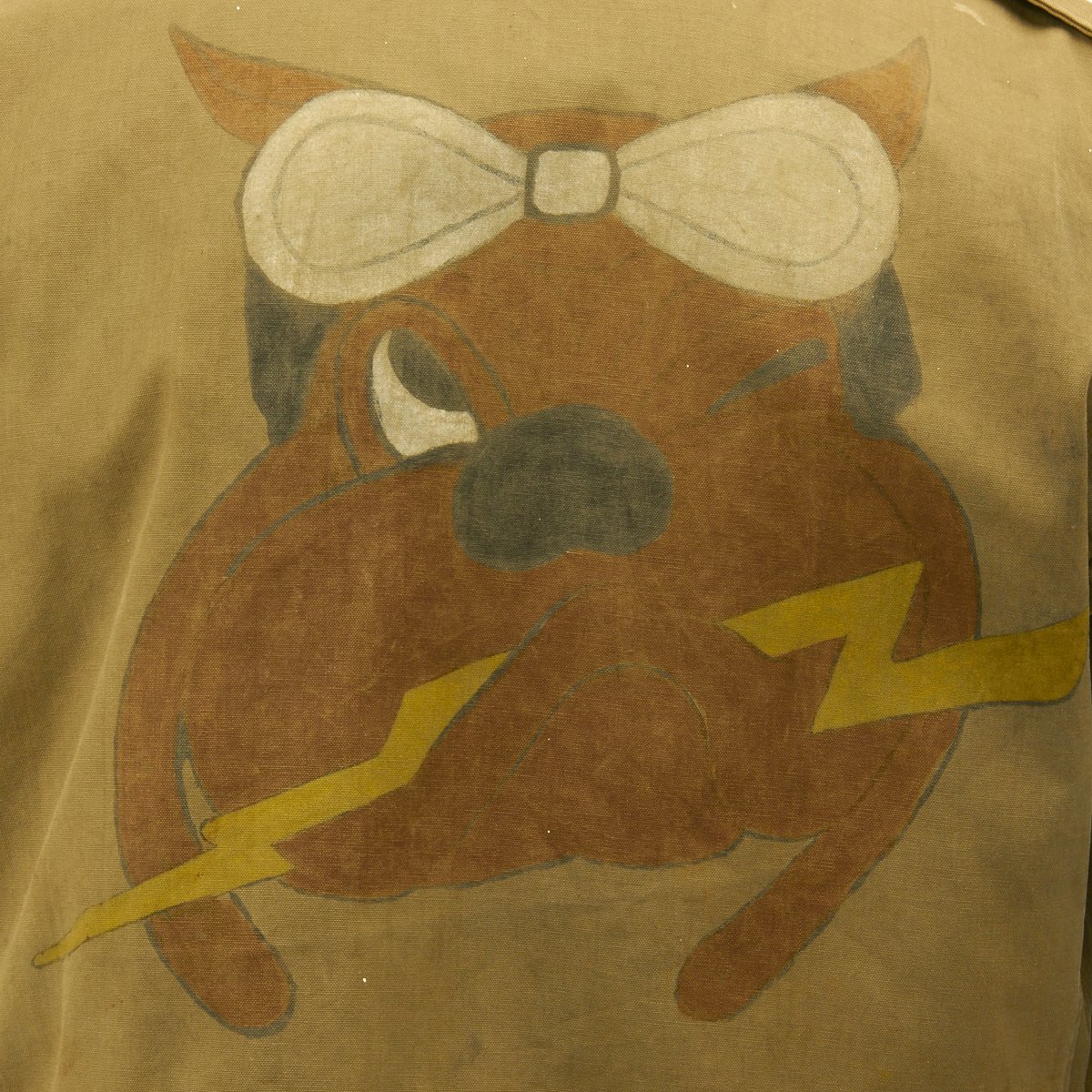 The reverse of the jacket features a hand painted 61st Fighter Squadron insignia of a bulldog holding a lightning bolt in its jaws. The interior is named Thomis which stands for Joseph Thomis who became an officer after the war but was killed in 1948.