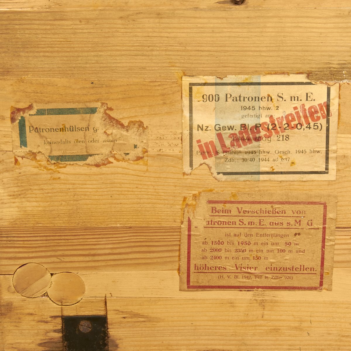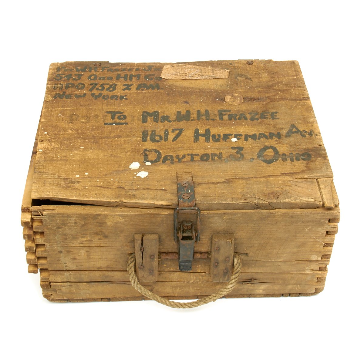 - Wood German Ammunition box used by Frazee to ship home war trophies, address to his father in Dayton, Ohio. The box still bear original German paper labels on interior of lid.
