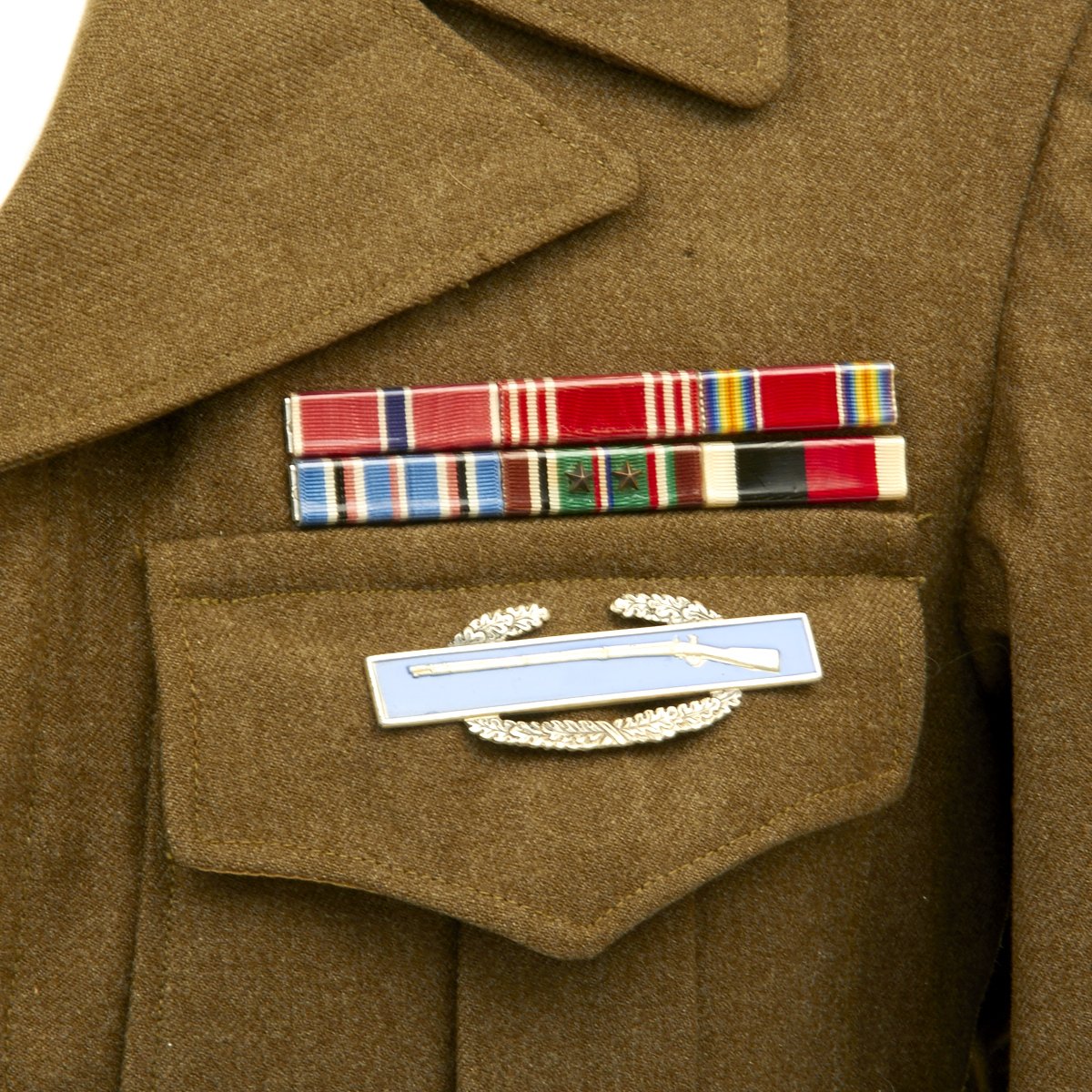 - Ike jacket in excellent condition with 69th Infantry Division "fighting 69" patch on the right shoulder, Armored Division Patch on left shoulder, Sterling Silver Combat Infantryman Badge, Medal ribbons that include: Bronze Star Medal, Good Conduct, American Campaign Medal, European–African–Middle Eastern Campaign Medal with 2 Bronze Stars, Army of Occupation Medal and two overseas service bars on the left sleeve indicating 12+ months of overseas service. The inside liner bears his name.