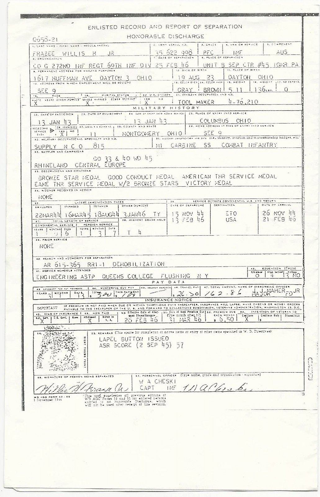 Original Items: One-one-of-a-kind. A fantastic uniform grouping that belonged to PFC Willis H. Frazee Jr. (ASN: 35 622 998 ) a soldier in Company G, 2nd Battalion, 272nd Infantry Regiment (The Battle Axe Regiment), 69th Infantry division who fought in World War Two. He participated in some of the most ferocious campaigns including Rhineland and Central Europe and was awarded the Bronze Star for Gallantry in Action.