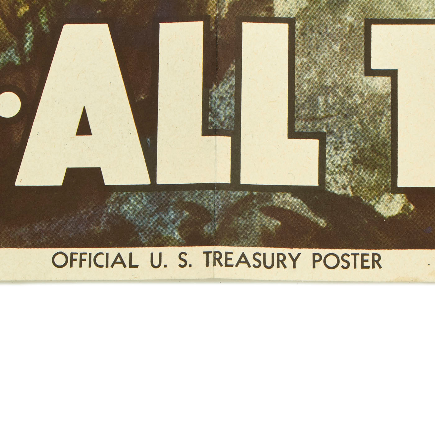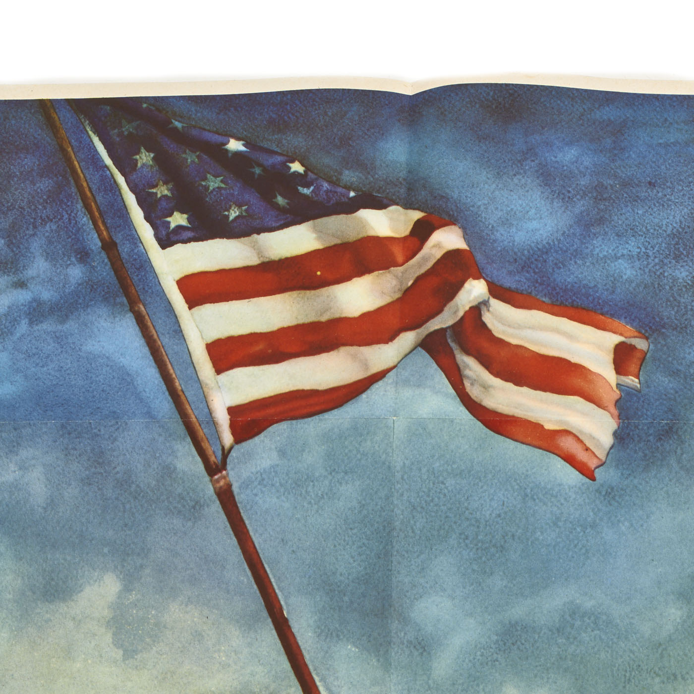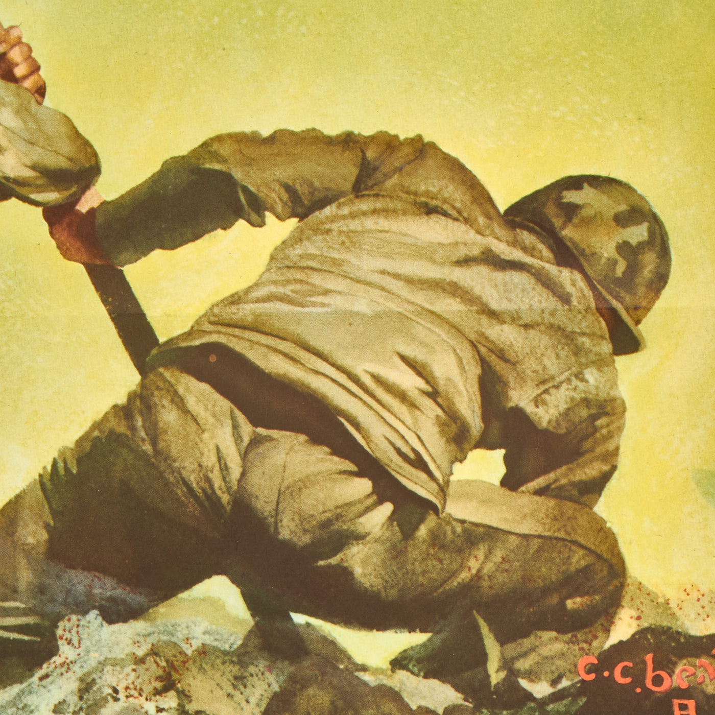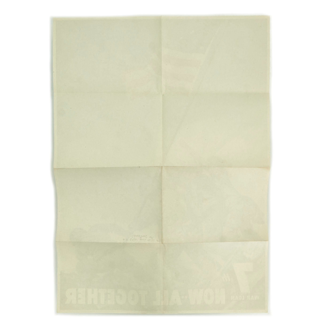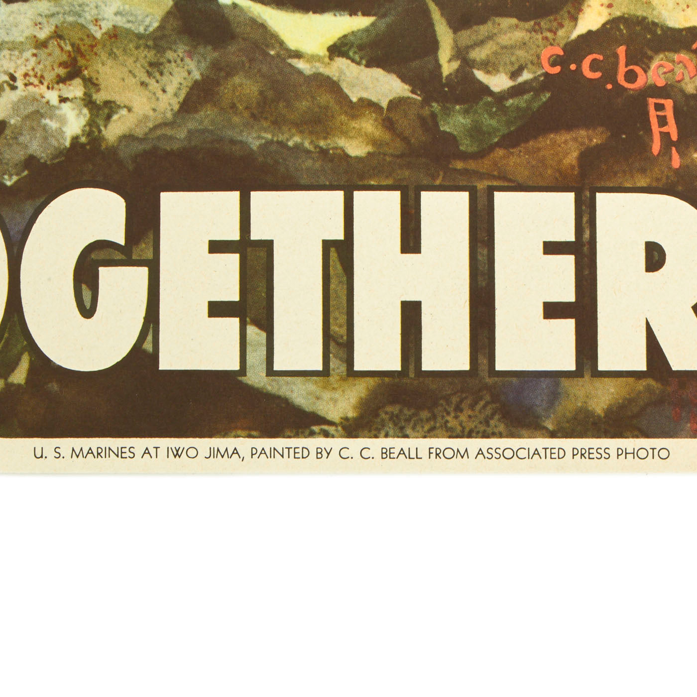 This 25 ½” x 18 ½” poster was a product of one of those realistic pictures in photographic detail produced. Probably the most famous, well-known image from WW2, the Flag Raising at Iwo Jima, was the image chosen for this poster. This Pulitzer Prize winning photograph by Honorary Marine and Photographer Joseph Rosenthal, was painted by artist Cecil Calvert Beall in 1945.