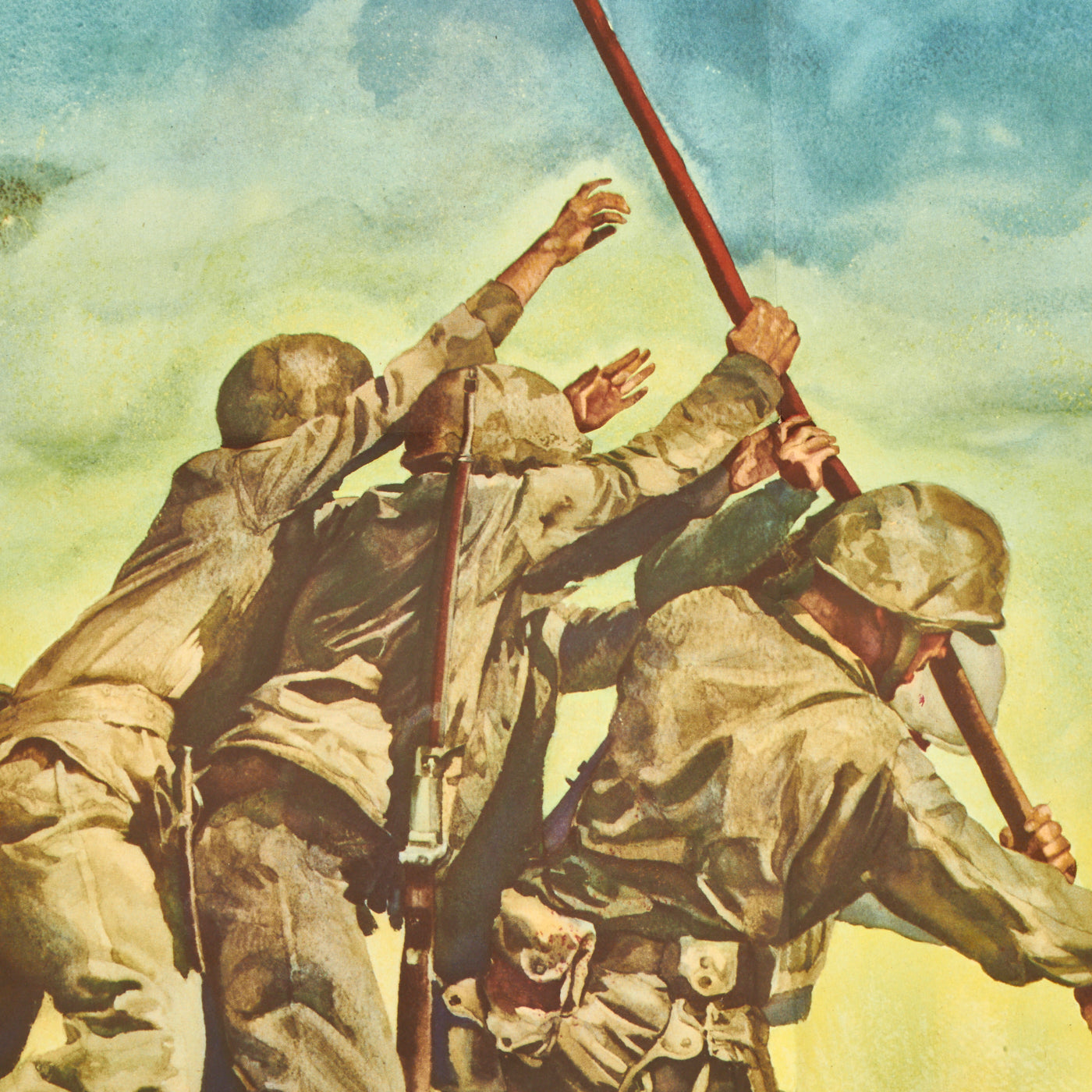 The poster features the famed Flag Raising at Iwo Jima with very beautiful vividness and color. The text that can be found towards the bottom of the poster is: