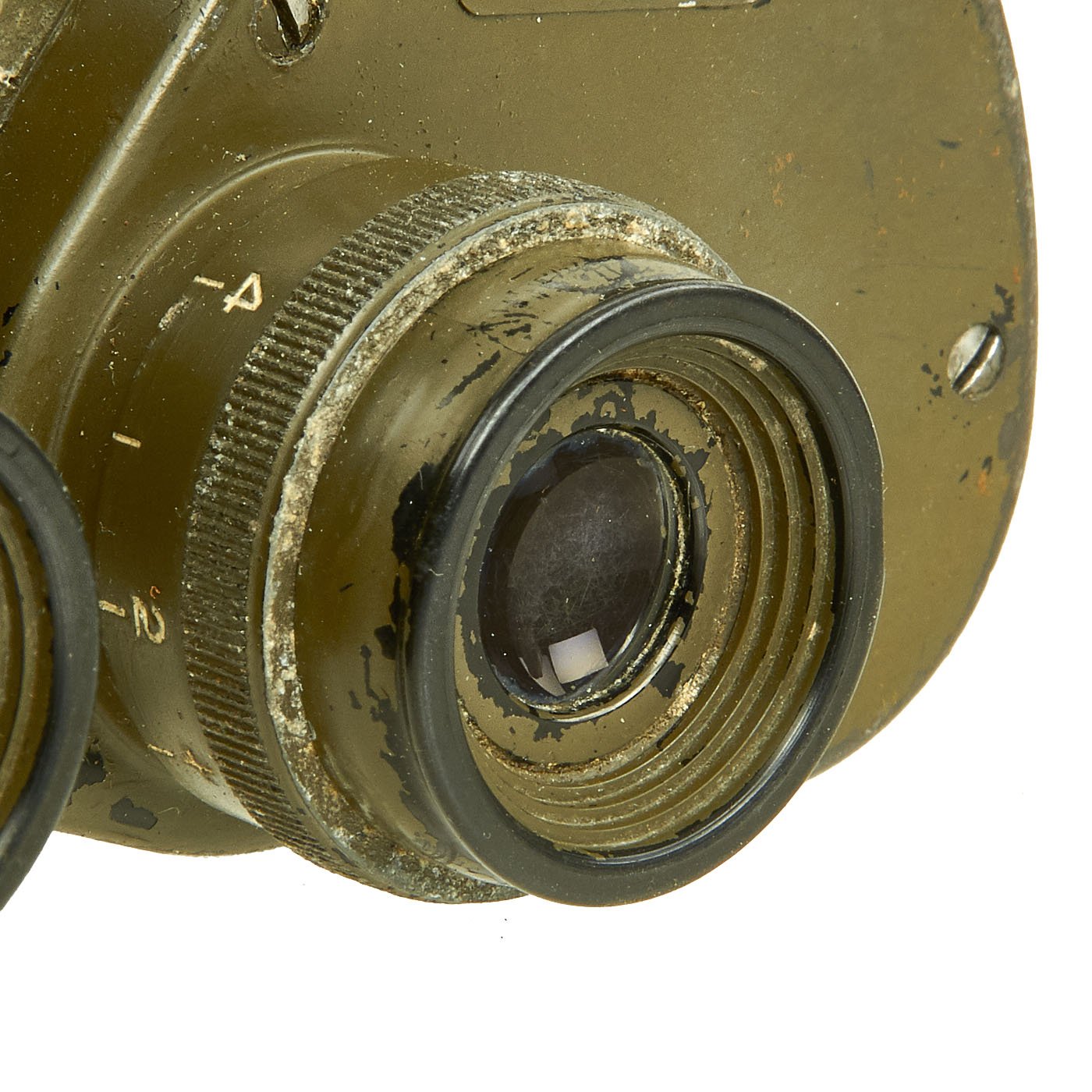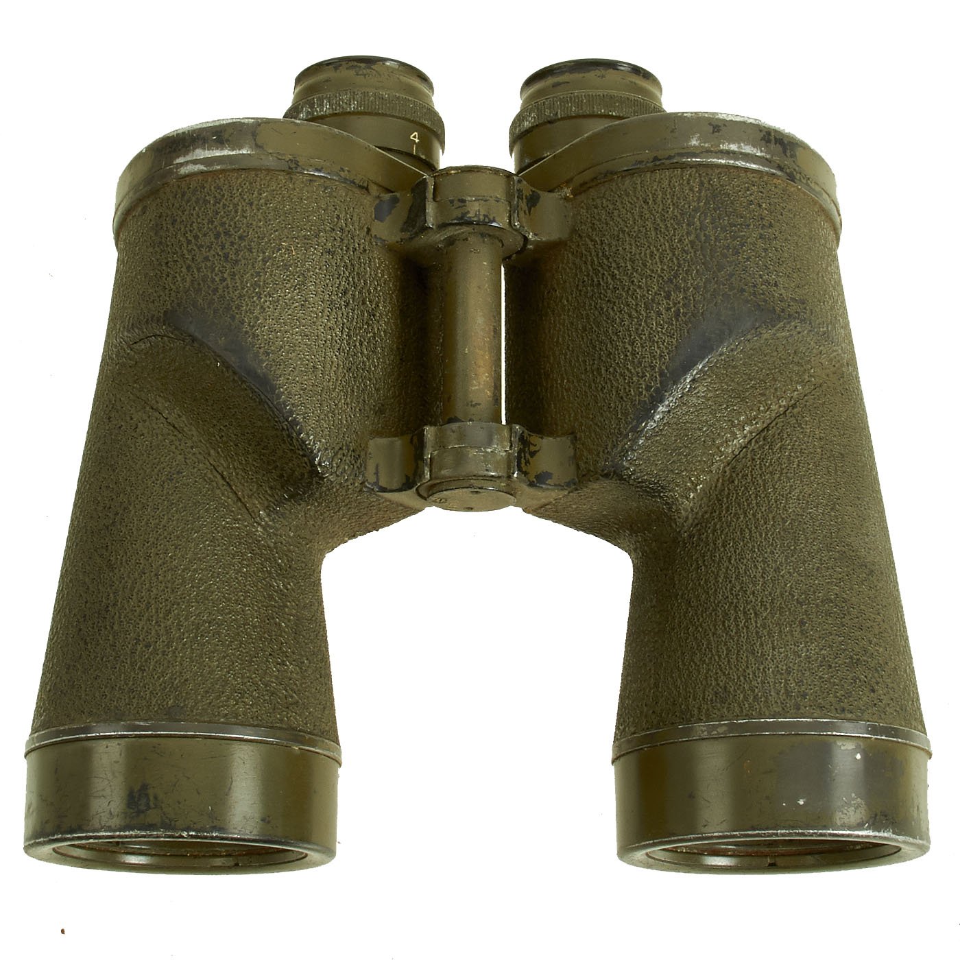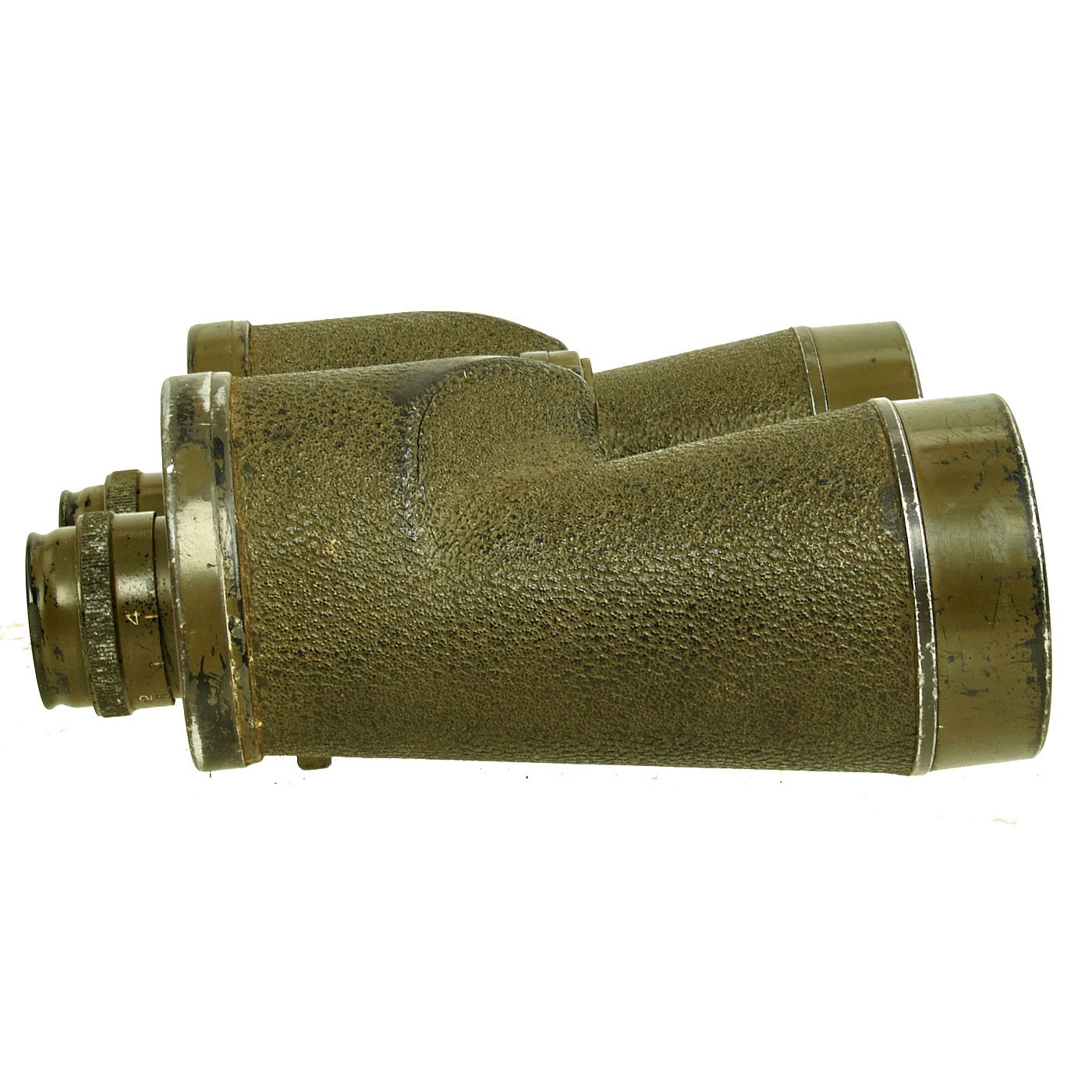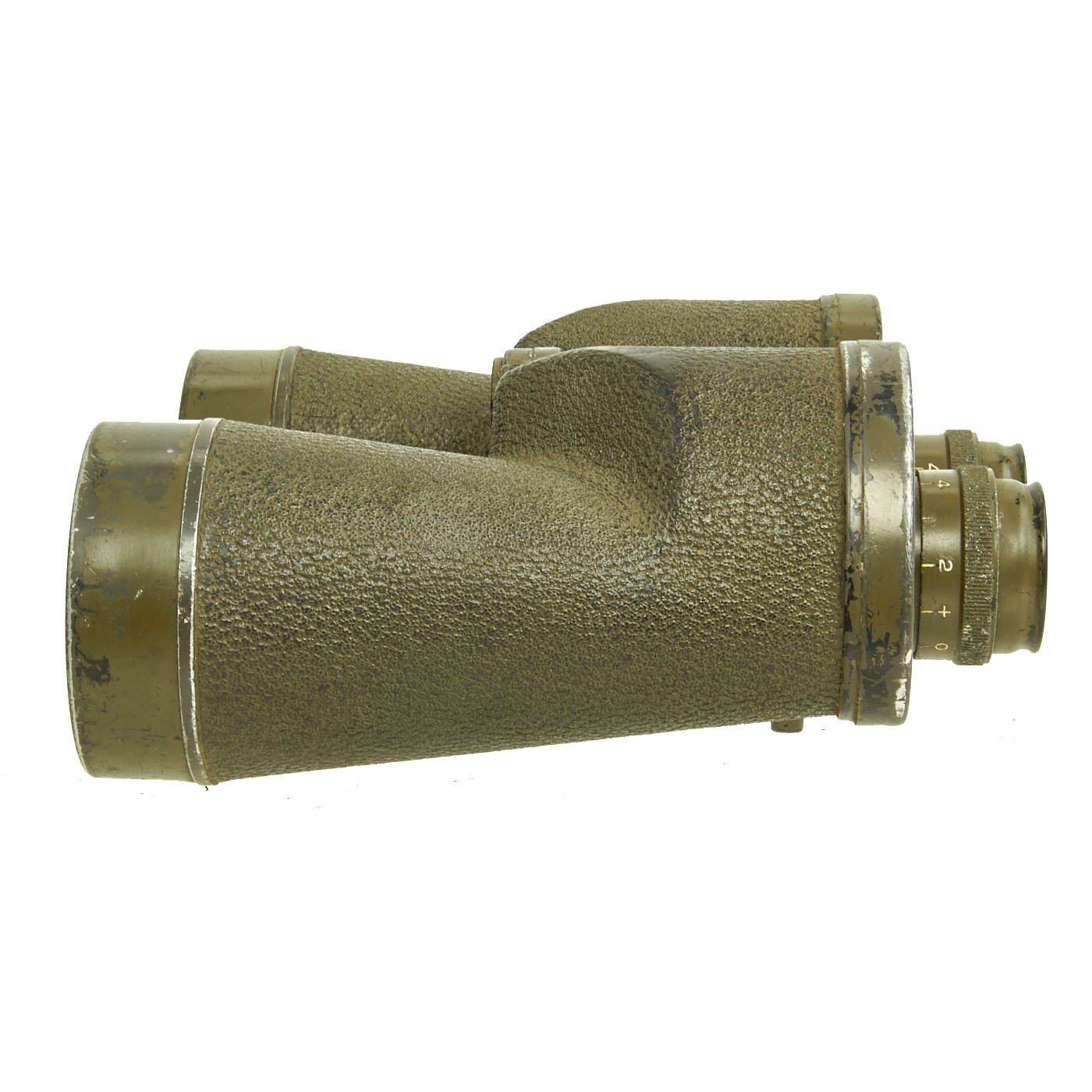 Most likely there was originally a warning about "coated optics" on the left side, which was usually applied as a decal. This set of binoculars definitely has coated optics, but the label is missing, probably due to the binoculars having been repainted OD Green. The binoculars also have serial NO. 5477 on the center hinge pivot. Both diopter adjustments rotate smoothly, though they are a bit easy to move, as the grease on the threads has dried out. Overall condition is very good, with just some dirt and light wear. The optics could also use a good cleaning, and the original neck strap is unfortunately missing, easily replaced.
