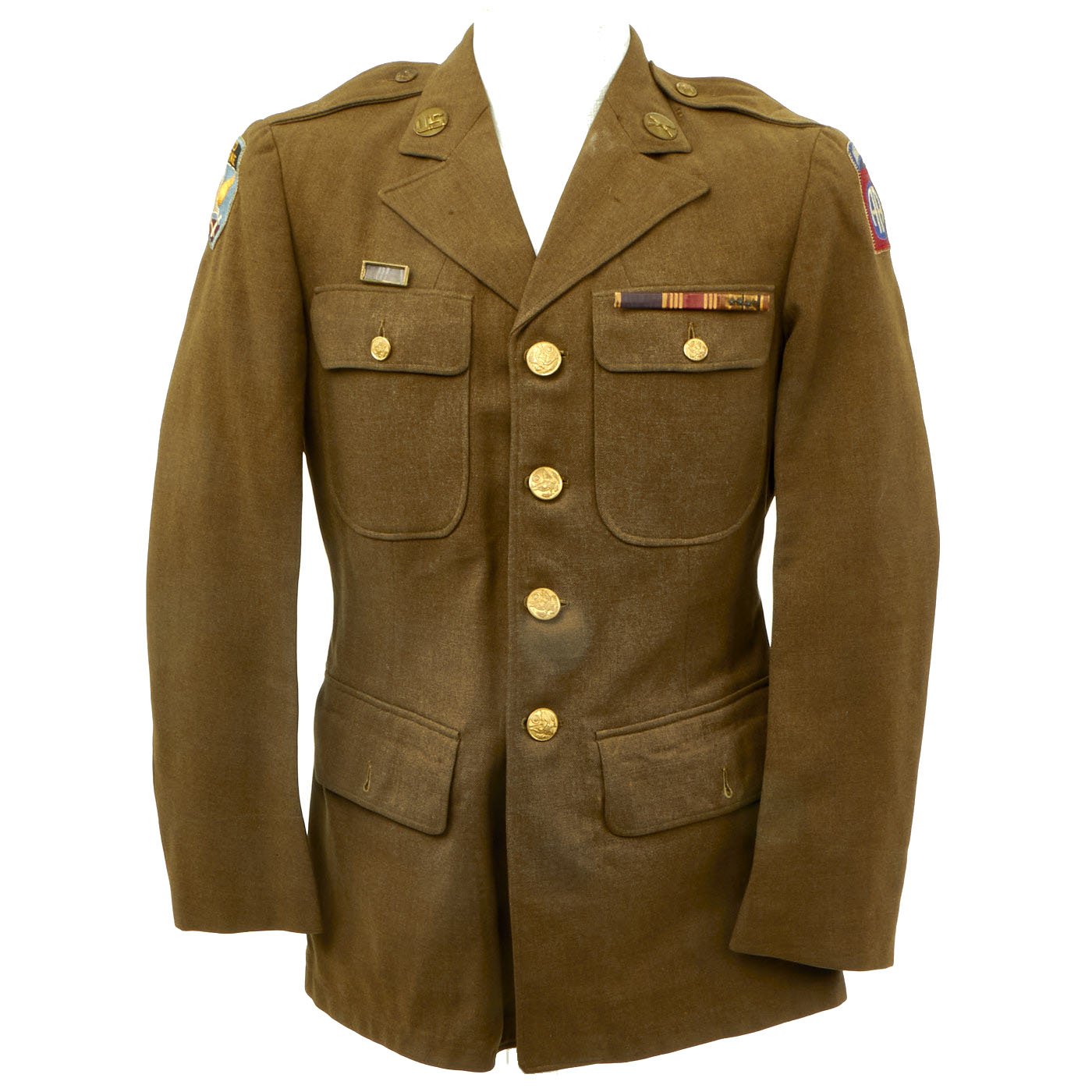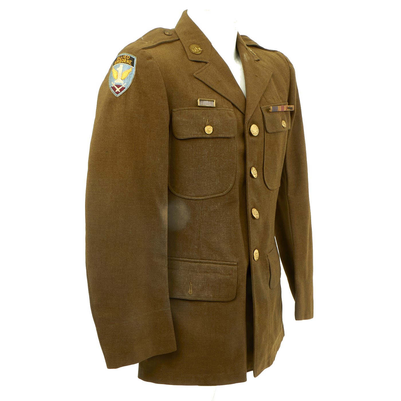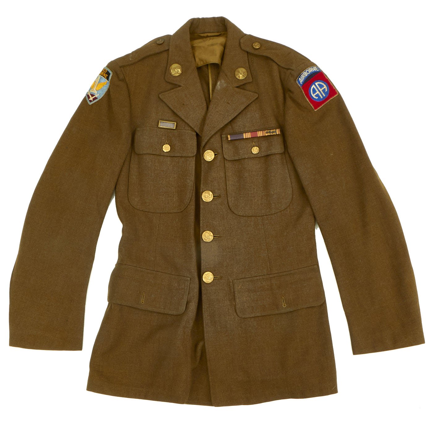 Original Item: Only one available. WWII 82nd Airborne material is some of the hardest and most sought after most collectible items on the market. This excellent condition WW2 Class A Uniform jacket was worn by a member of the 82nd Airborne who participated in one invasion landing and served during three of the 82nd’s campaigns. Offered in every good original condition in size 36R. 82nd Airborne Shoulder Sleeve Insignia on right shoulder, and 1st Allied Airborne Insignia on the left. Both insignias are stitched on the coat with wonderful period hand-applied stitching. Collar insignia are of the earlier screw-back variety. Ribbons (awards) are as follows: