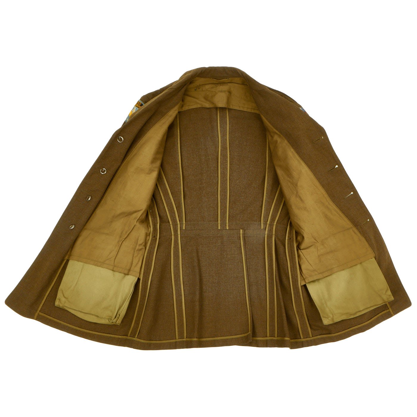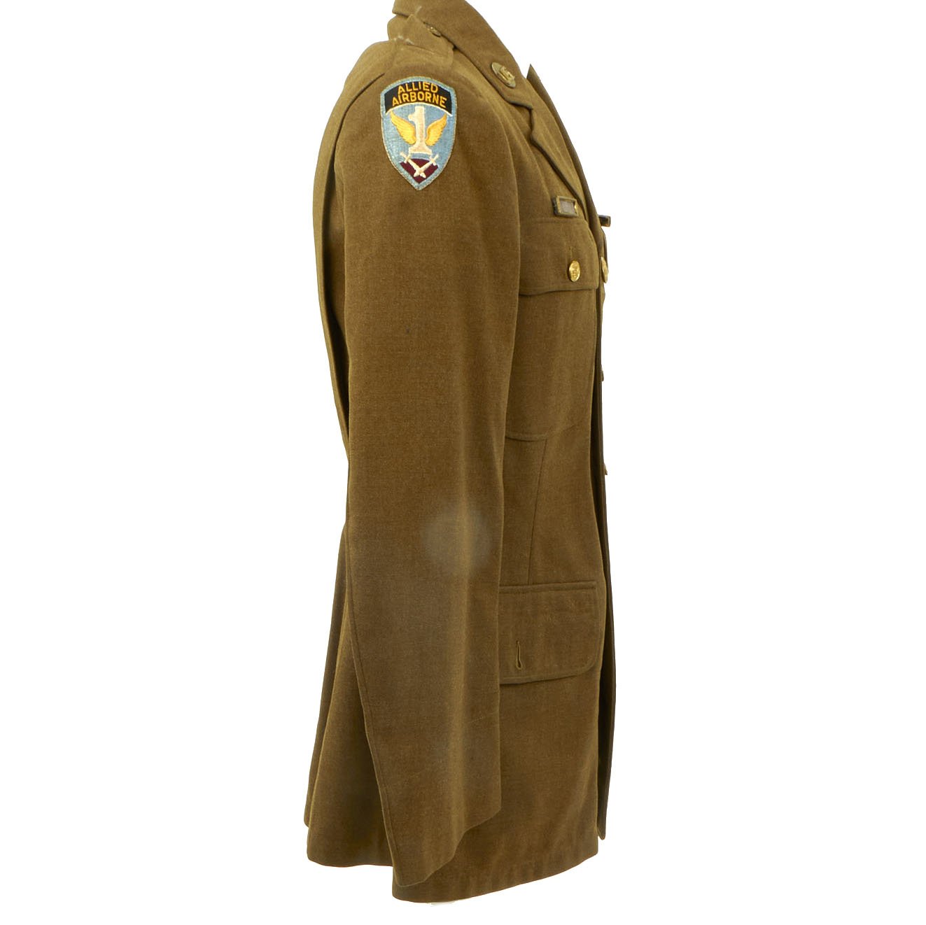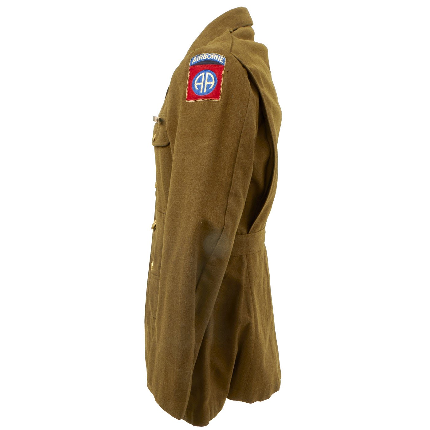 Original Item: Only one available. WWII 82nd Airborne material is some of the hardest and most sought after most collectible items on the market. This excellent condition WW2 Class A Uniform jacket was worn by a member of the 82nd Airborne who participated in one invasion landing and served during three of the 82nd’s campaigns. Offered in every good original condition in size 36R. 82nd Airborne Shoulder Sleeve Insignia on right shoulder, and 1st Allied Airborne Insignia on the left. Both insignias are stitched on the coat with wonderful period hand-applied stitching. Collar insignia are of the earlier screw-back variety. Ribbons (awards) are as follows: