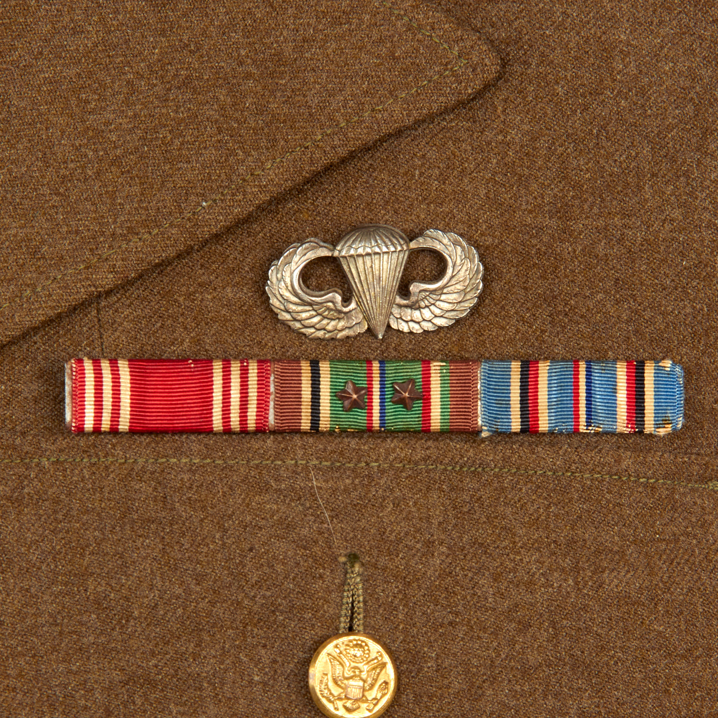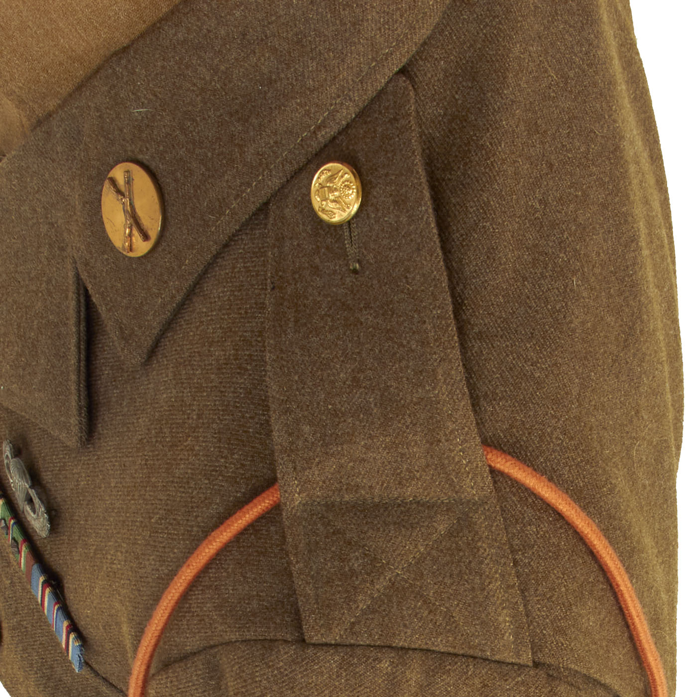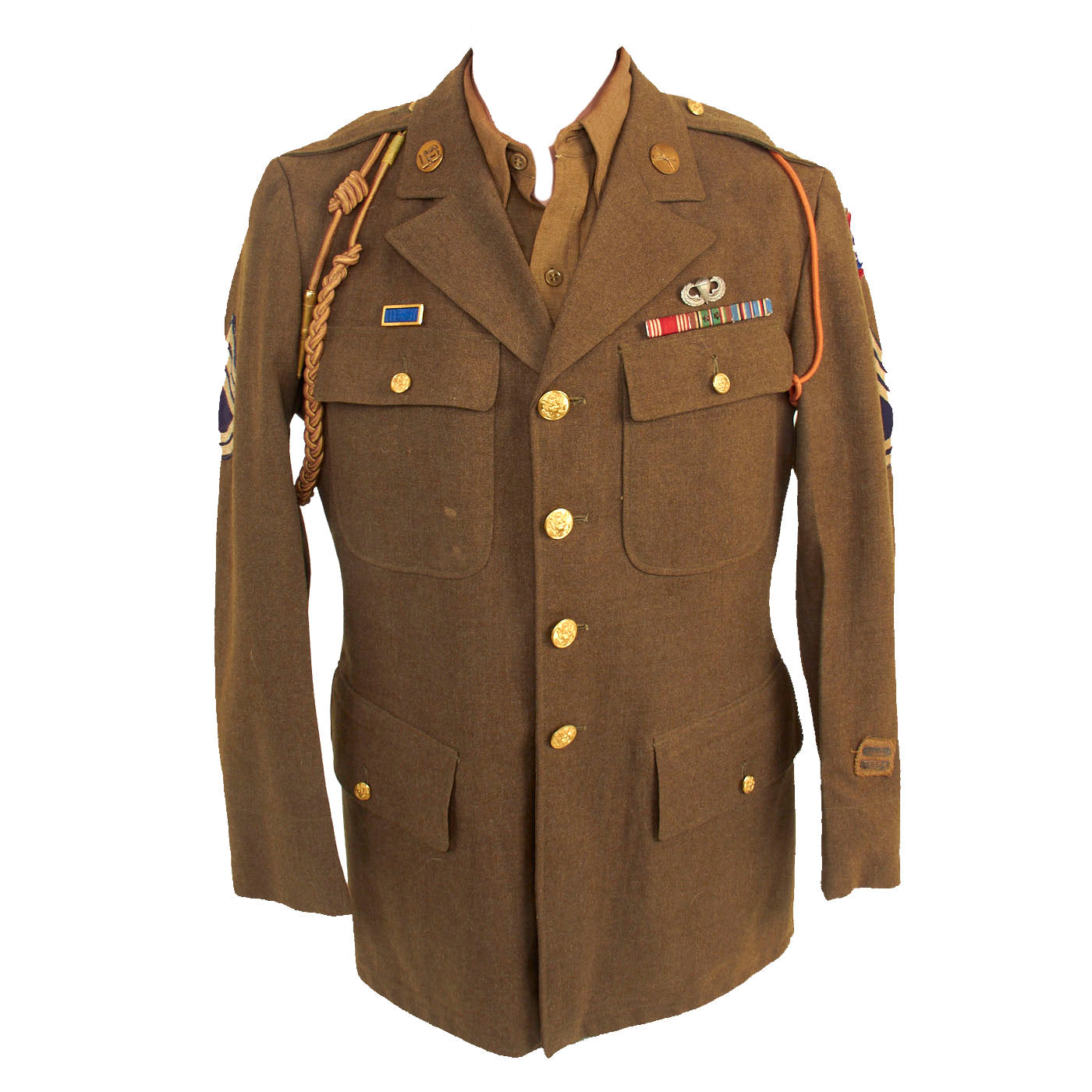 The uniform coat is in wonderful condition and features correct, period applied insignia. The insignia present is a lovely set of jump wings without oval, the ribbons are a Good Conduct, EAME with 2 stars, American Campaign and the Presidential Unit Citation. The left shoulder has the Netherlands Order of William Orange Lanyard, which was awarded to Allied personnel for Operation Market Garden and the liberation of Holland. The right shoulder features a faded French Fourragere, awarded for actions during the Normandy Invasion.