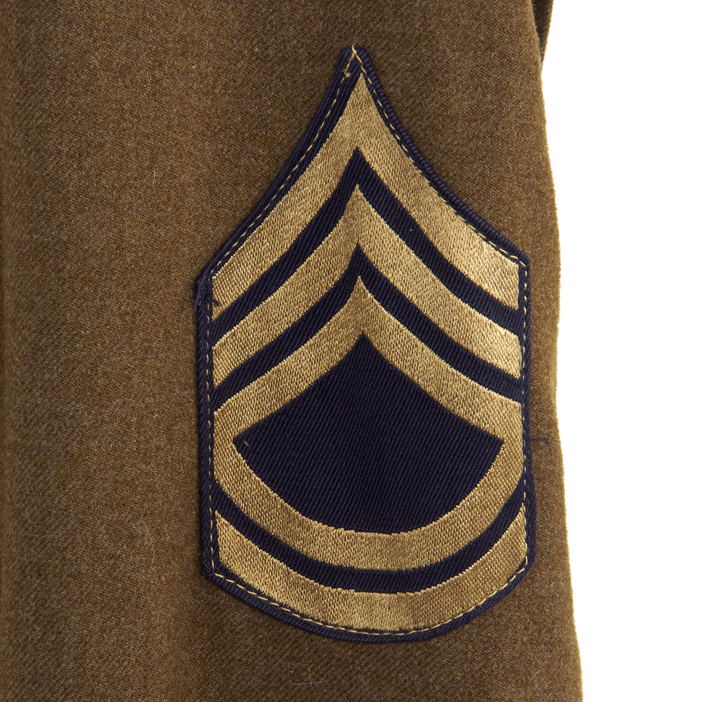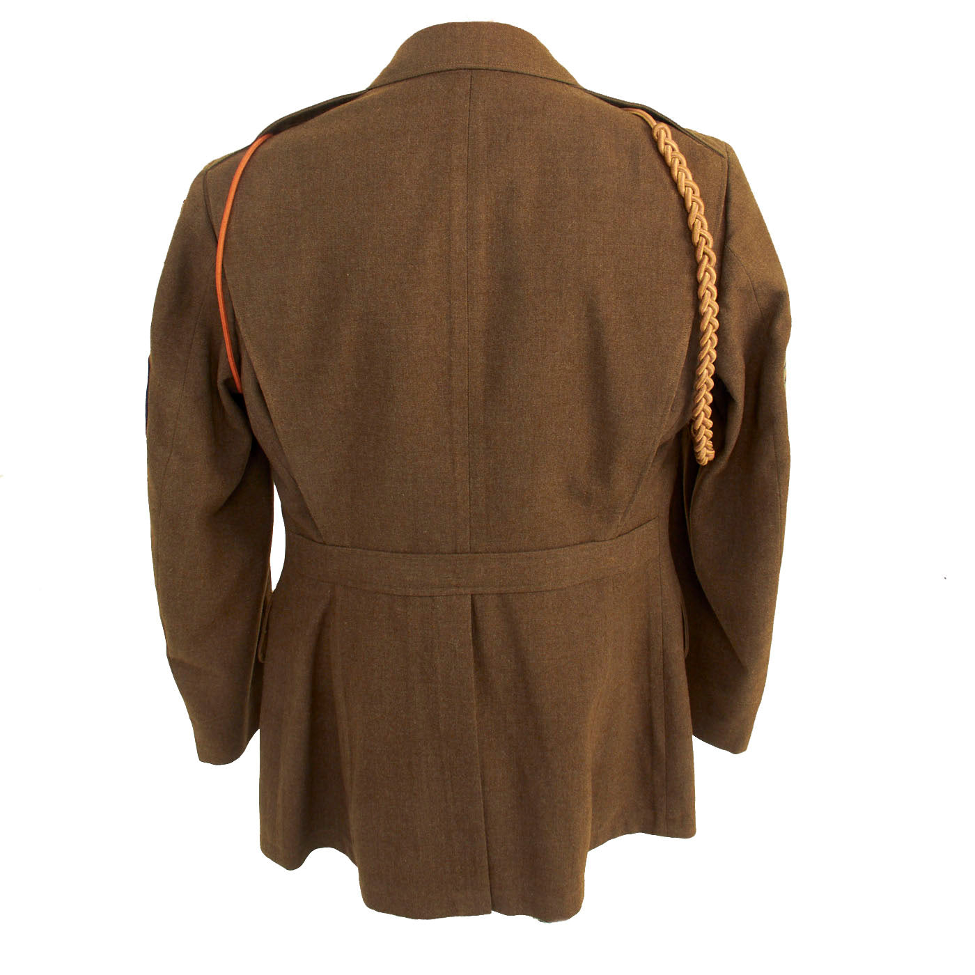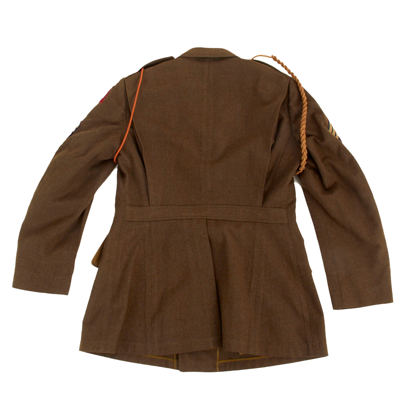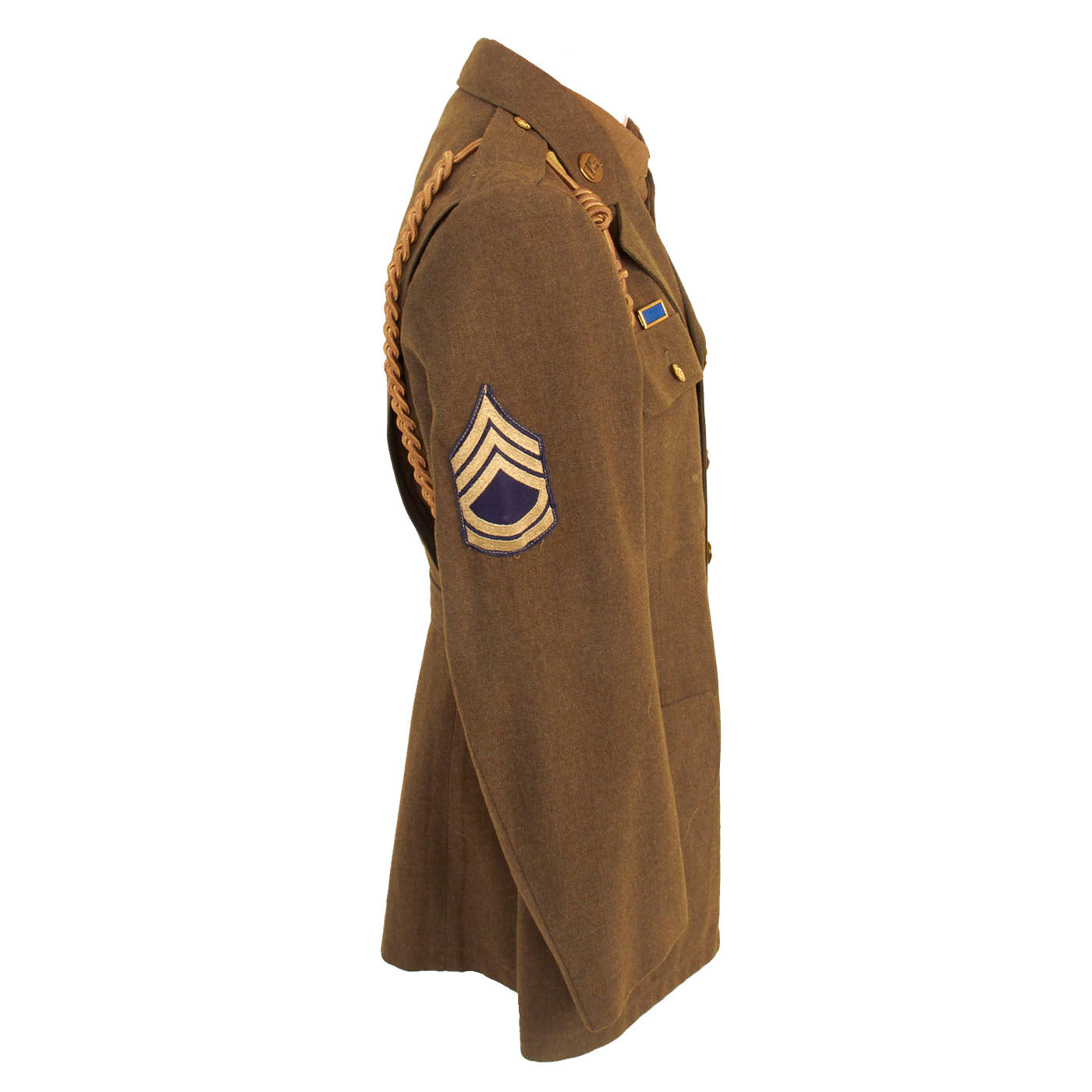 The enlisted men's winter service uniform in 1941 consisted of a wool serge four-button coat with four pockets in olive drab shade no. 33 (OD 33), wool trousers, and a long-sleeved wool shirt, both in olive drab shade 32 (OD 32). Only the uniform coat and wool/flannel shirt is present. A russet brown leather belt with a brass buckle was worn with the coat until 1941, when it was dropped as a leather conservation measure, with the belt hooks on the coat being eliminated as well, just like this example.