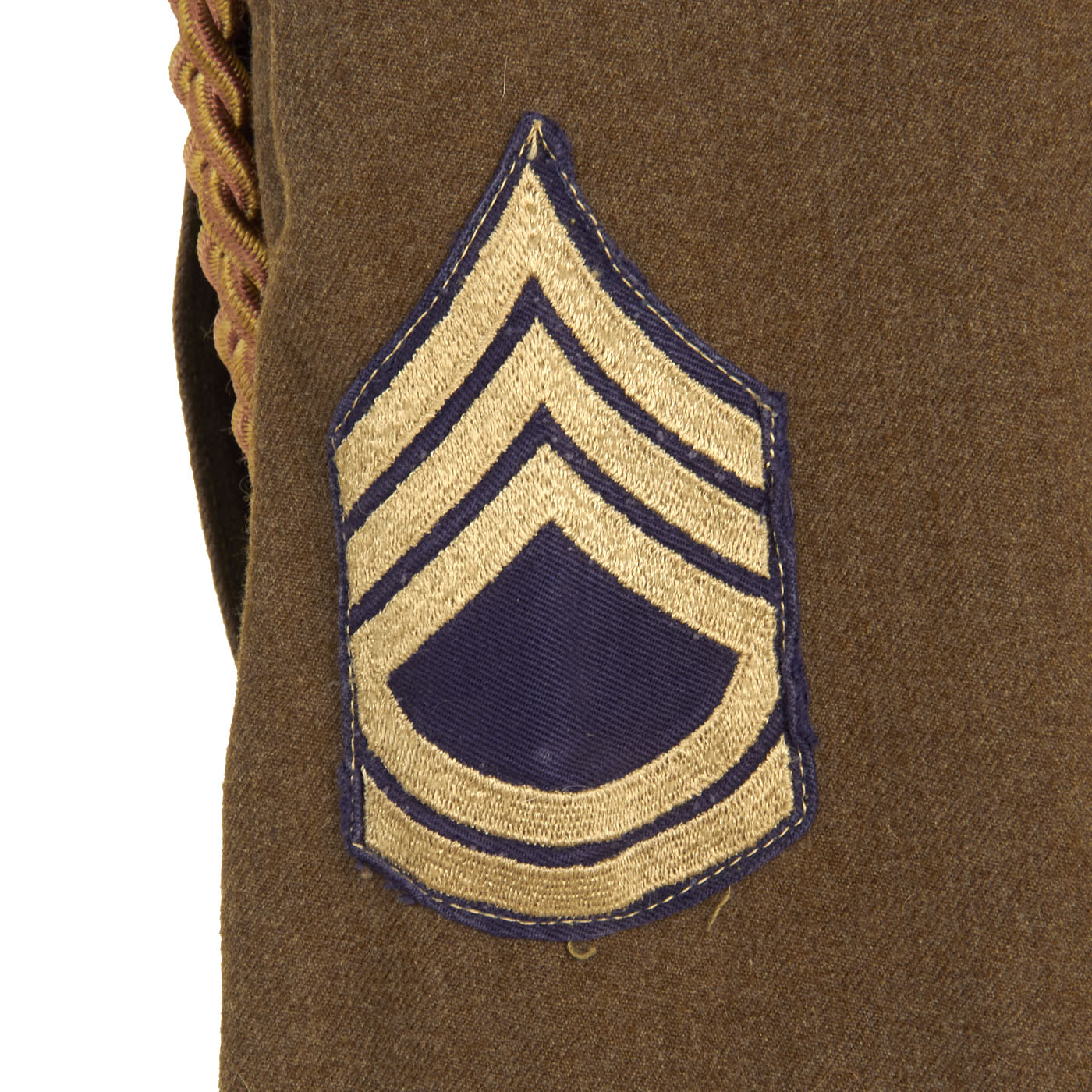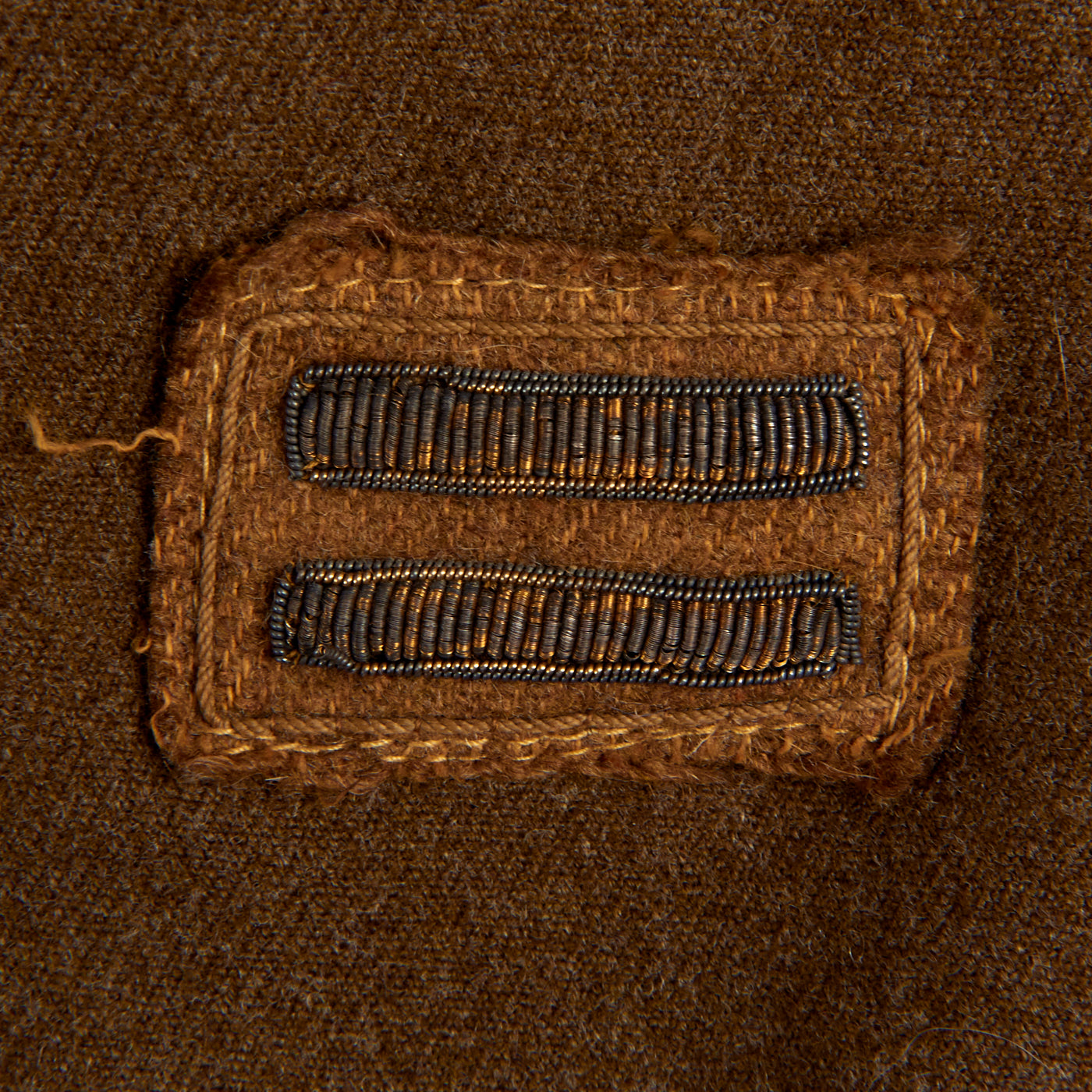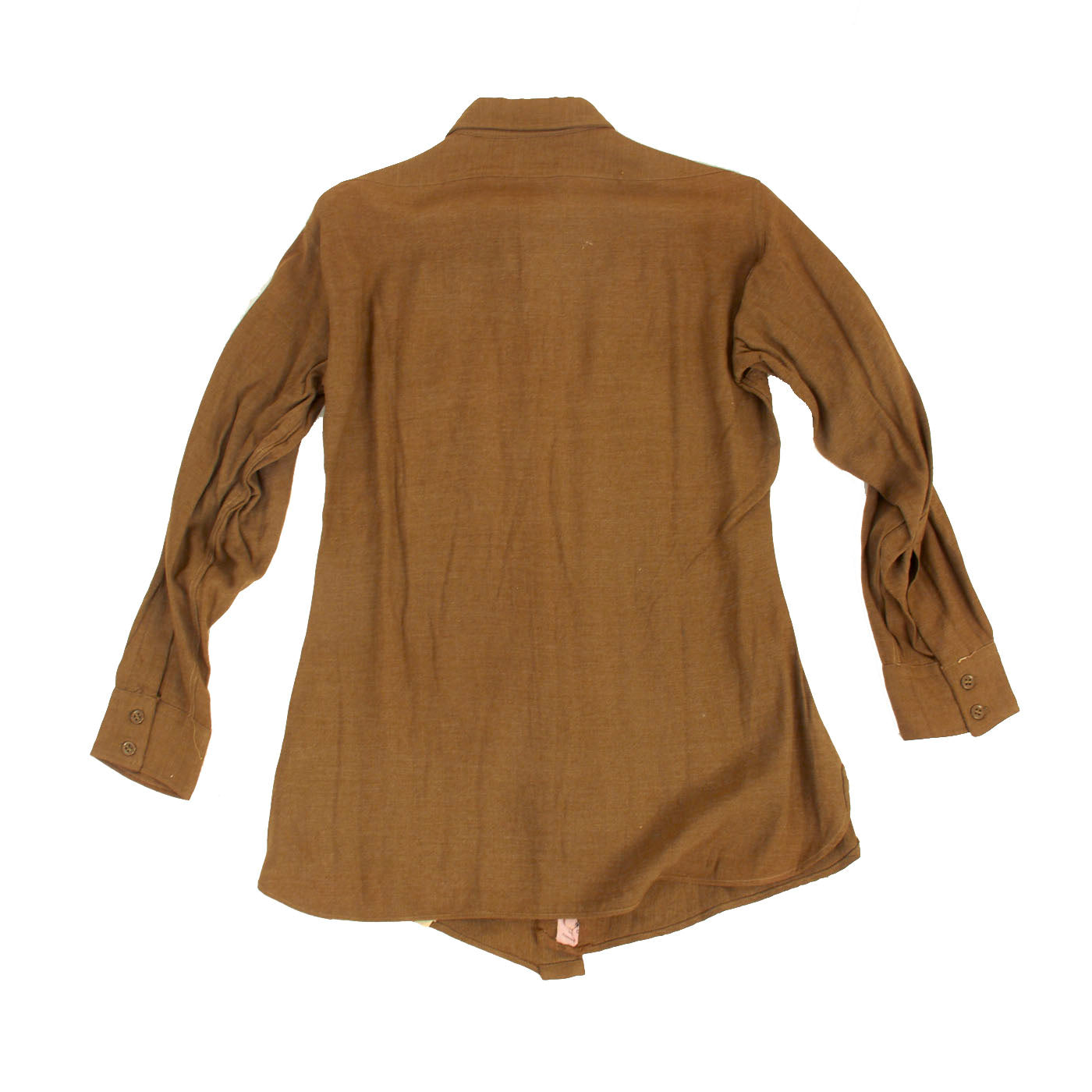 The enlisted men's winter service uniform in 1941 consisted of a wool serge four-button coat with four pockets in olive drab shade no. 33 (OD 33), wool trousers, and a long-sleeved wool shirt, both in olive drab shade 32 (OD 32). Only the uniform coat and wool/flannel shirt is present. A russet brown leather belt with a brass buckle was worn with the coat until 1941, when it was dropped as a leather conservation measure, with the belt hooks on the coat being eliminated as well, just like this example.