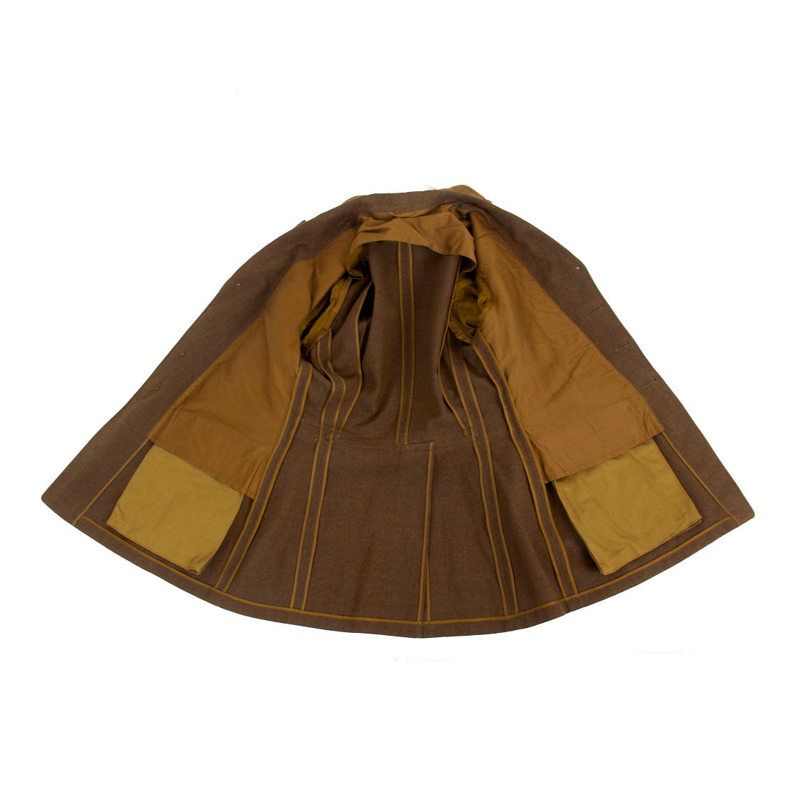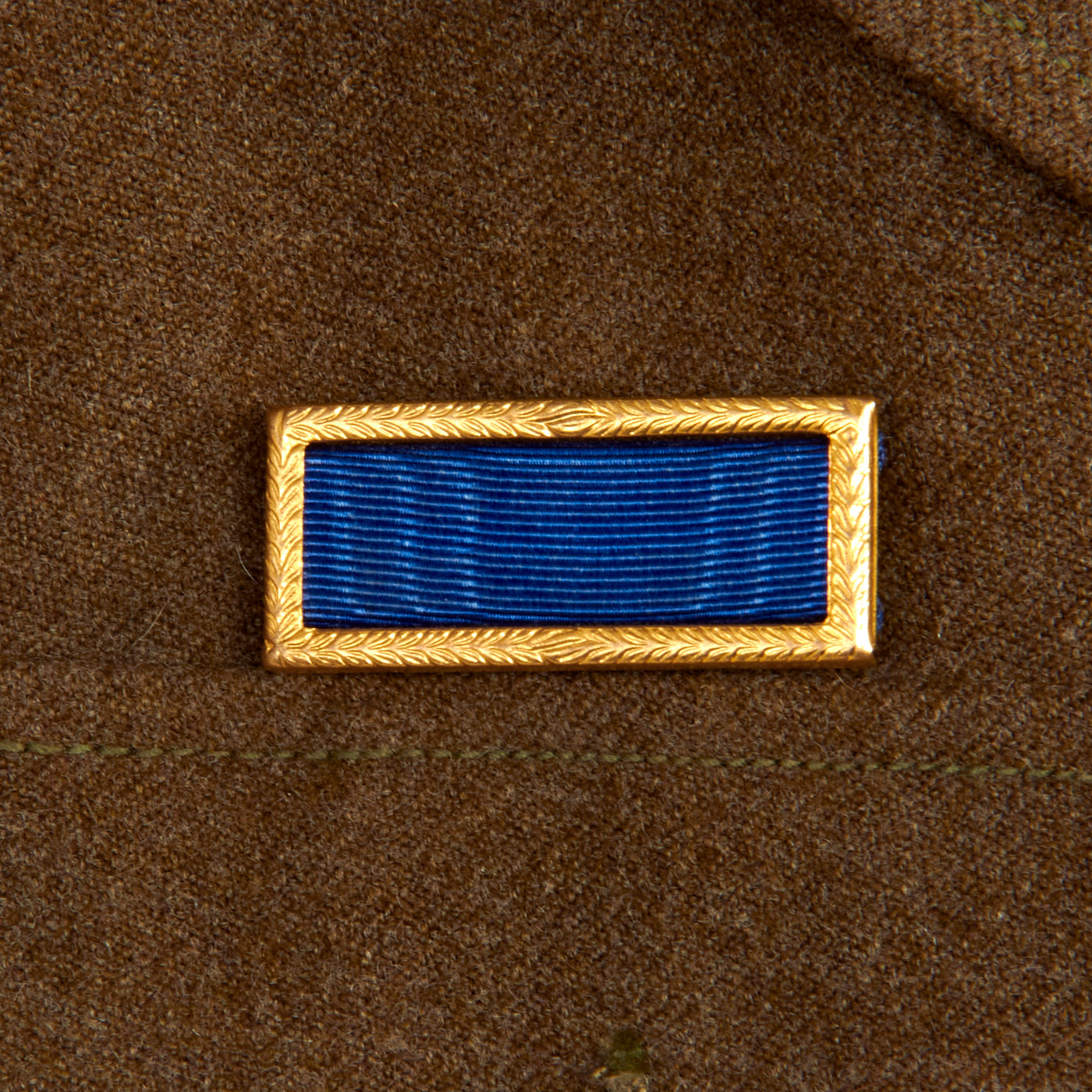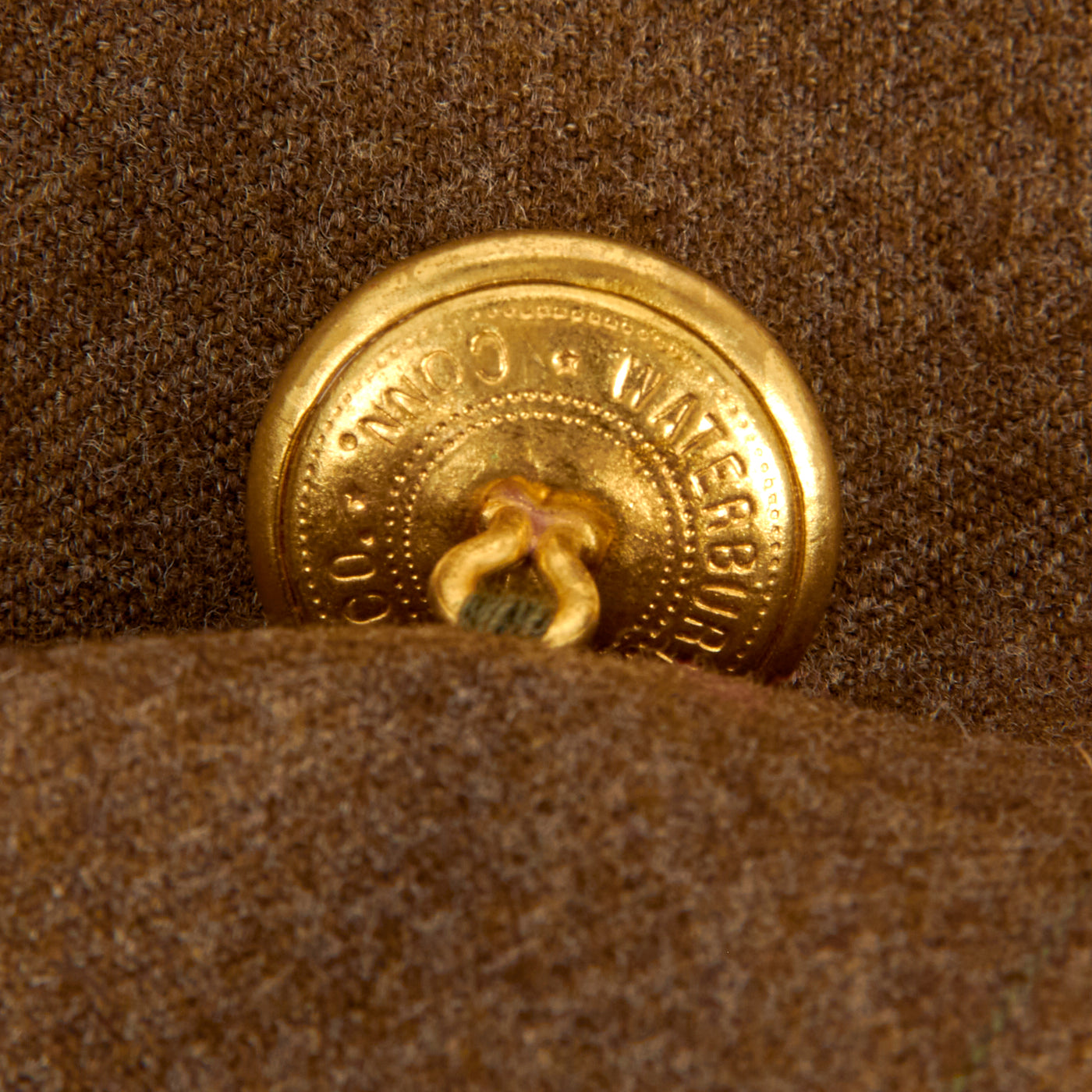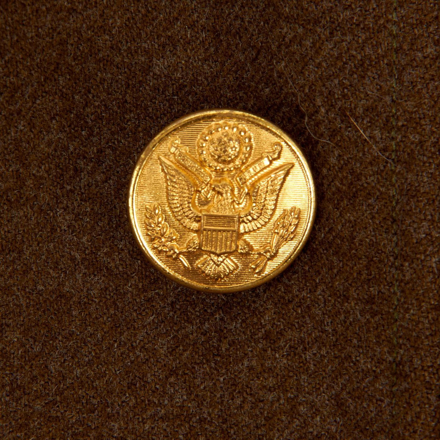 The enlisted men's winter service uniform in 1941 consisted of a wool serge four-button coat with four pockets in olive drab shade no. 33 (OD 33), wool trousers, and a long-sleeved wool shirt, both in olive drab shade 32 (OD 32). Only the uniform coat and wool/flannel shirt is present. A russet brown leather belt with a brass buckle was worn with the coat until 1941, when it was dropped as a leather conservation measure, with the belt hooks on the coat being eliminated as well, just like this example.