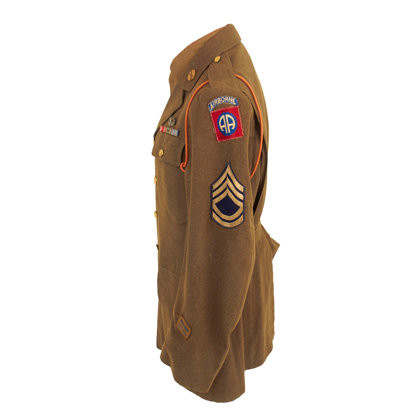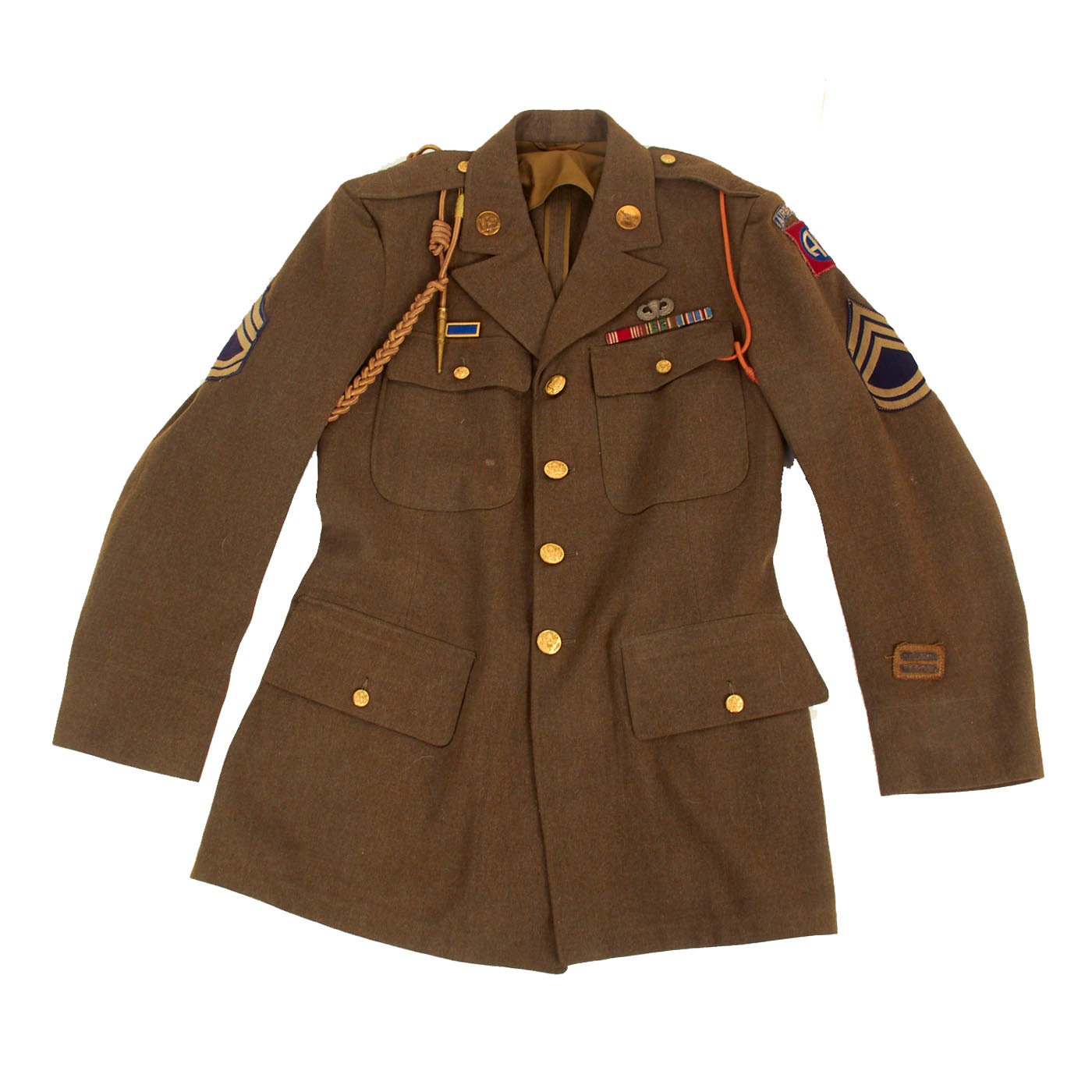 Original Item: Only one available. WWII 82nd Airborne material is some of the hardest and most sought after most collectible items on the market. This excellent condition WW2 Class A Uniform jacket was worn by a member of the 82nd Airborne who we know at least participated in Operation Market Garden due to the “Orange Lanyard” present on the left shoulder. Offered in very good condition in size 40R. 82nd Airborne Shoulder Sleeve Insignia on the left shoulder, and matching 82nd patch on the left shoulder of the M37 shirt. Both insignias are stitched on the coat with wonderful period hand-applied stitching. Collar insignia are of the earlier screw-back variety.