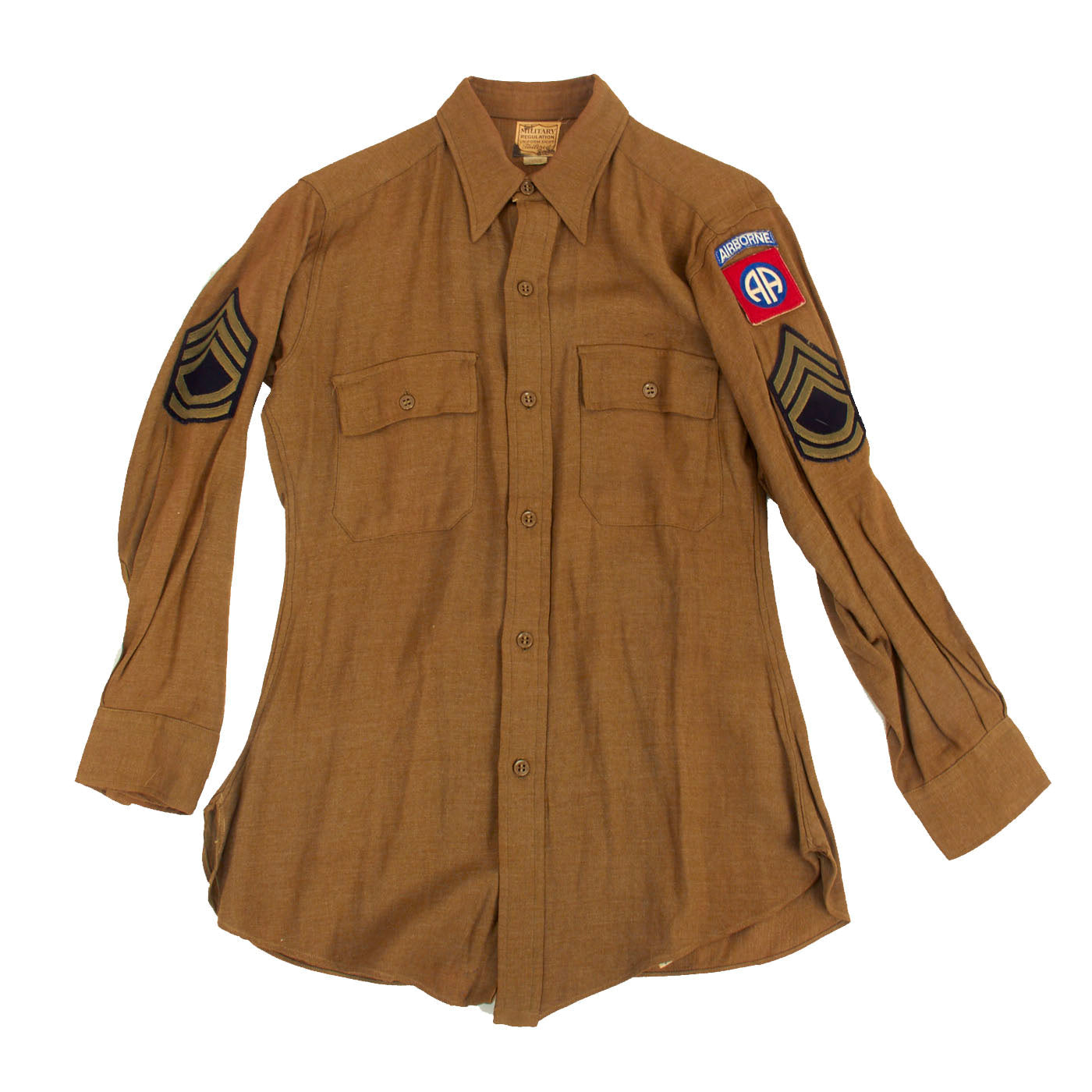 The M37 Wool Flannel dress shirt is in wonderful condition. There appears to be a laundry number present on the tag and appears to be CF8030. We did a quick search and the results were under 100, making for a wonderful research opportunity. The 82nd Airborne Division insignia on the left shoulder is in wonderful condition as are the Sergeant First Class chevrons.