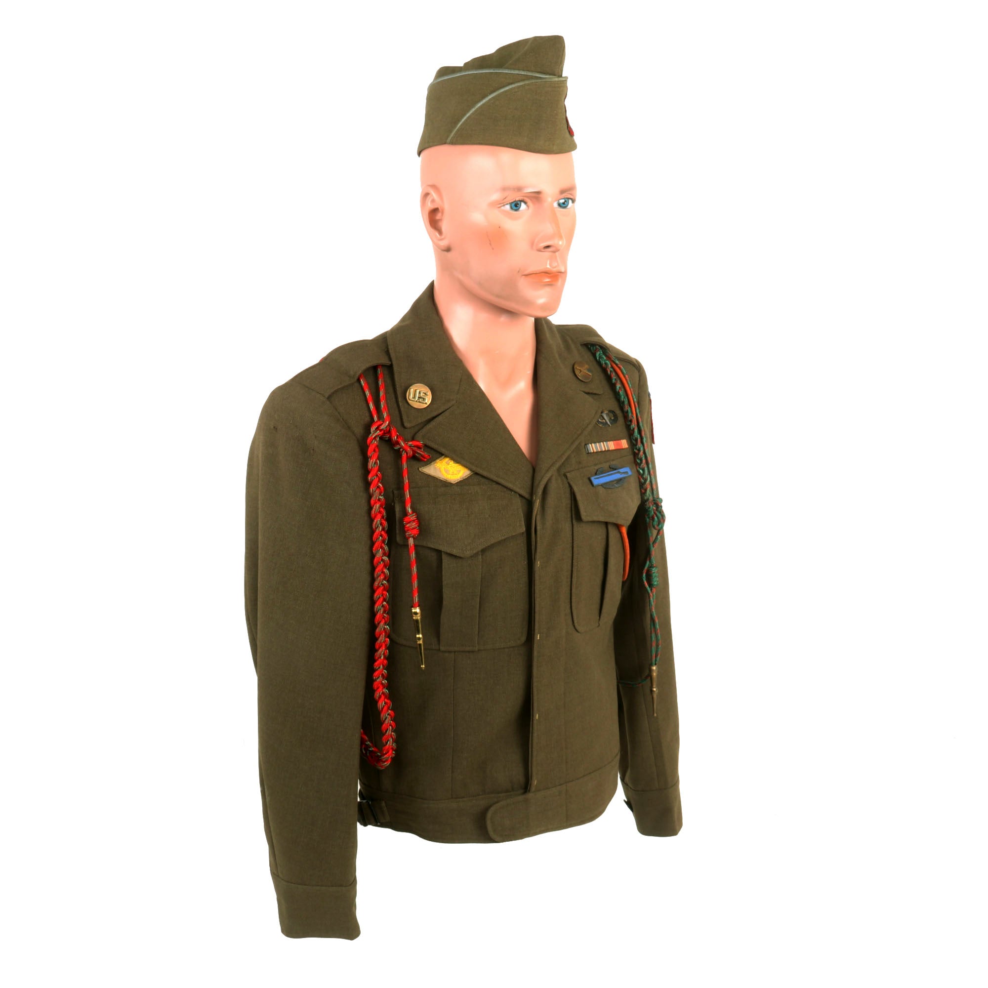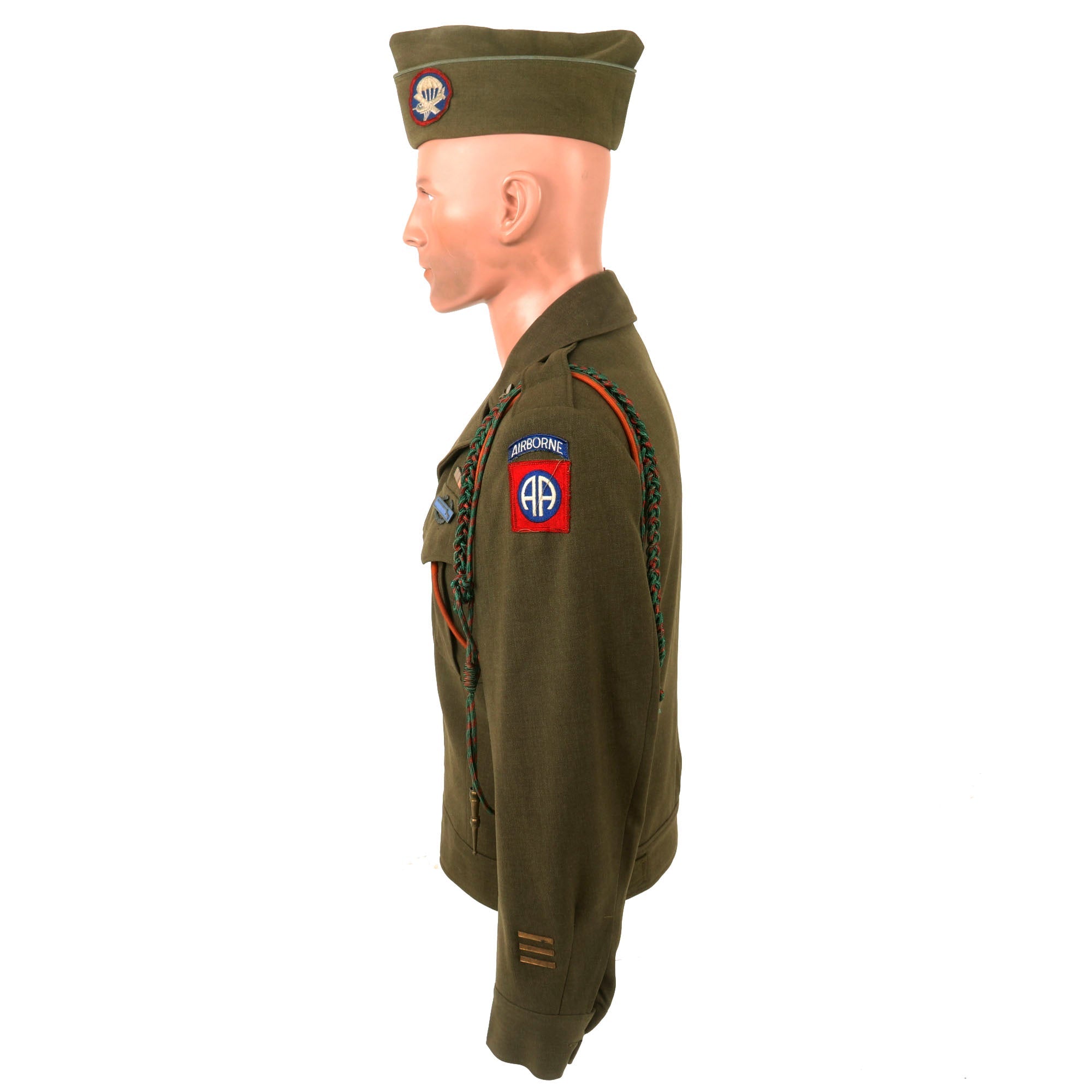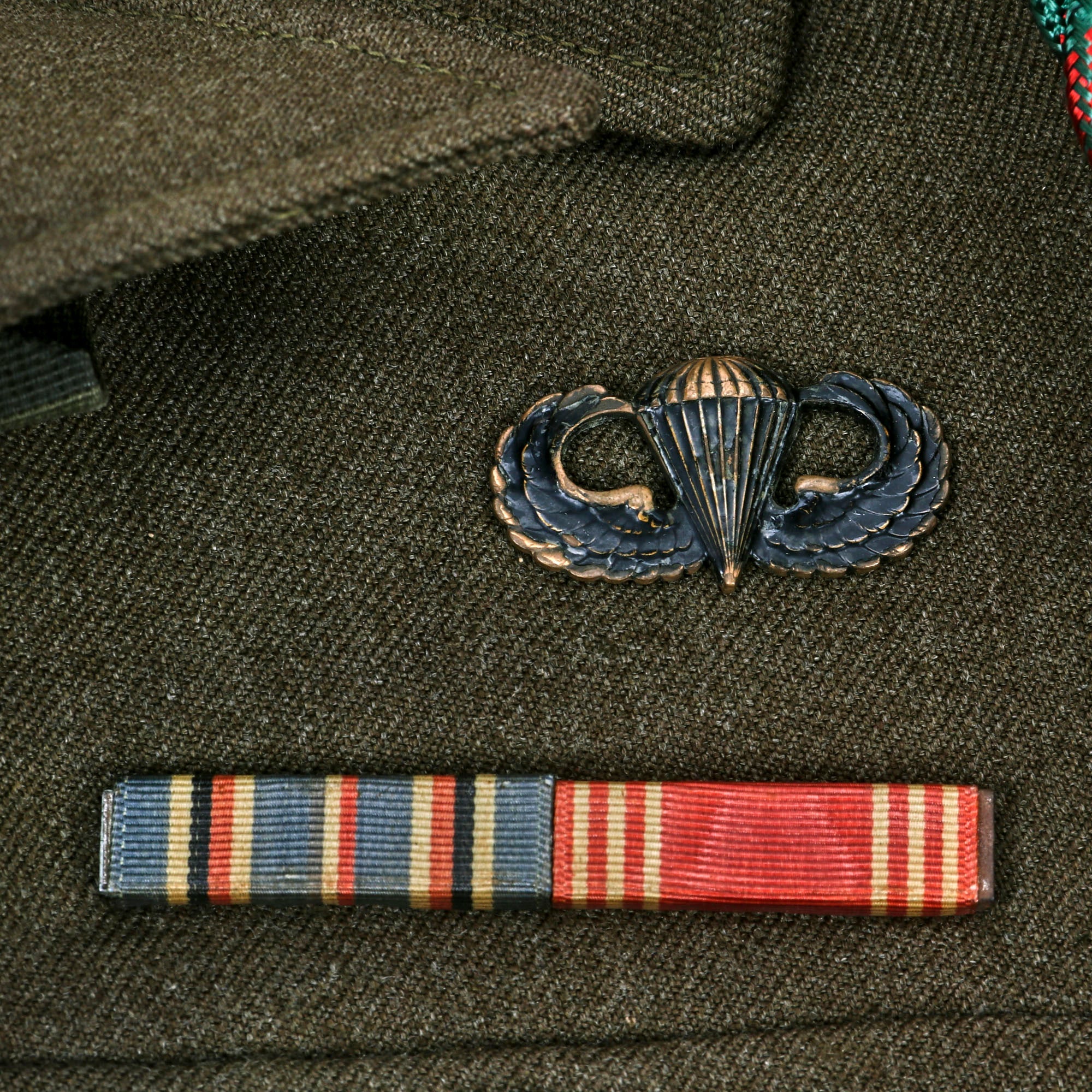 The Ike jacket is in beautiful condition and the neck has a clear 34R tag. The front features a beautiful set of blackened paratrooper wings. The left shoulder features an 82 Airborne patch with down on the lower sleeve are 3 Overseas Bars denoting 18 months spent overseas. The "Belgian Fourragère 1940"- composed of one round smooth cord, partially braided, and of TWO other cords, of which one is terminated by a knot and a brass ferret - it is made of wool and cotton for NCOs and EM, and of silk for Officers - all threads are tinted in colors resembling the ribbon of the Belgian Croix de Guerre 1940 (i.e. basic red, dotted with green threads) - the Fourragère encircles the right shoulder and passes under the armpit, and is fixed by 2 tiny loops onto the button of the shoulder loop. "Order of the Orange" shoulder cord on the left shoulder was awarded by the Dutch government for surviving Operation Market Garden. Also present on the left shoulder is the French Fourragère.