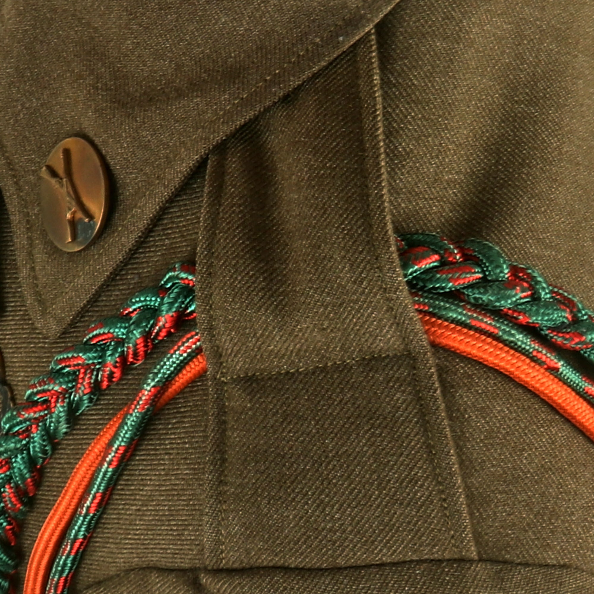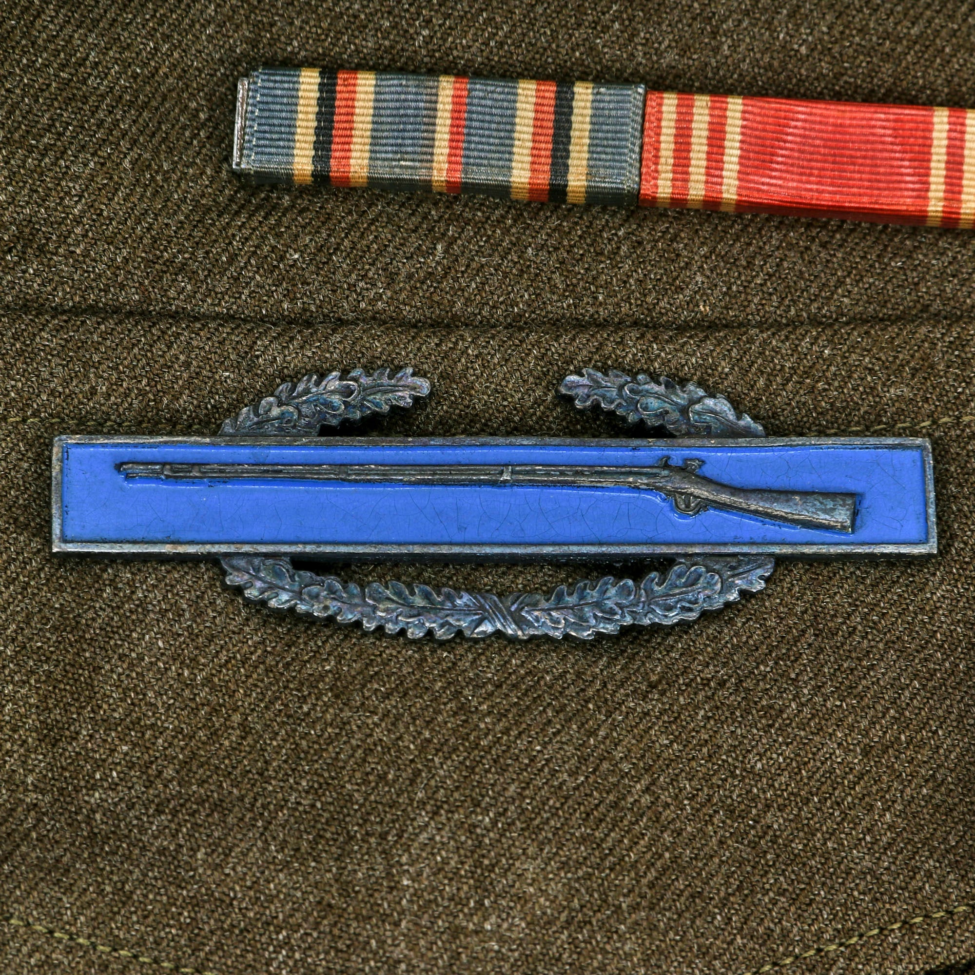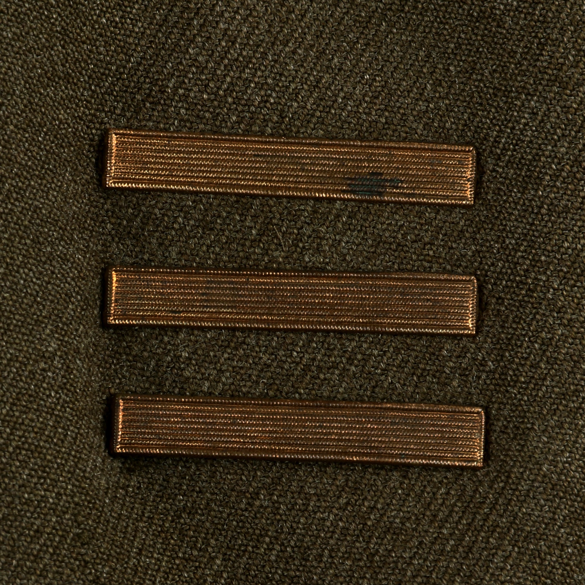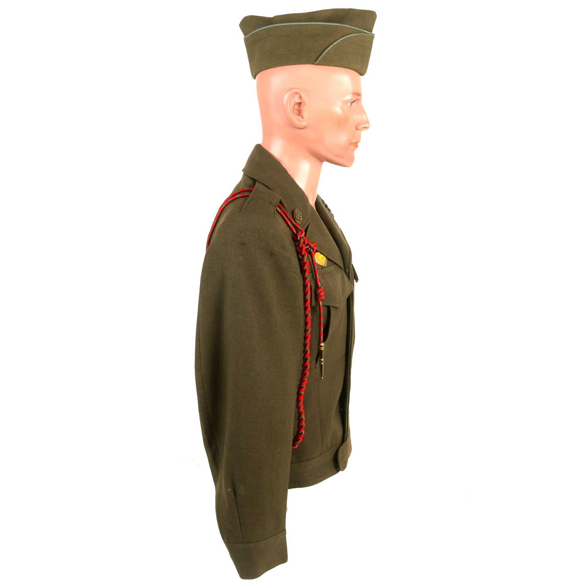 The Ike jacket is in beautiful condition and the neck has a clear 34R tag. The front features a beautiful set of blackened paratrooper wings. The left shoulder features an 82 Airborne patch with down on the lower sleeve are 3 Overseas Bars denoting 18 months spent overseas. The "Belgian Fourragère 1940"- composed of one round smooth cord, partially braided, and of TWO other cords, of which one is terminated by a knot and a brass ferret - it is made of wool and cotton for NCOs and EM, and of silk for Officers - all threads are tinted in colors resembling the ribbon of the Belgian Croix de Guerre 1940 (i.e. basic red, dotted with green threads) - the Fourragère encircles the right shoulder and passes under the armpit, and is fixed by 2 tiny loops onto the button of the shoulder loop. "Order of the Orange" shoulder cord on the left shoulder was awarded by the Dutch government for surviving Operation Market Garden. Also present on the left shoulder is the French Fourragère.