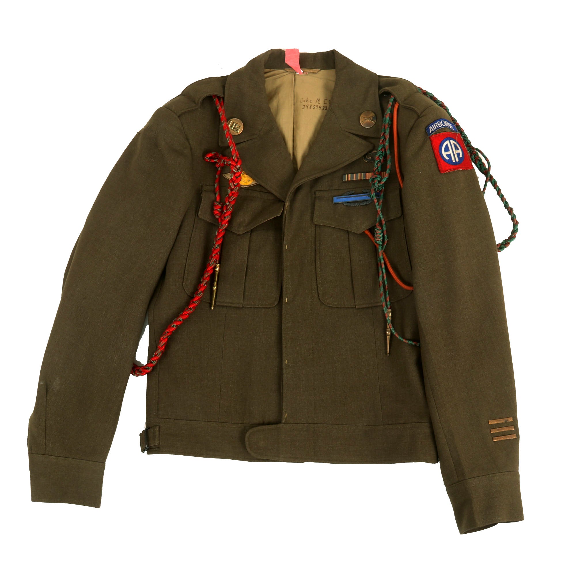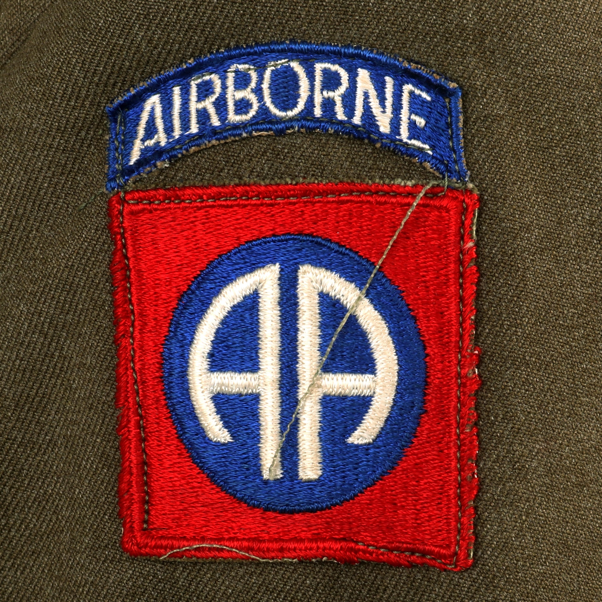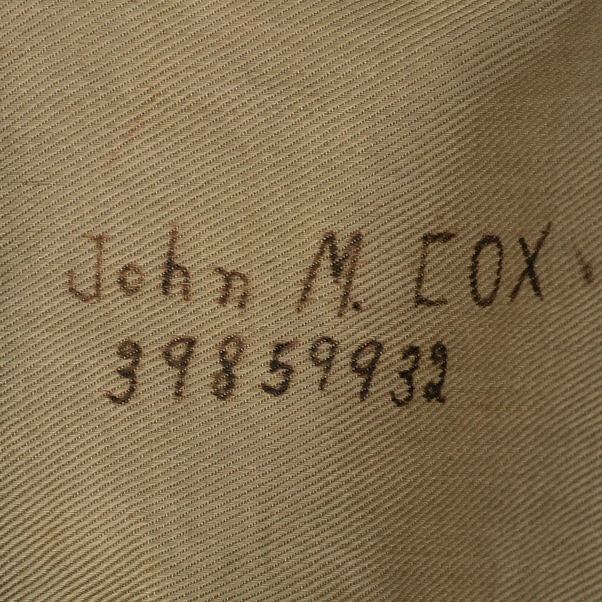 Other items in this lot are (1) overseas cap and a small PARATROOPS US ARMY plaque. The jacket is named on the back lining to JOHN M. COX / 39859932. While we were unable to find his detailed service, we were able to confirm him on the 505th Parachute Infantry Regiment, Regimental Headquarters Company and the link can be found here.