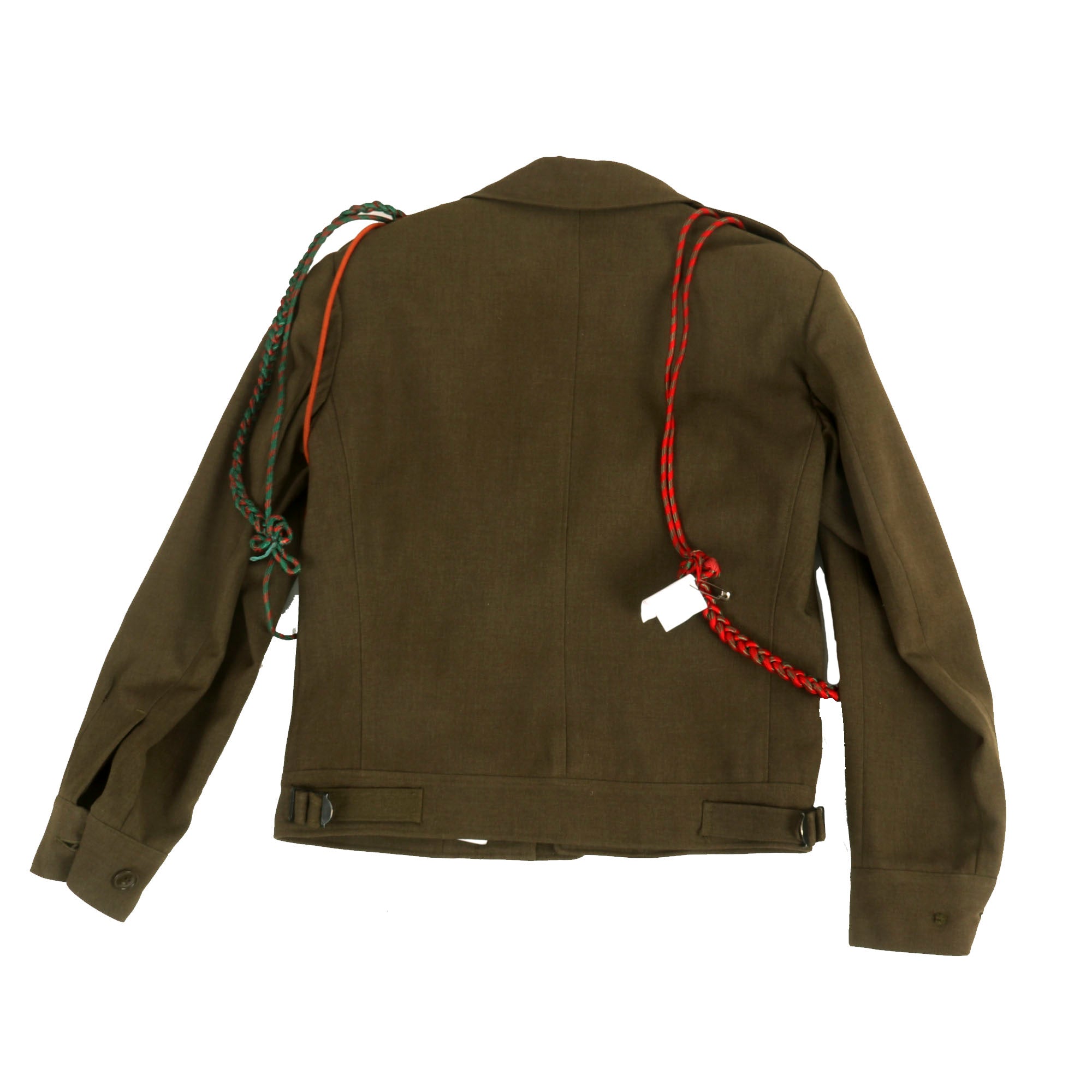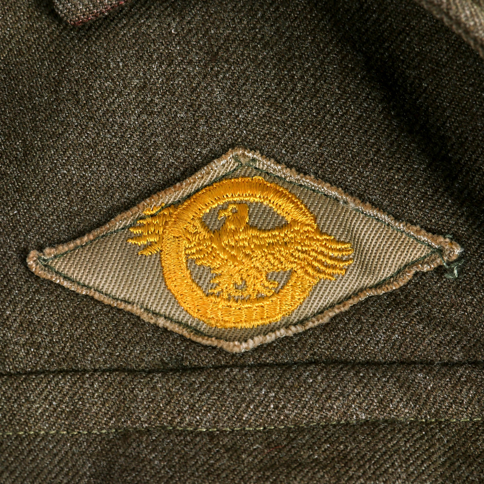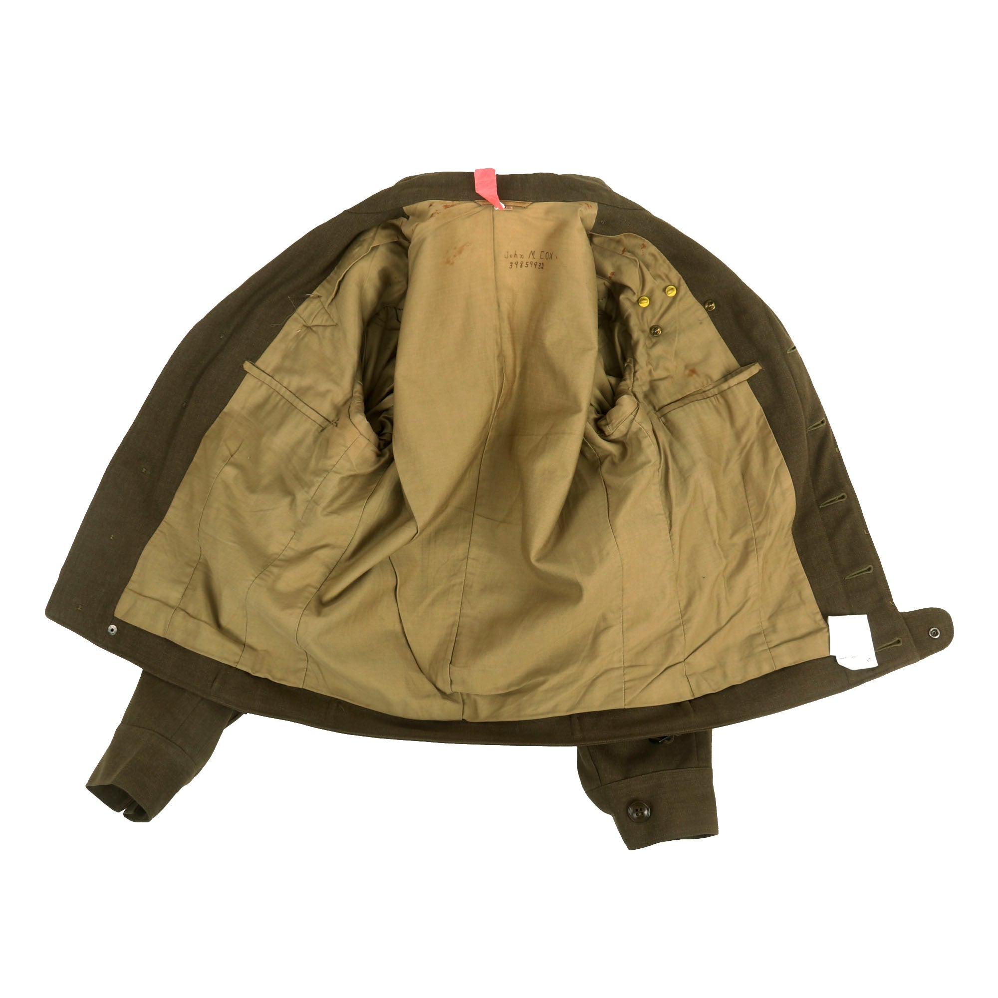 Original Items: Only One Lot Available. The Eisenhower jacket or "Ike" jacket, officially known as the Jacket, Field, Wool, Olive Drab, is a type of waist-length jacket developed for the U.S. Army during the later stages of World War II and named after Dwight D. Eisenhower. Intended to be worn on its own or as an insulating layer beneath the M-1943 Field Jacket and over the standard wool flannel shirt and wool sweater, it featured a pleated back, adjustable waist band, fly-front buttons, bellows chest pockets, slash side pockets, and shoulder straps.