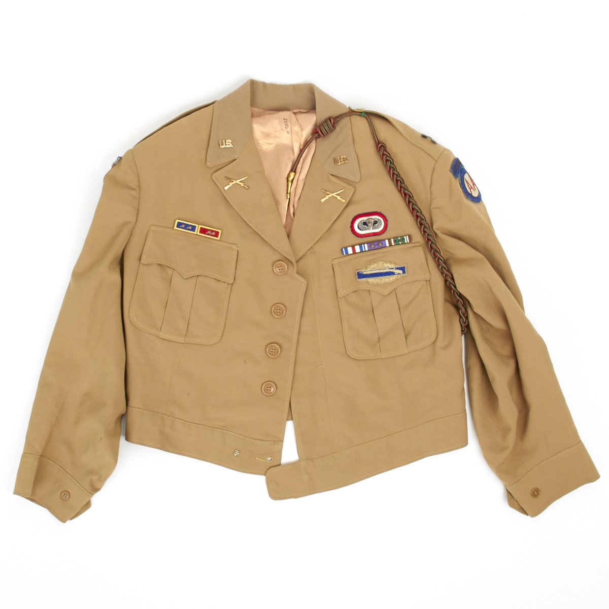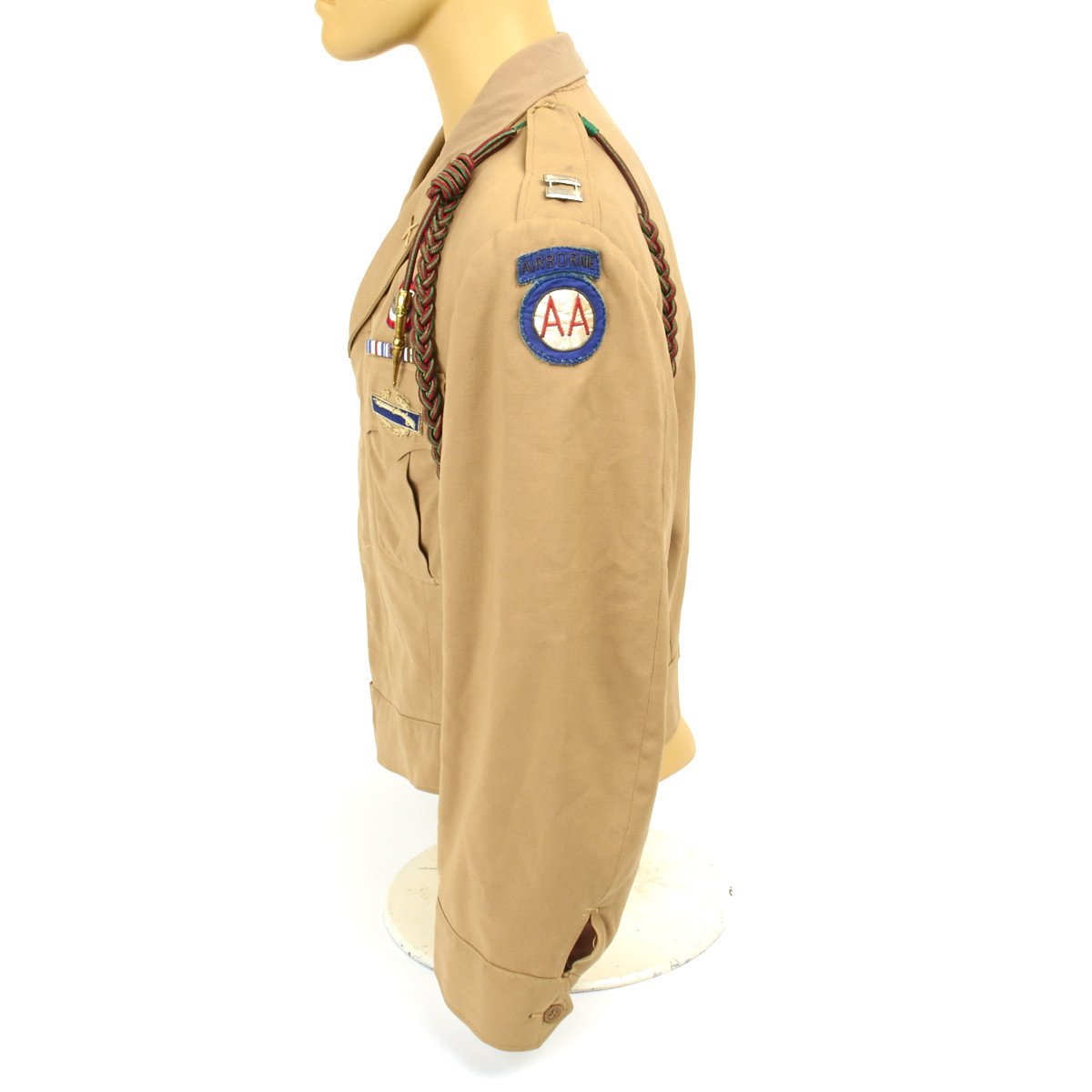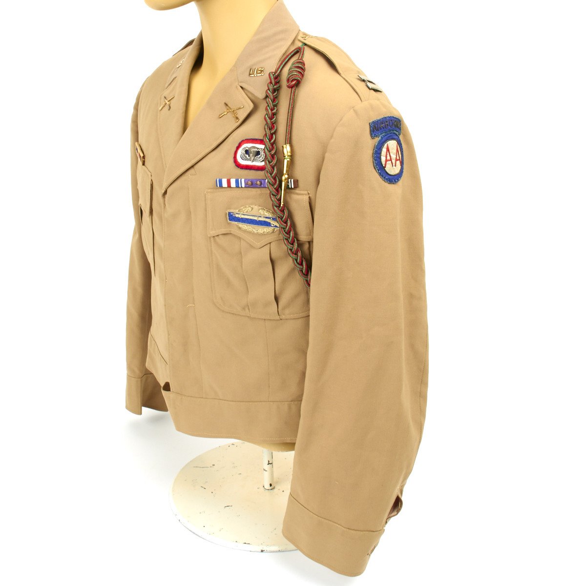 Original Item: Only one available. This is a large size US 42 private purchase unnamed summer weight Khaki Ike style Jacket for a Captain in the 82nd Airborne. He also saw service with the US Army Anti Aircraft Command.