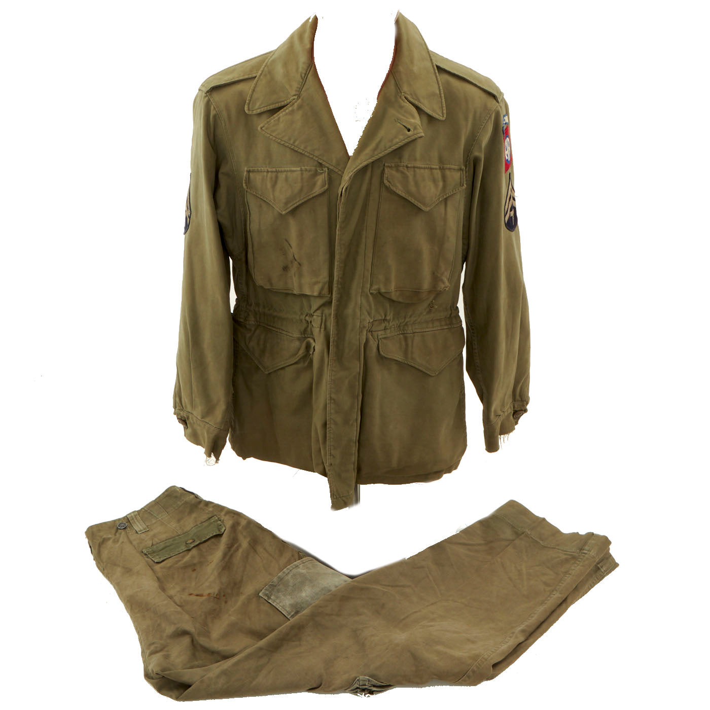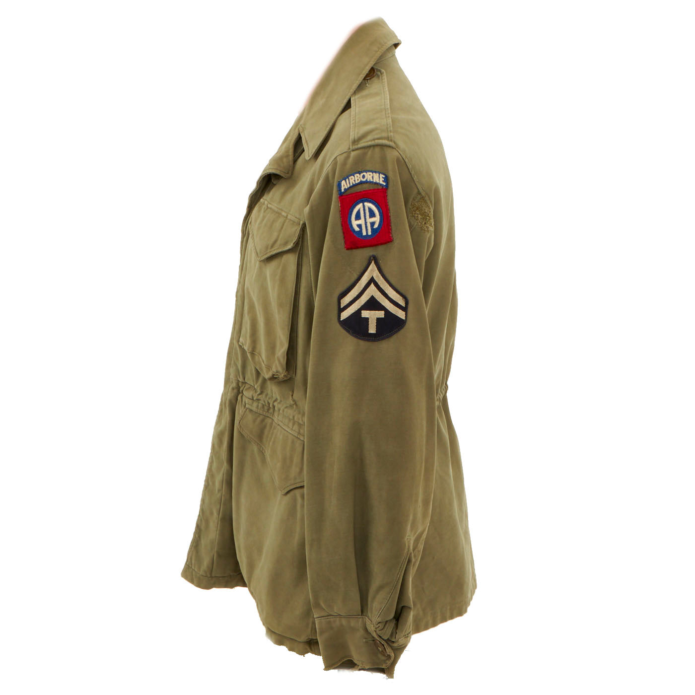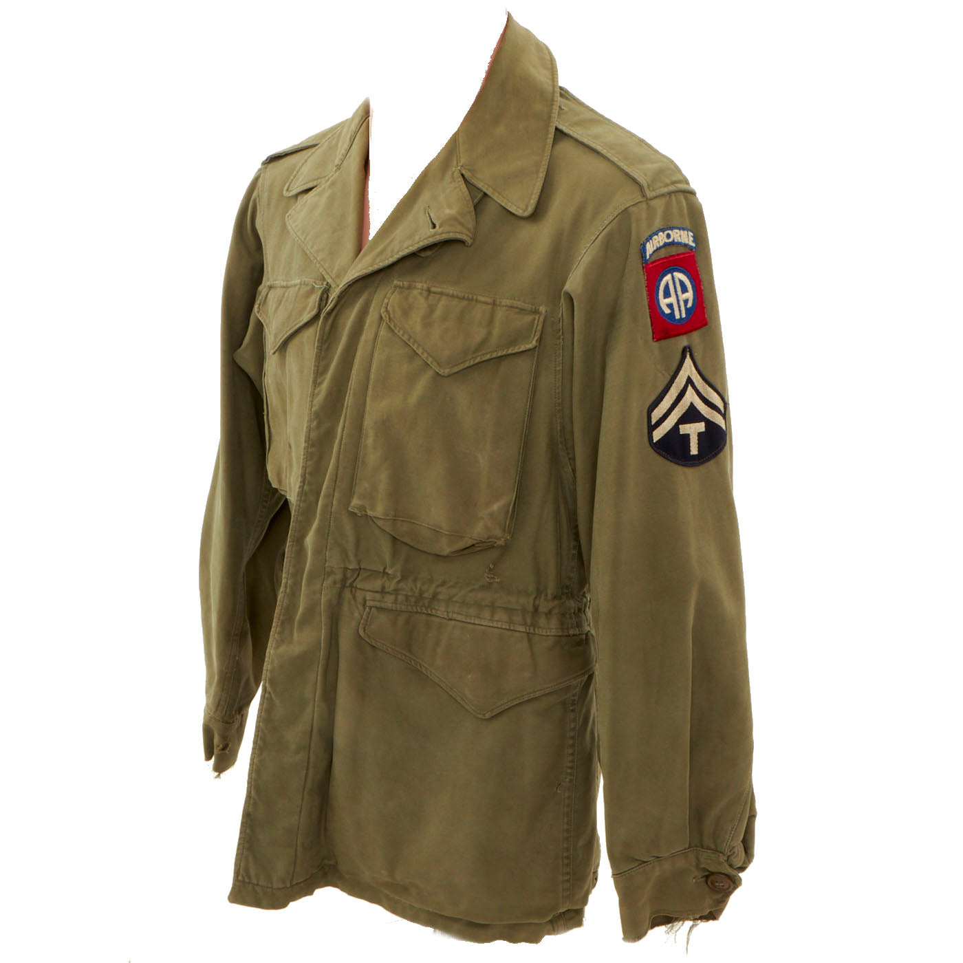 This example is offered in excellent condition. It no longer bears the original manufacture label in the lower right pocket. It has a wonderful embroidered All American 82nd Airborne Division patch on the left shoulder, as well as T/Cpl chevrons on both sleeves. The jacket is not named and is free of any major imperfections, all buttons are present and the condition is excellent. Genuine WW2 issue M43 jackets with patches from famous divisions are hard to come by and this is one of the best we’ve seen in a while from one of the most well known divisions that fought in the European Theater during WWII.