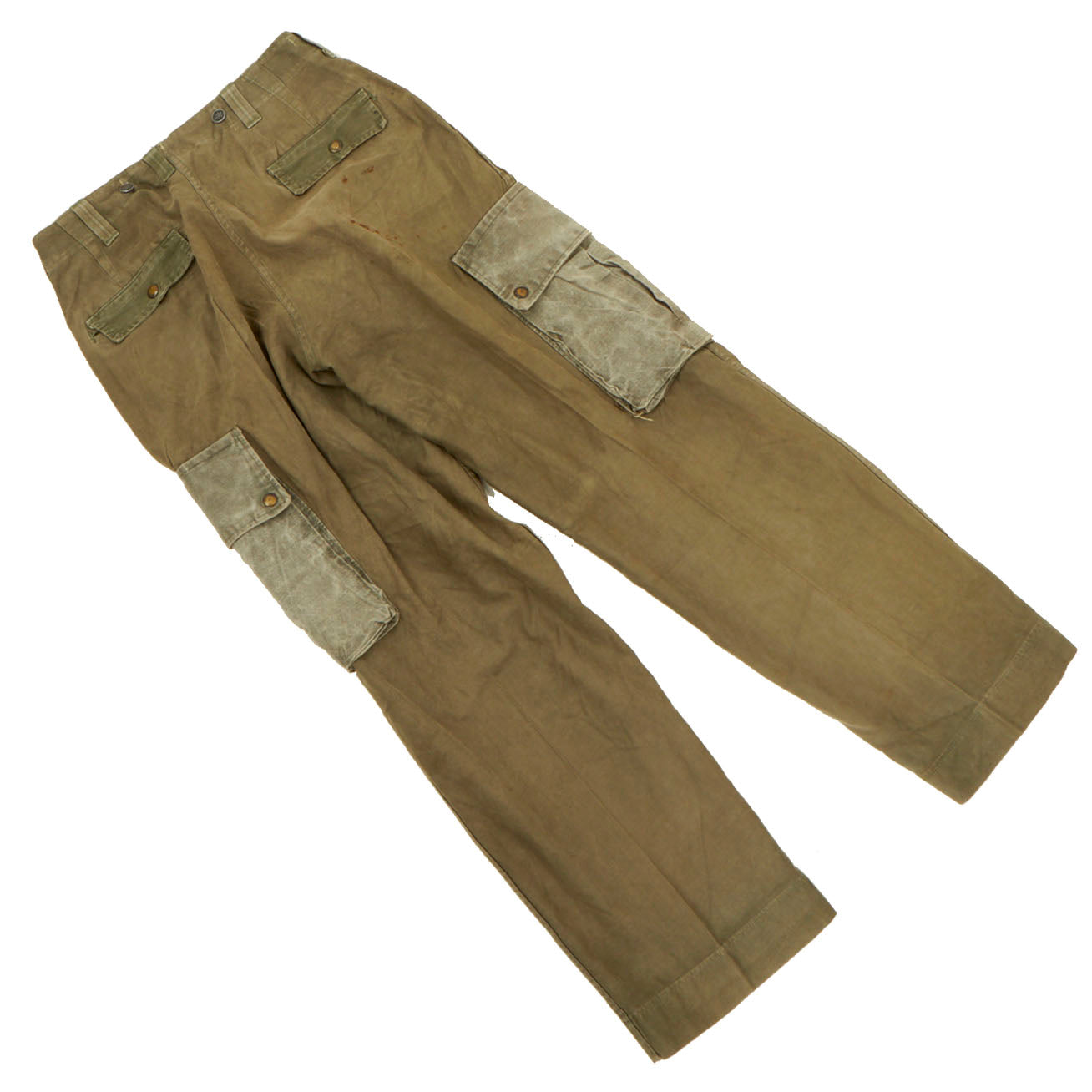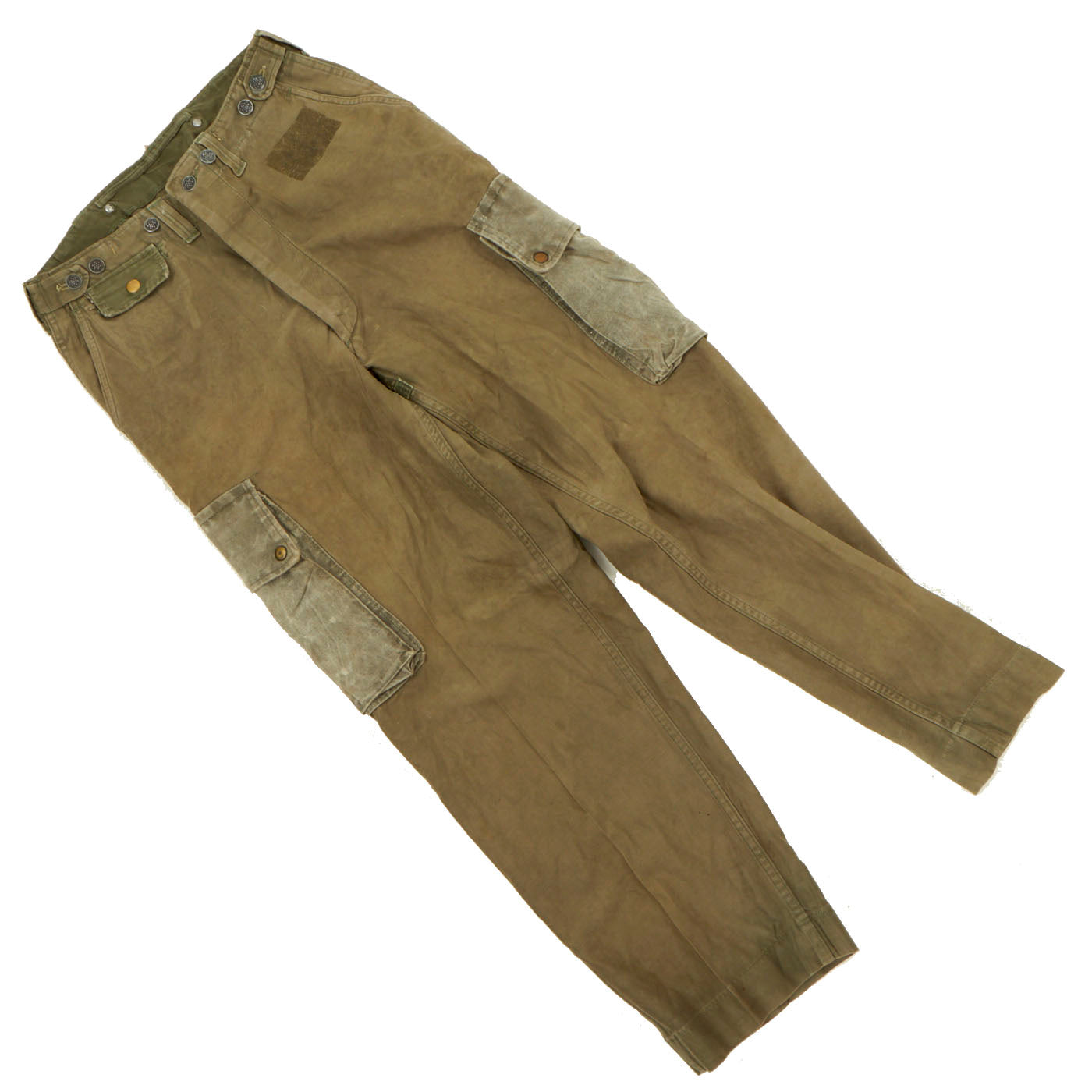 The rigger modified M43 pants are a hard to find Airborne item. After the Normandy campaign, the 101st and 82nd Airborne Divisions (except for the 504 PIR and their attached units) phased out the M42 jump suit uniform in favor of the new M43 uniform. Although period pictures show the M42 jump suit was still occasionally worn until the end of the war, by the time of the Holland campaign, the M43 uniform was the standard Airborne uniform. Heavy olive-drab canvas cargo pockets and leg ties were added to allow more equipment and ammunition to be carried on airborne operations. The pants show signs of heavy use and wear, but appear without major damage, only fading.