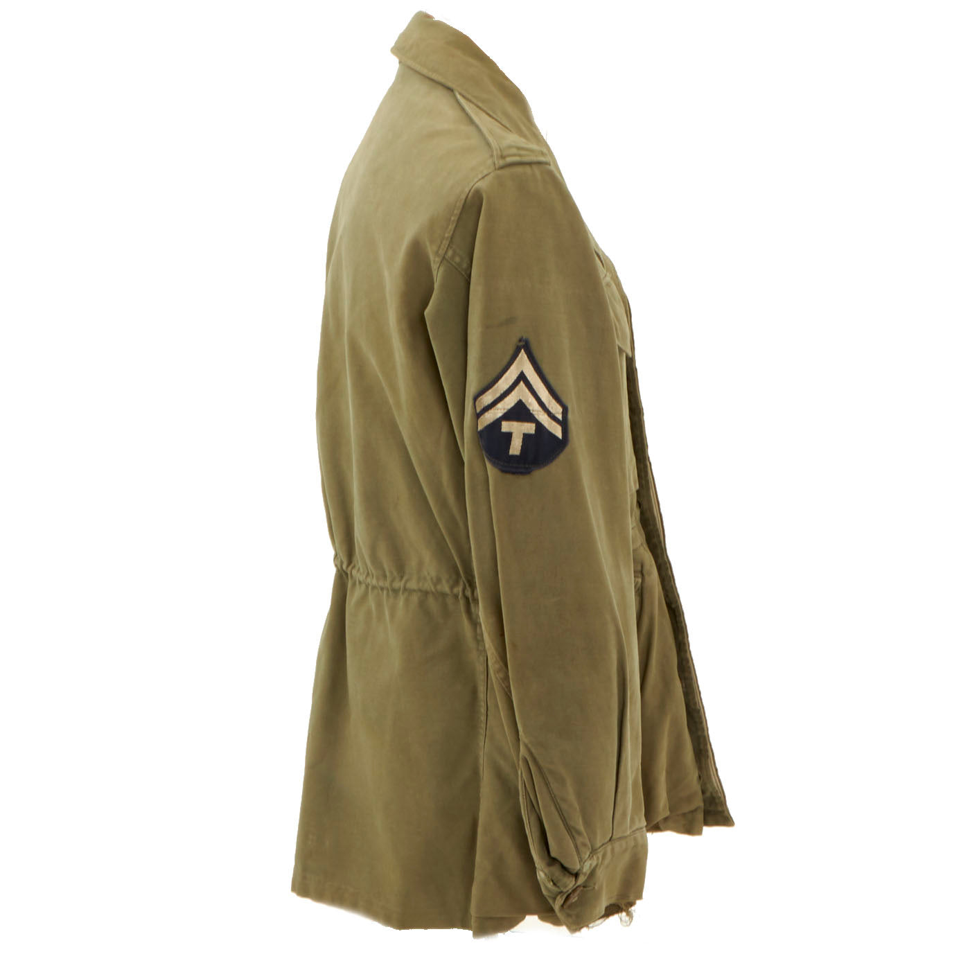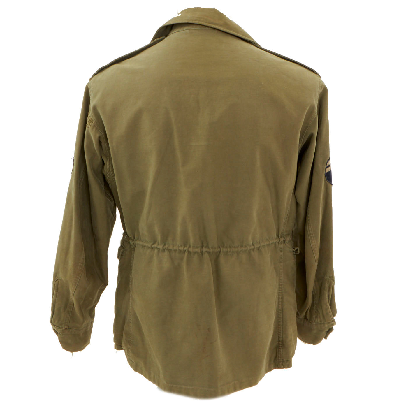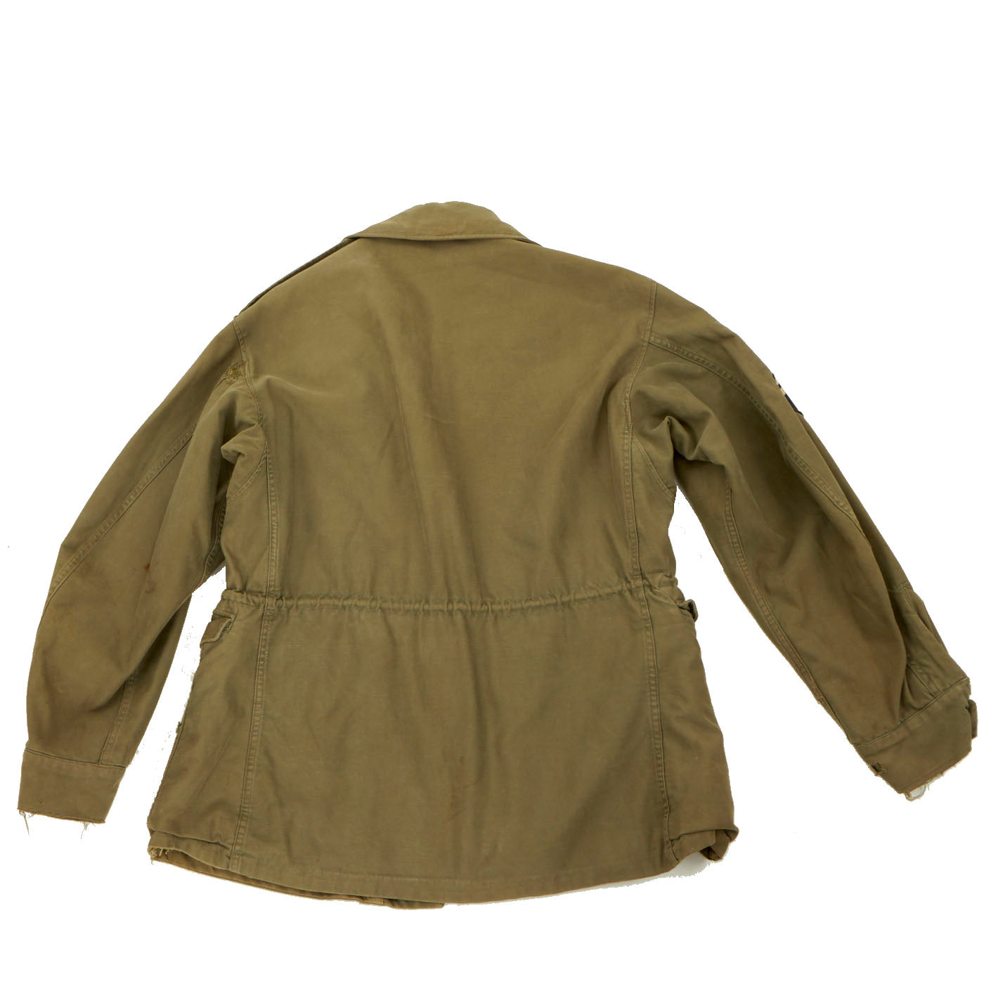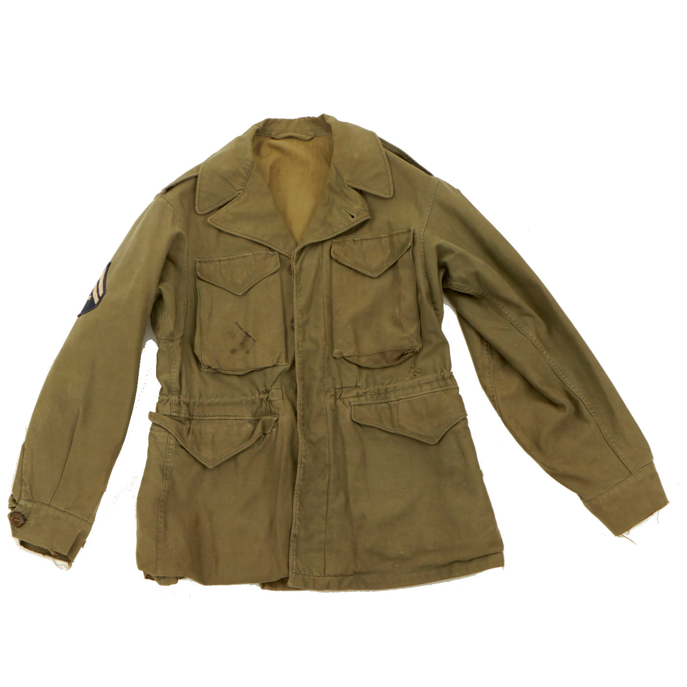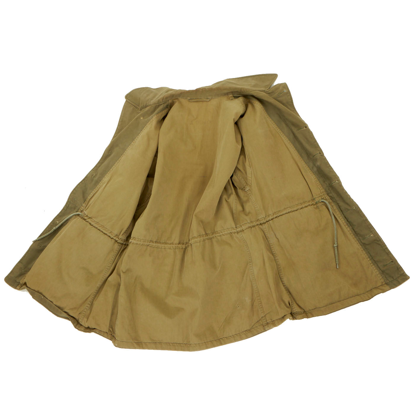Original Item: Only One Available. The Jacket, Field, M1943 was a standardized field jacket issued to Army soldiers in WWII. It was longer than the M-1941 jacket, coming down to the upper thighs. It was made in a light olive-drab OD7, later a darker OD9 cotton sateen. It also had a detachable hood (not included), drawstring waist, two large breast pockets and two skirt pockets.