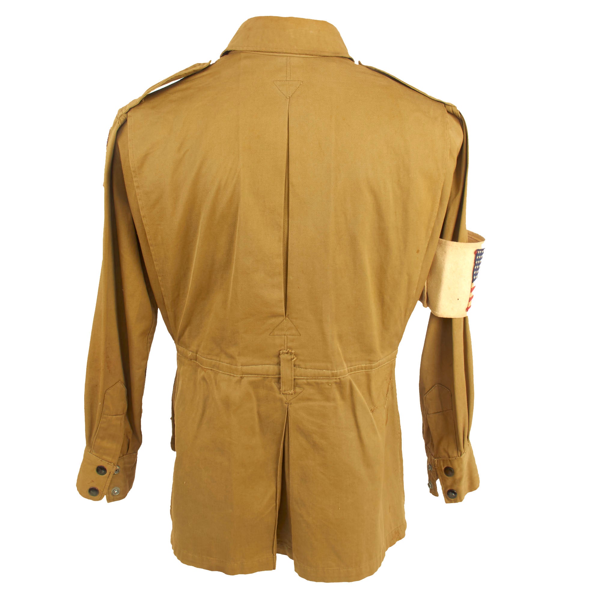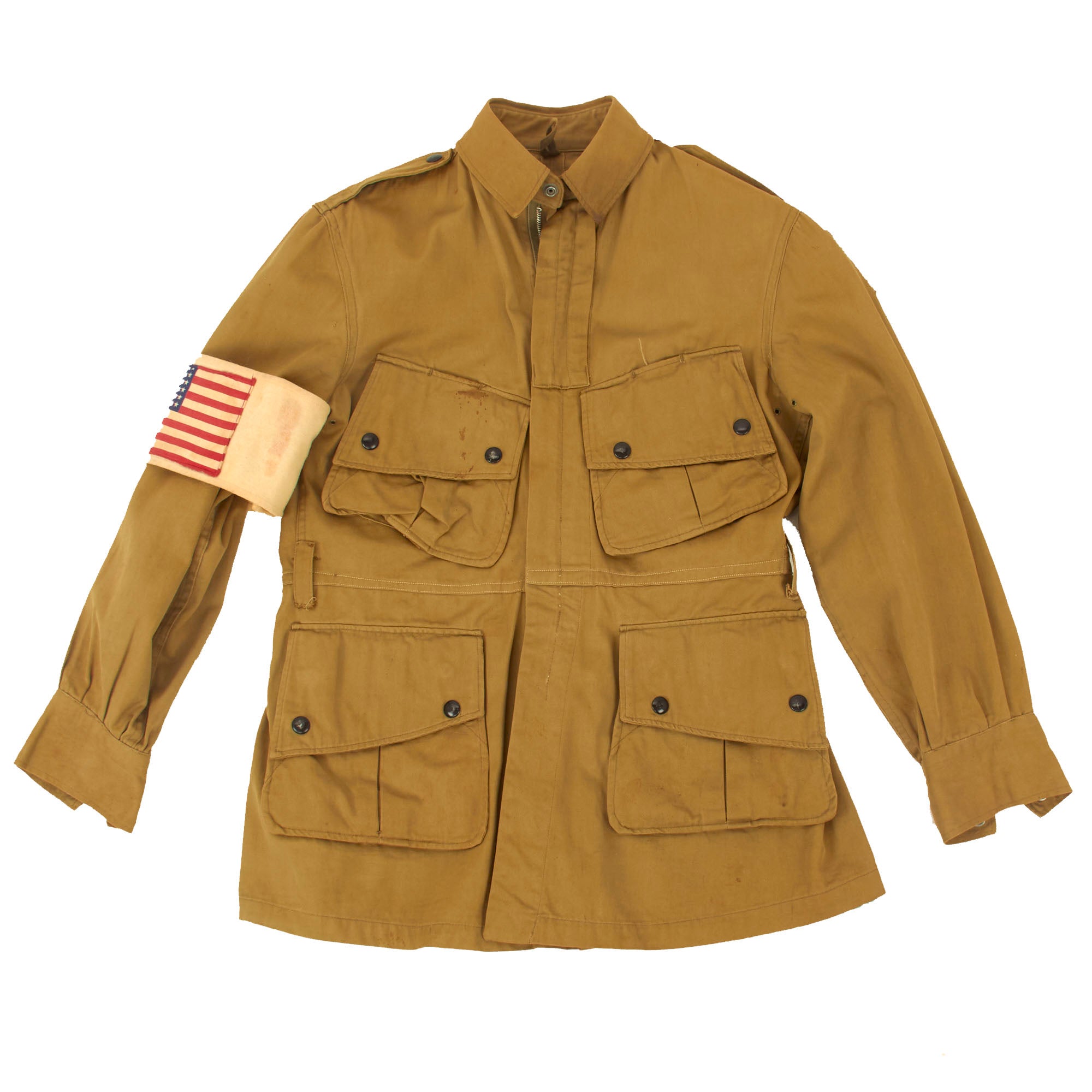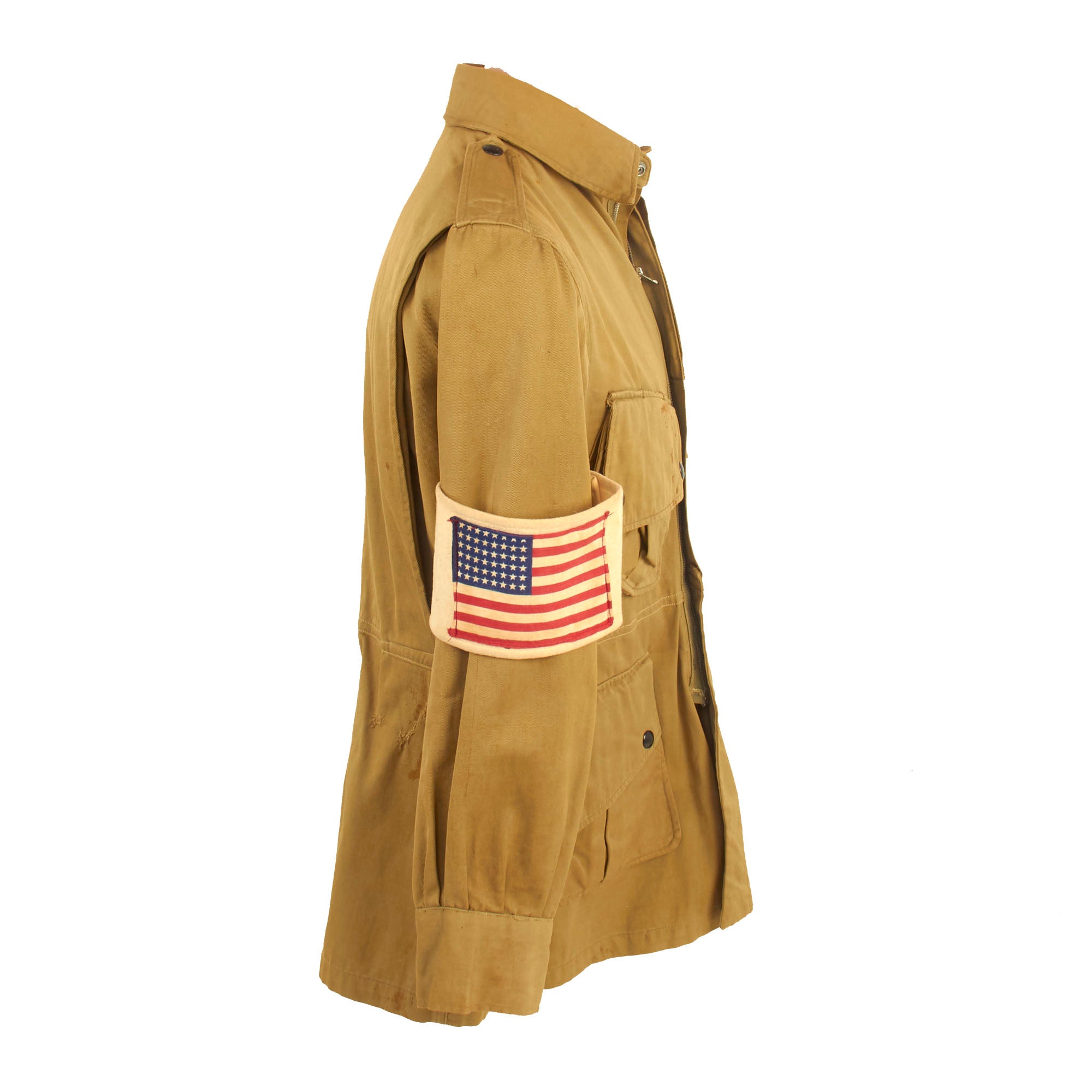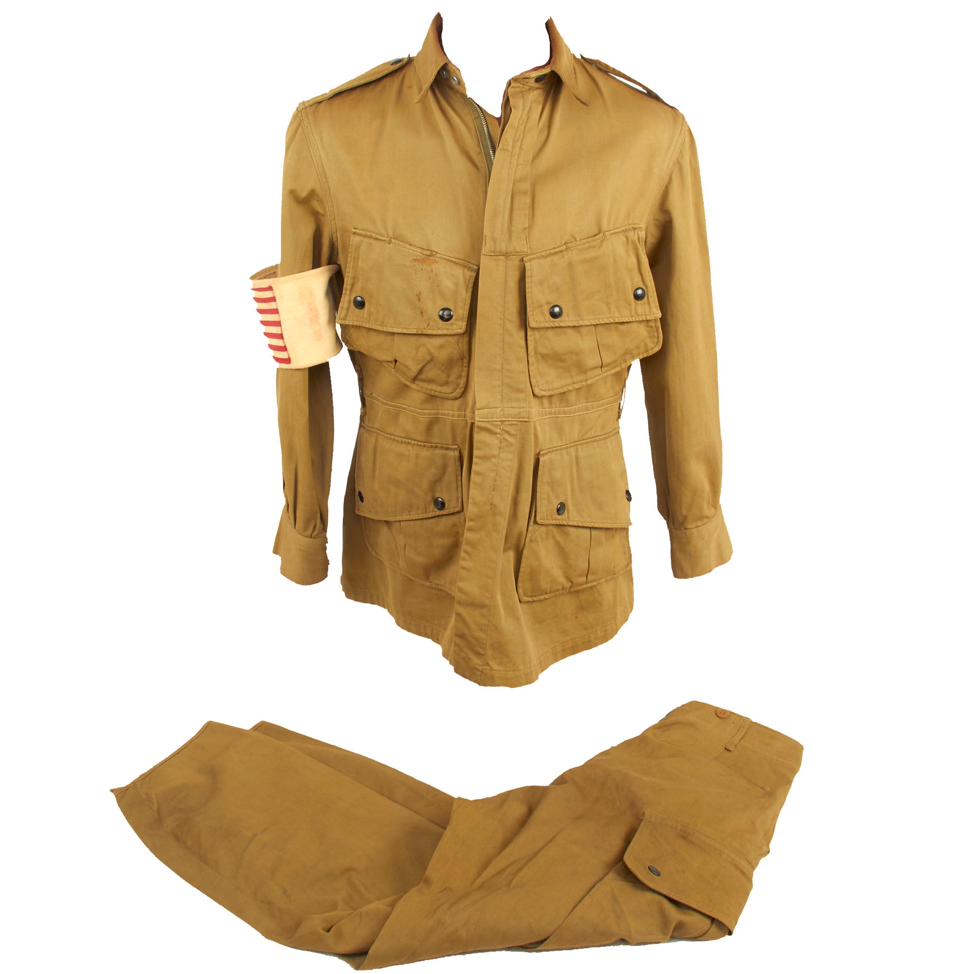 Original U.S. WWII 82nd Airborne Division M1942 Paratrooper Jump Jacket without Reinforcements with British Made American Flag Invasion Armband and Laundry Number Marked Trousers