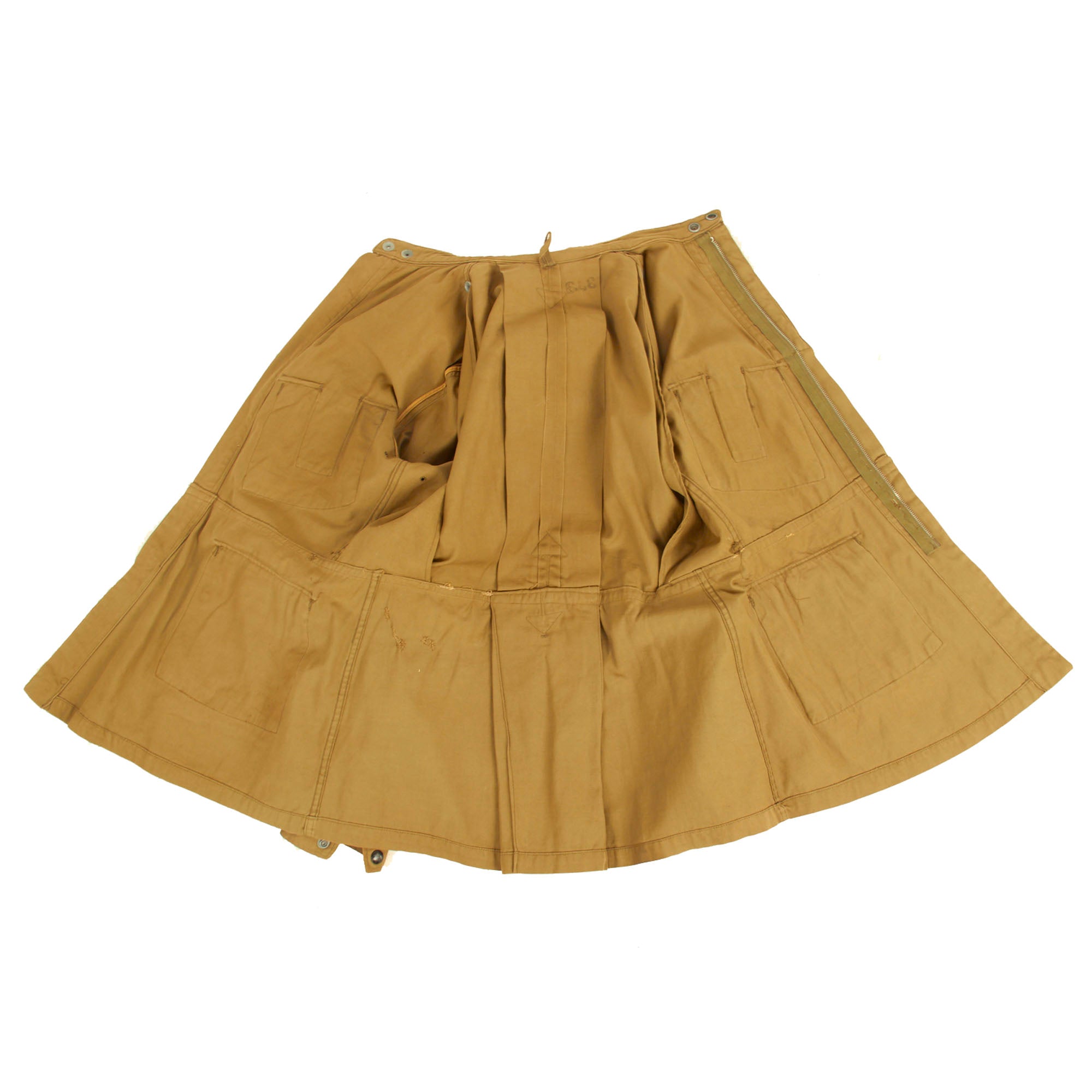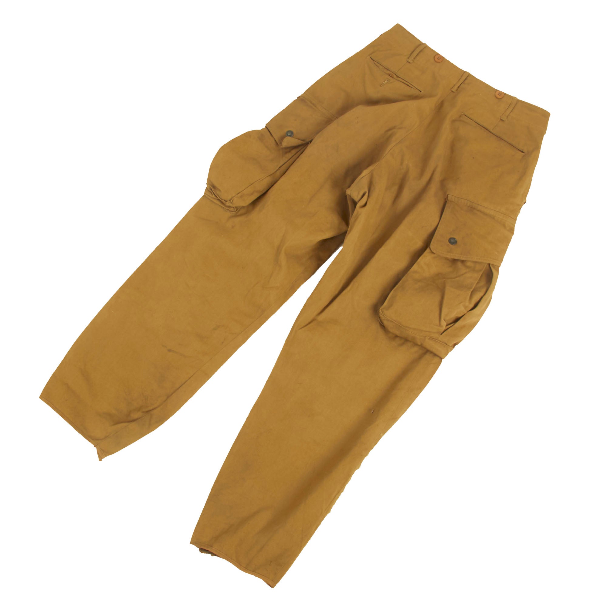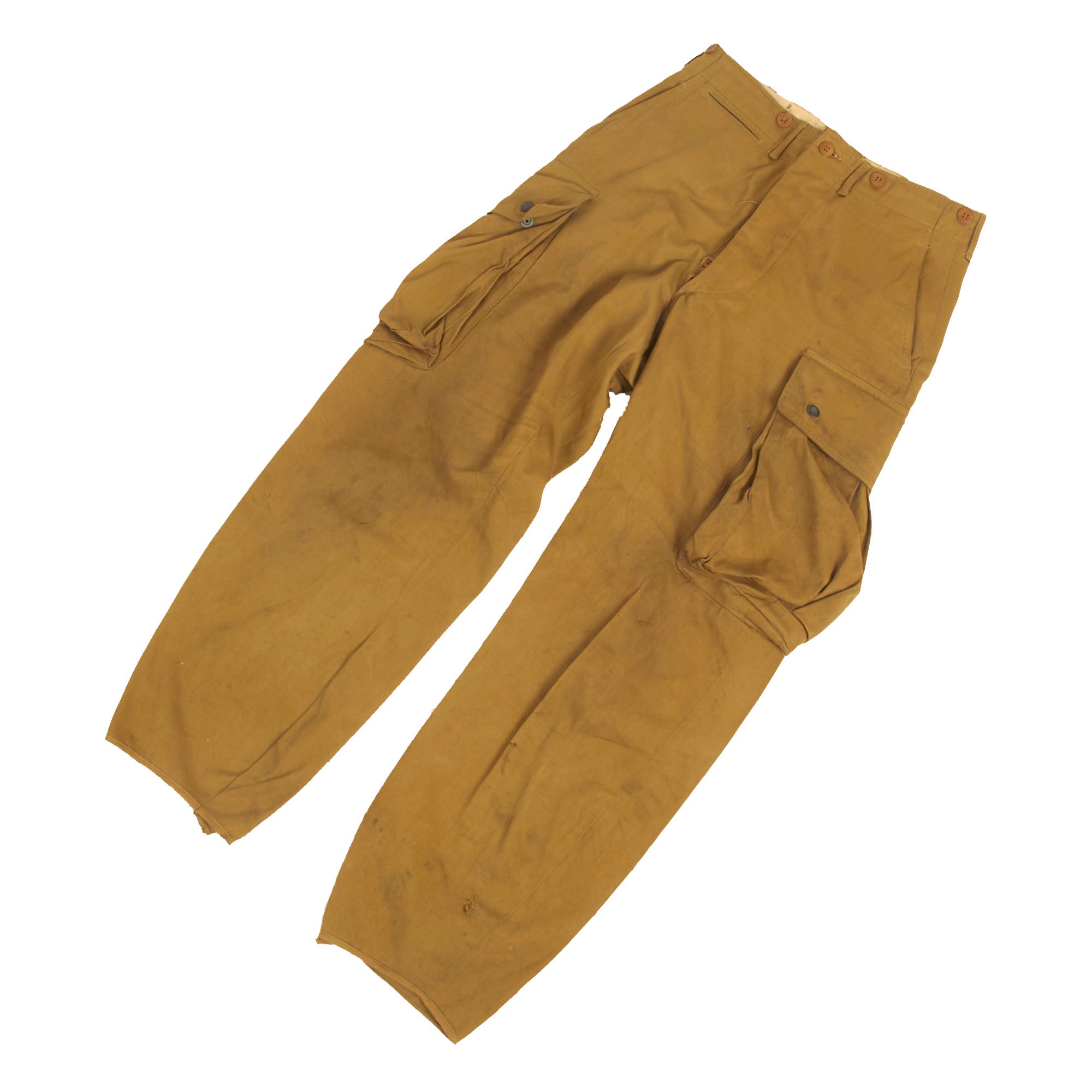 Due to the somewhat fragile nature of the uniform, the M1942 pattern was often reinforced with thicker, tougher canvas on the elbows, crotch and knees. However, this example was never reinforced, indicating early issue. The M42 was worn by Paratroops assigned to Airborne units. The M42 was eventually phased out in favor of the M1943 Uniform which was a darker green, OD #7. Despite this, various individuals chose to keep their M42s in order to show their veteran status.