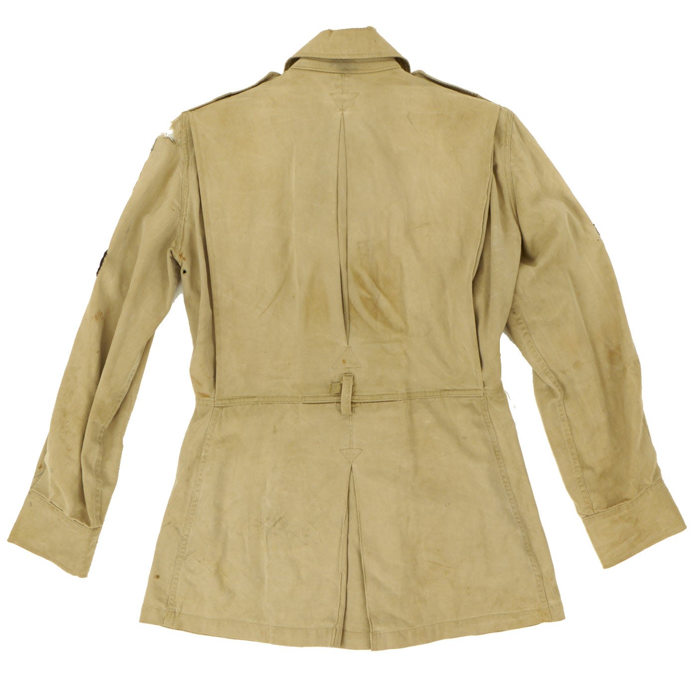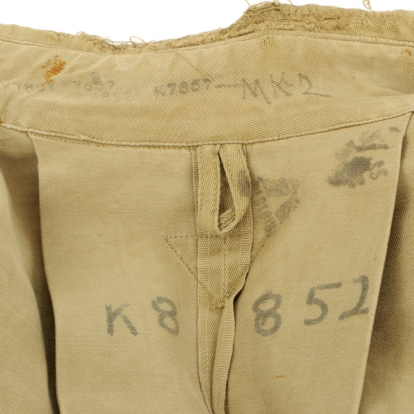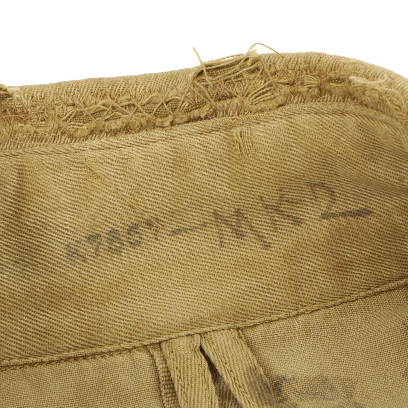 Due to the somewhat fragile nature of the uniform, the M42 was often reinforced with thicker, tougher canvas on the elbows, crotch and knees. However, this example was never reinforced. The M42 was mostly worn by Paratroops assigned to Airborne units. The M42 was eventually phased out in favor of the M1943 Uniform which was a darker green, OD #7. Despite this, various individuals chose to keep their M42s in order to show their veteran status. This example was clearly worn in service for an extended period. There are multiple repairs to stitching and wear throughout.