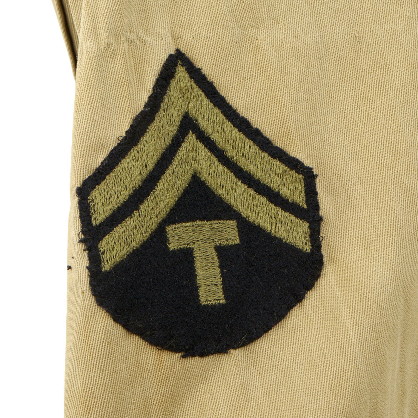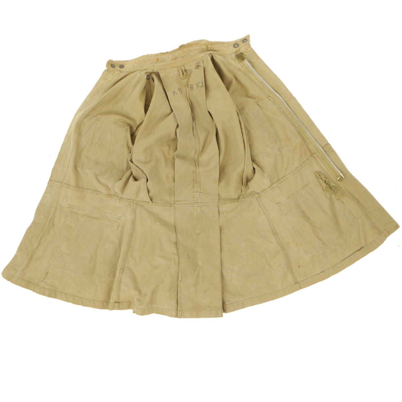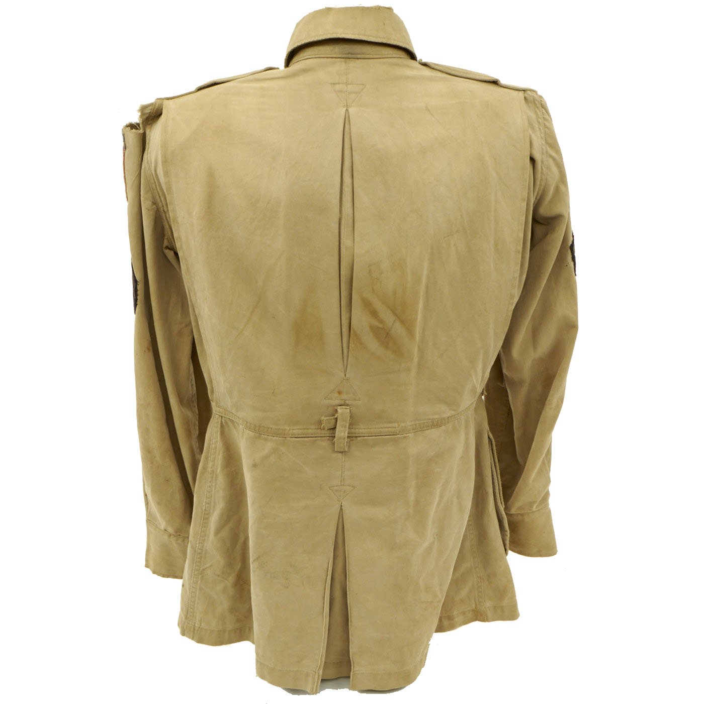 Due to the somewhat fragile nature of the uniform, the M42 was often reinforced with thicker, tougher canvas on the elbows, crotch and knees. However, this example was never reinforced. The M42 was mostly worn by Paratroops assigned to Airborne units. The M42 was eventually phased out in favor of the M1943 Uniform which was a darker green, OD #7. Despite this, various individuals chose to keep their M42s in order to show their veteran status. This example was clearly worn in service for an extended period. There are multiple repairs to stitching and wear throughout.