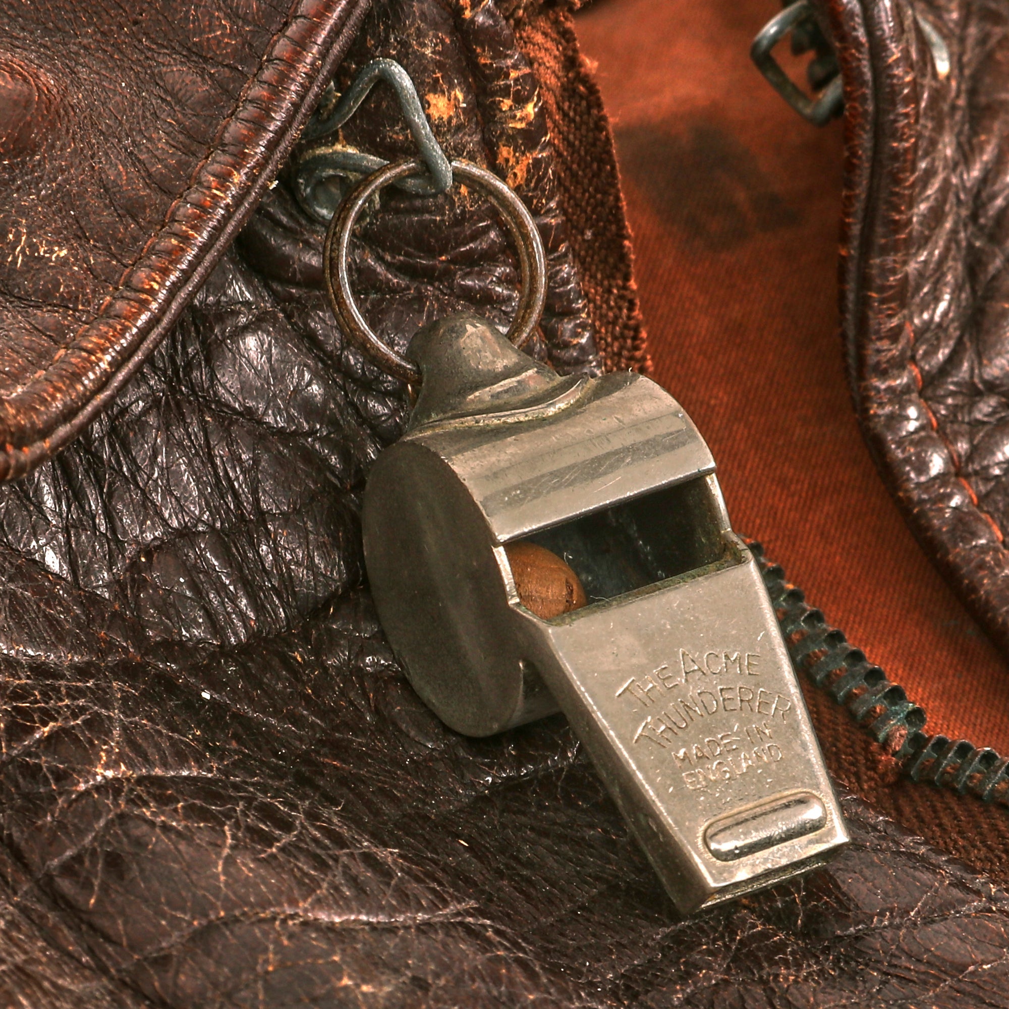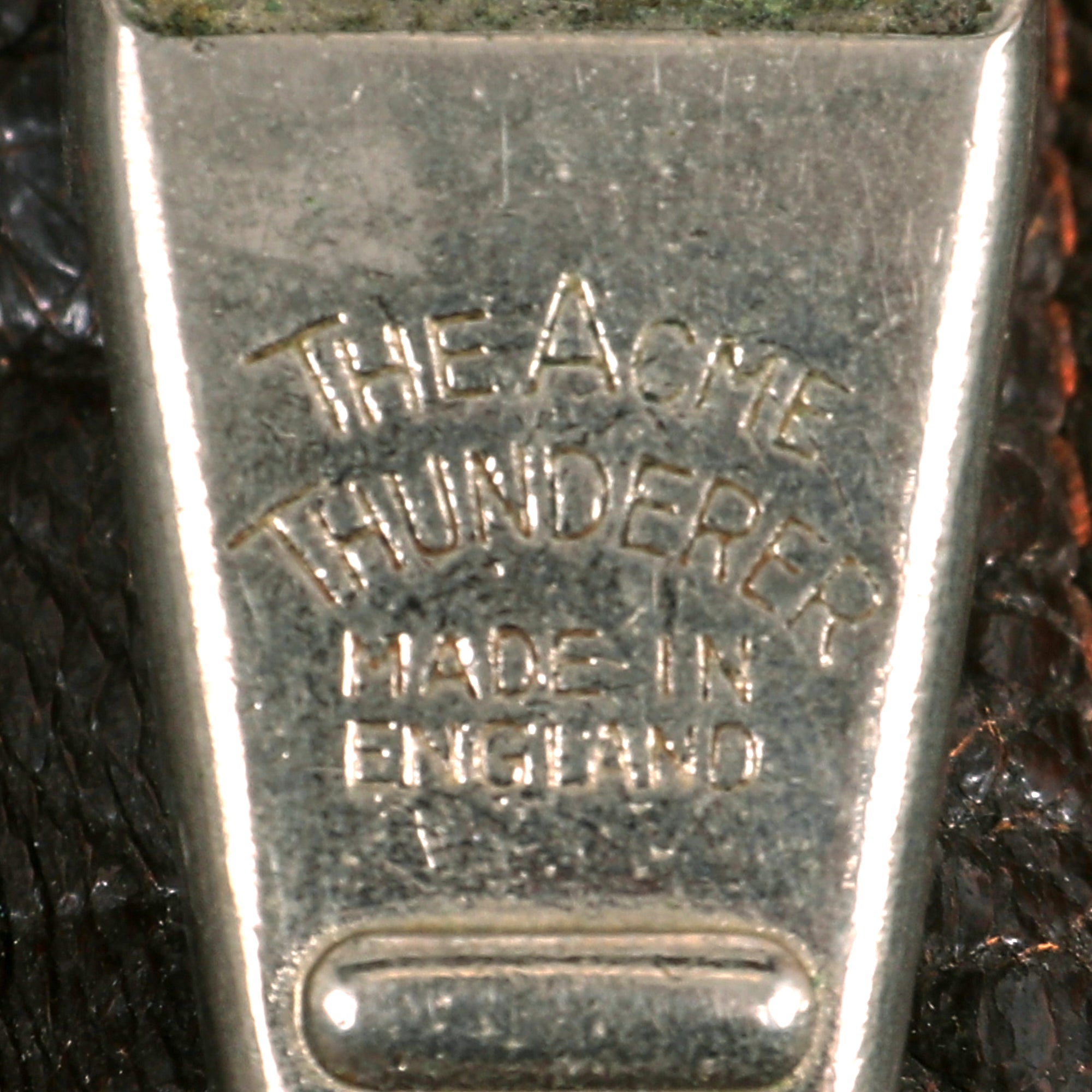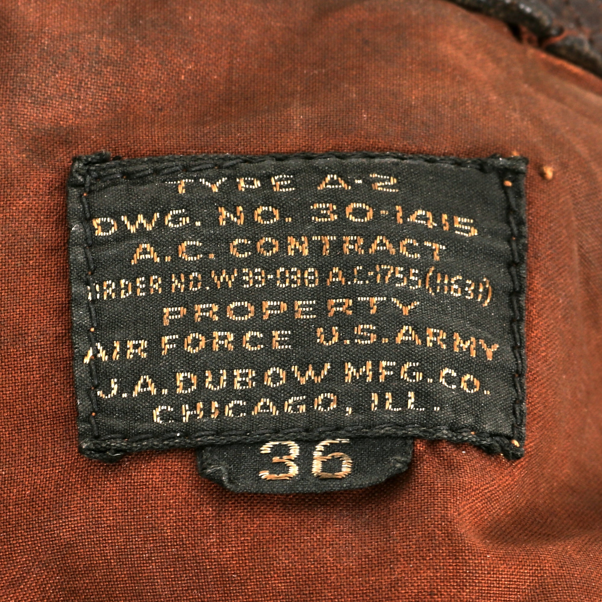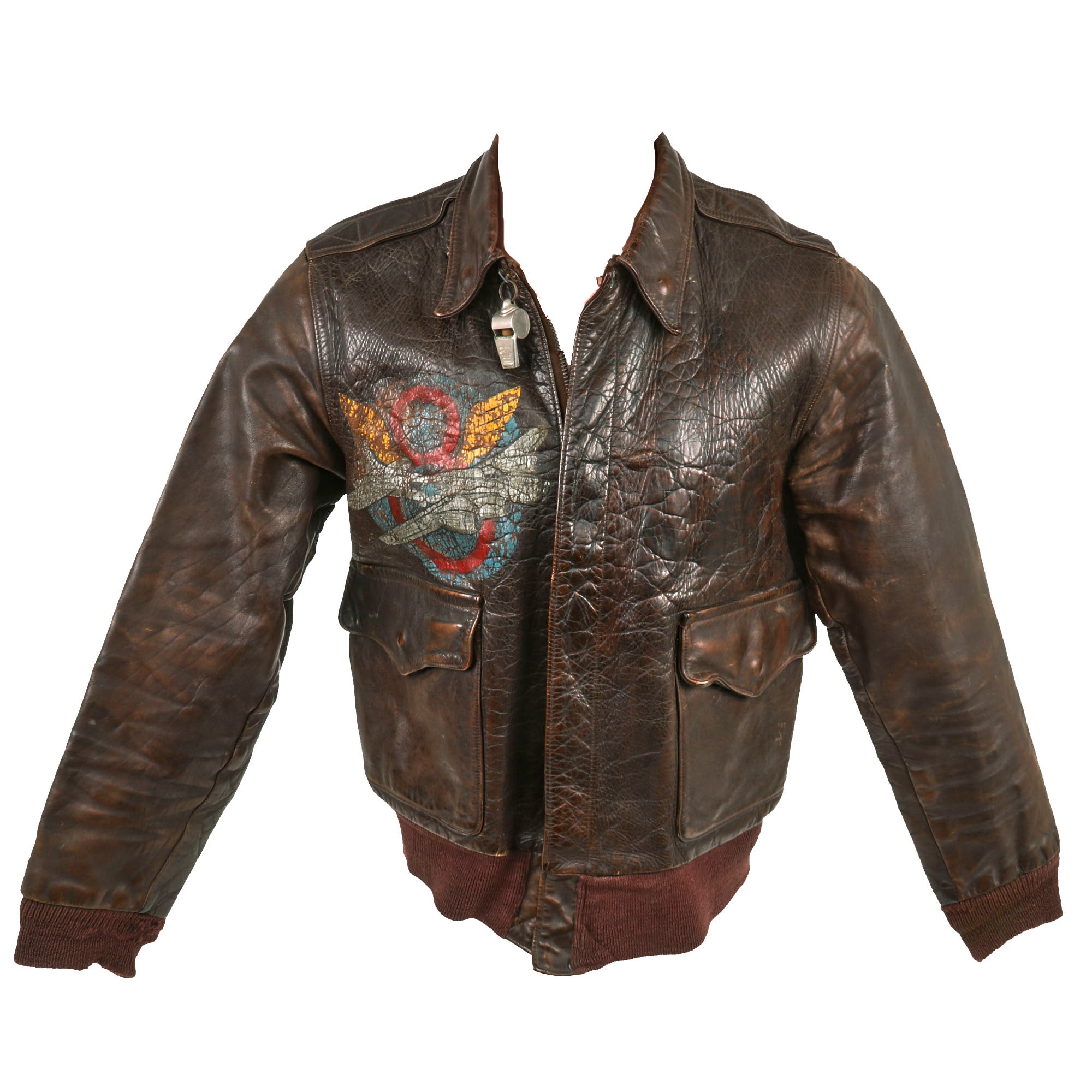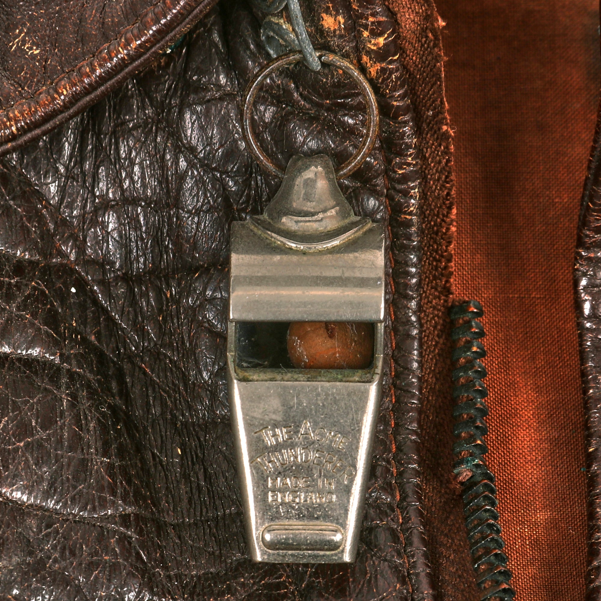 The jacket is in size US 36 and has retained all period original components including the original knit waist band and sleeve cuffs, something we often see replaced on A-2 jackets that saw extensive service. Also original is the TALON brand zipper which is functional. Also, attached to the collar latch is a period ACME Thunderer Whistle, made in England. This is entirely original to the jacket and was absolutely acquired by the gunner while stationed in England.