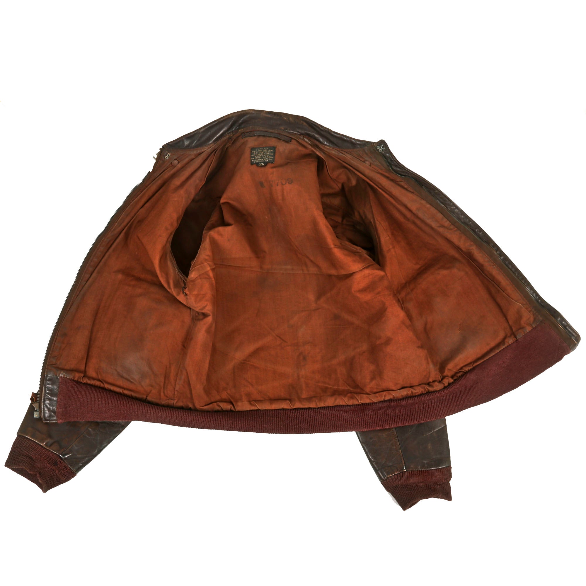 The pin-up girl is positioned in the well-known “as above, so below” pose. The front of the jacket is painted on the right breast with a large 8th Air Force insignia with a B-17/B-24 Bomber painted over it. The paint is a bit worn as shown but is still very discernable, a testament to its age and authenticity. The interior of the jacket retains its original liner and tag. The Aerial Gunner’s enlisted man's laundry number, M-7709, is stenciled below the tag. This laundry number brought up 97 results on the WWII US Army Enlistment Records website, and we are confident that with enough work, going through the 97 names would eventually bring up the soldier who wore this. This could be done by using the term “8th Air Force” or “Aerial Gunner” and cross-referencing them with the names of the soldiers until a match comes up either in the form of an obituary or a wartime article about the soldier’s service. This jacket is a fantastic research project!