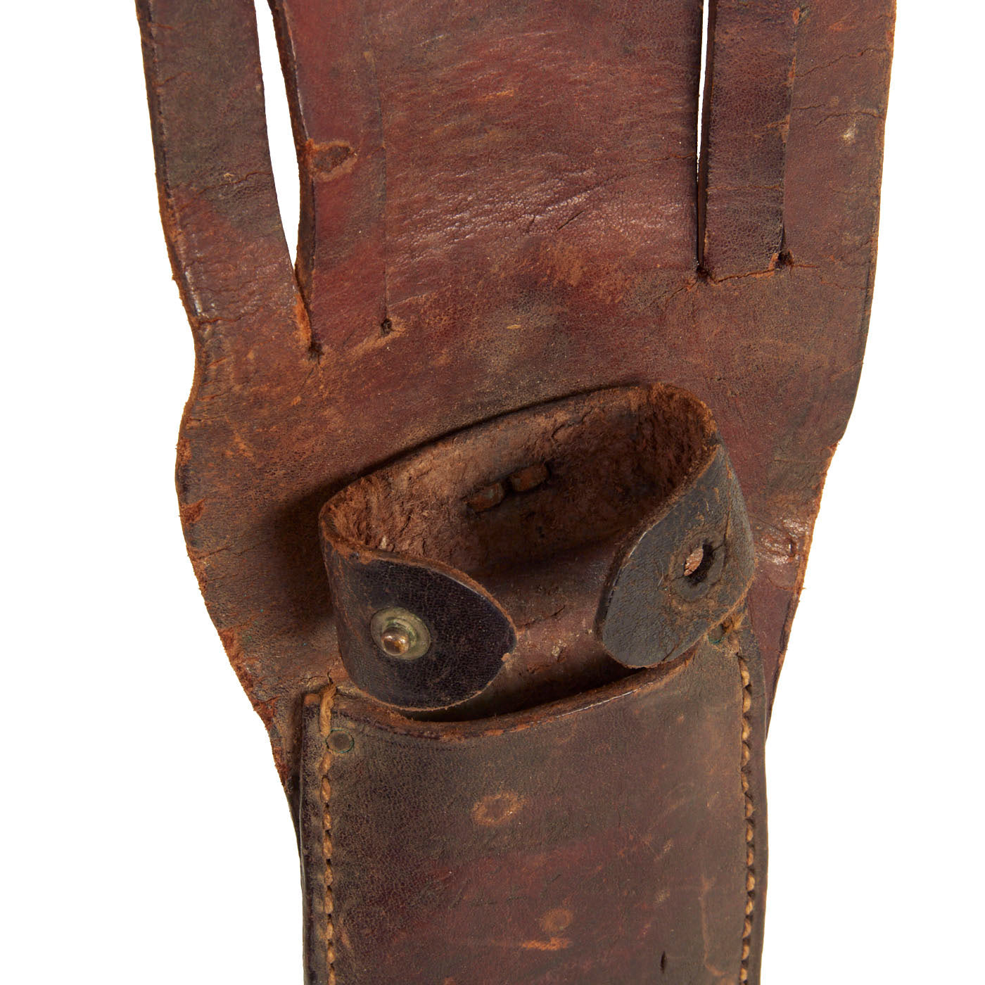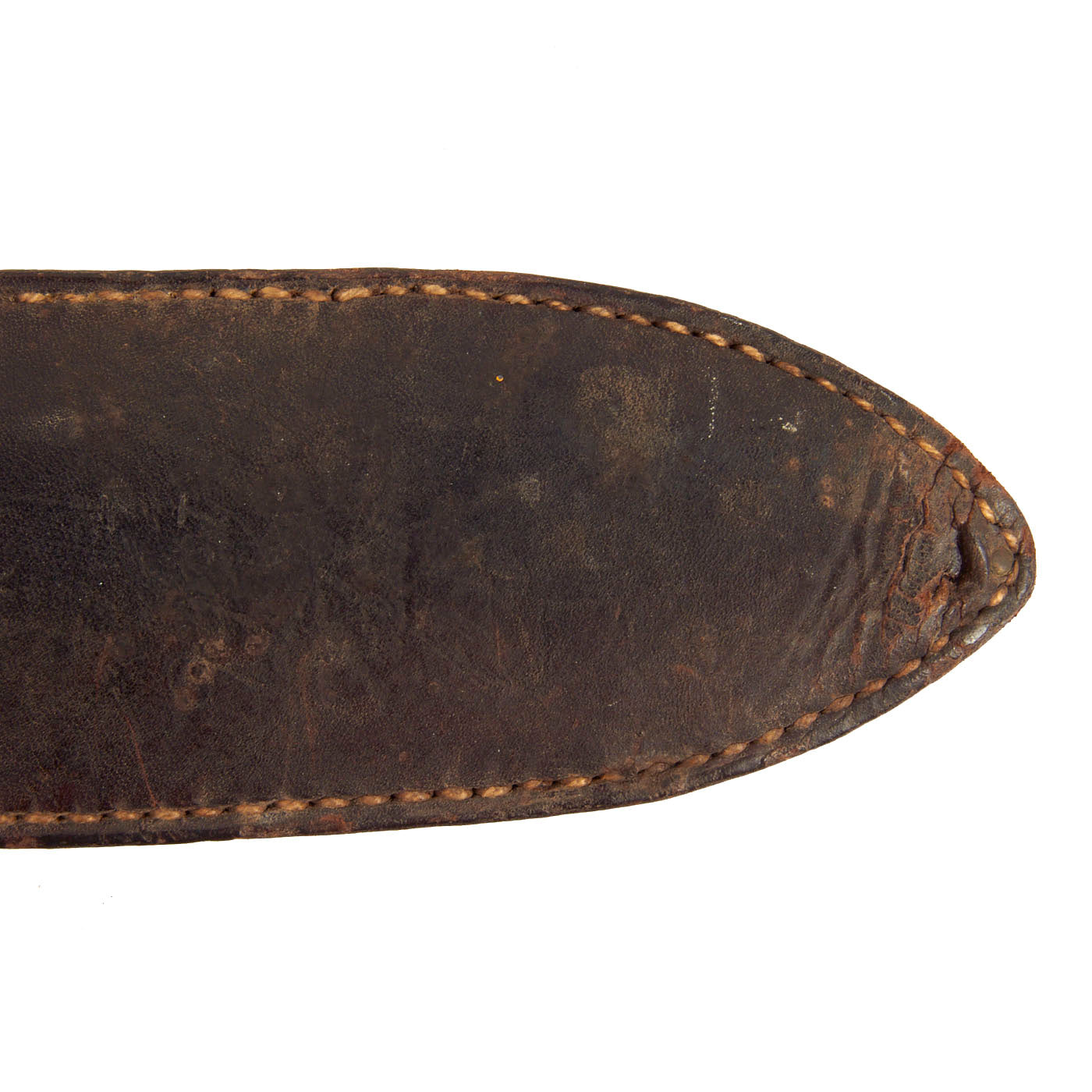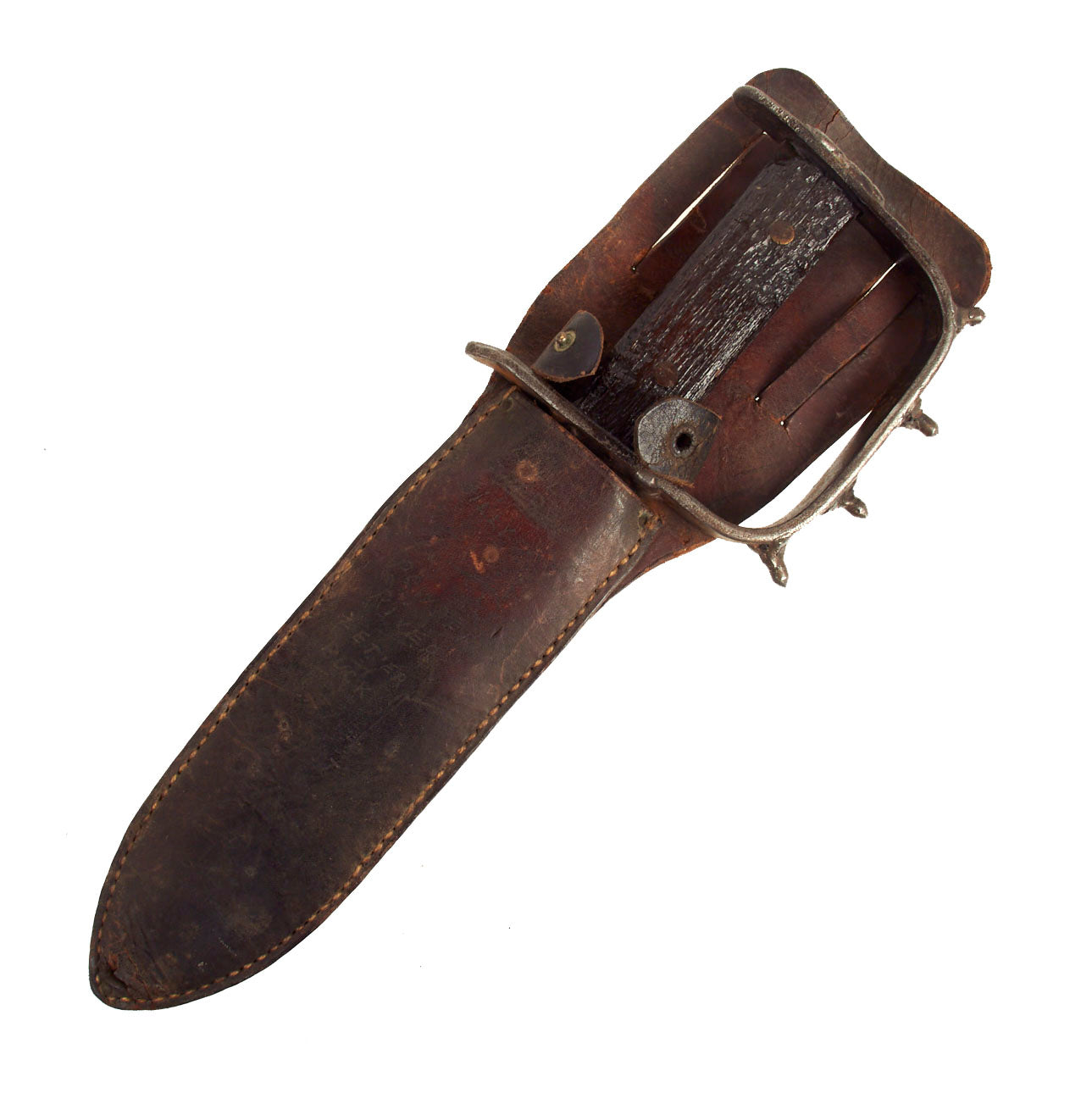 The original leather scabbard is very well made with all stitching and rivets intact. The only thing missing is the female fastener on the retaining strap. The face of the scabbard has faint etching on it and from what we can read is as follows: