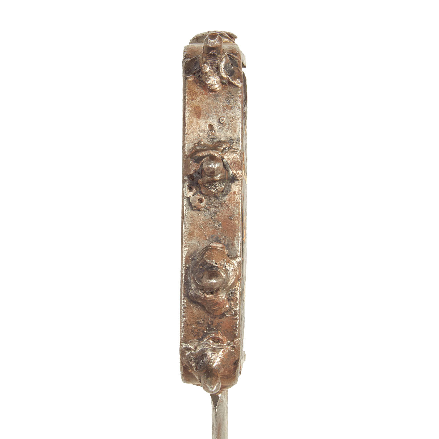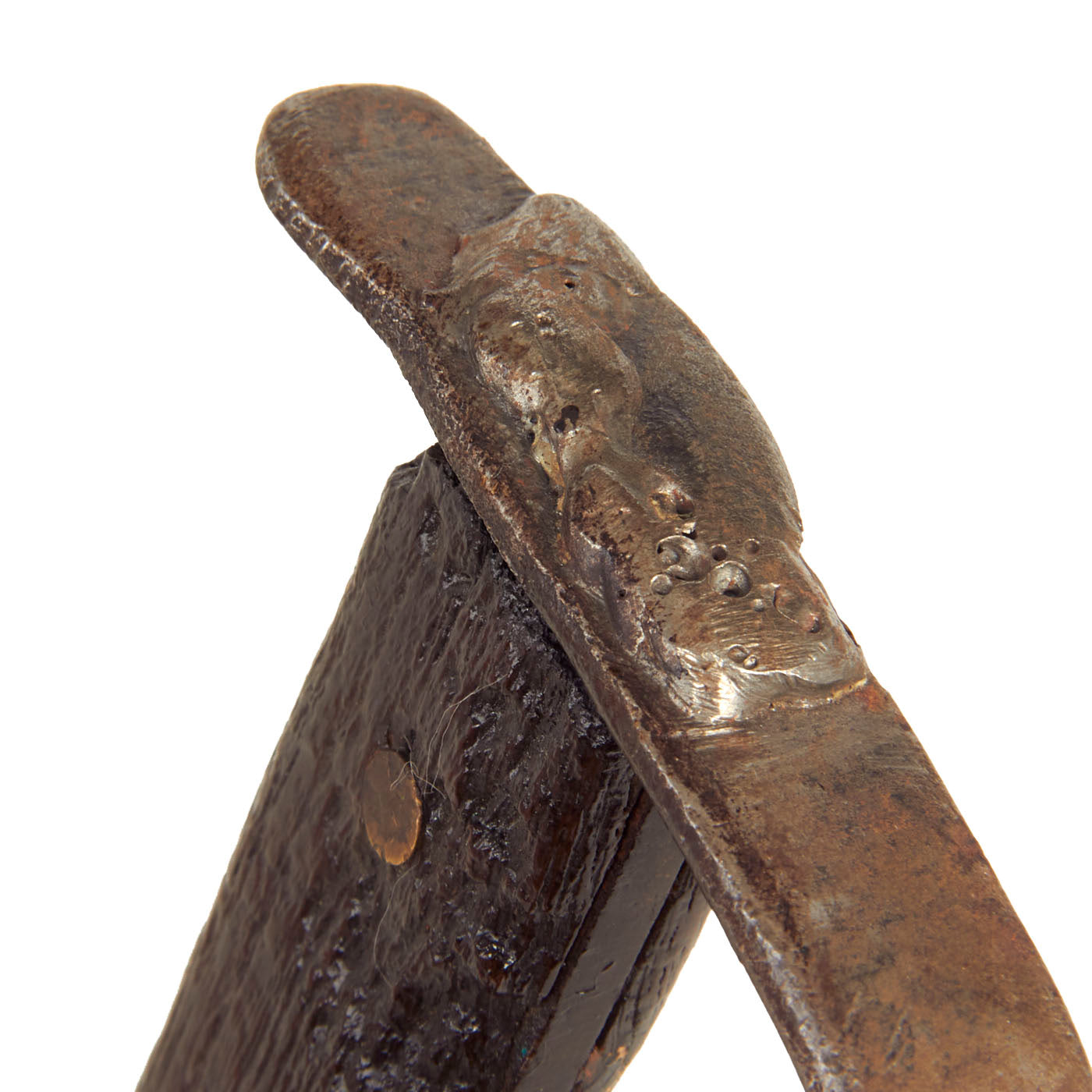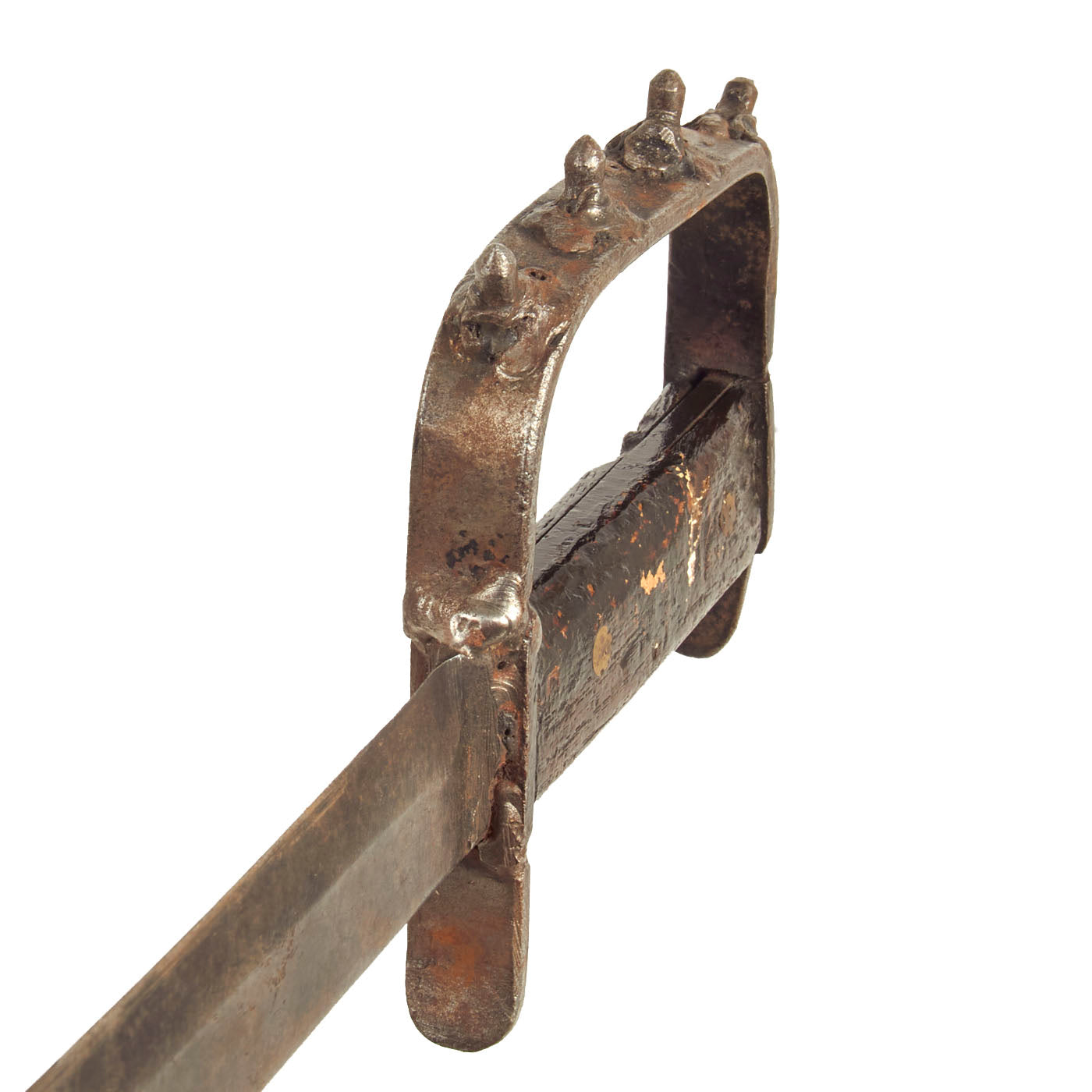 The knife features a large D guard with 4 pointed studs on the outside of the guard. The handle is made of wood and held on with 2 brass rivets. It would appear that the would was clear coated in order to prevent further chipping and decay, giving it a lovely deep dark red color. All components except for the rivets and grip scales are steel and very crudely and hastily welded together. This is a heavy duty “ugly” yet attractive knife.