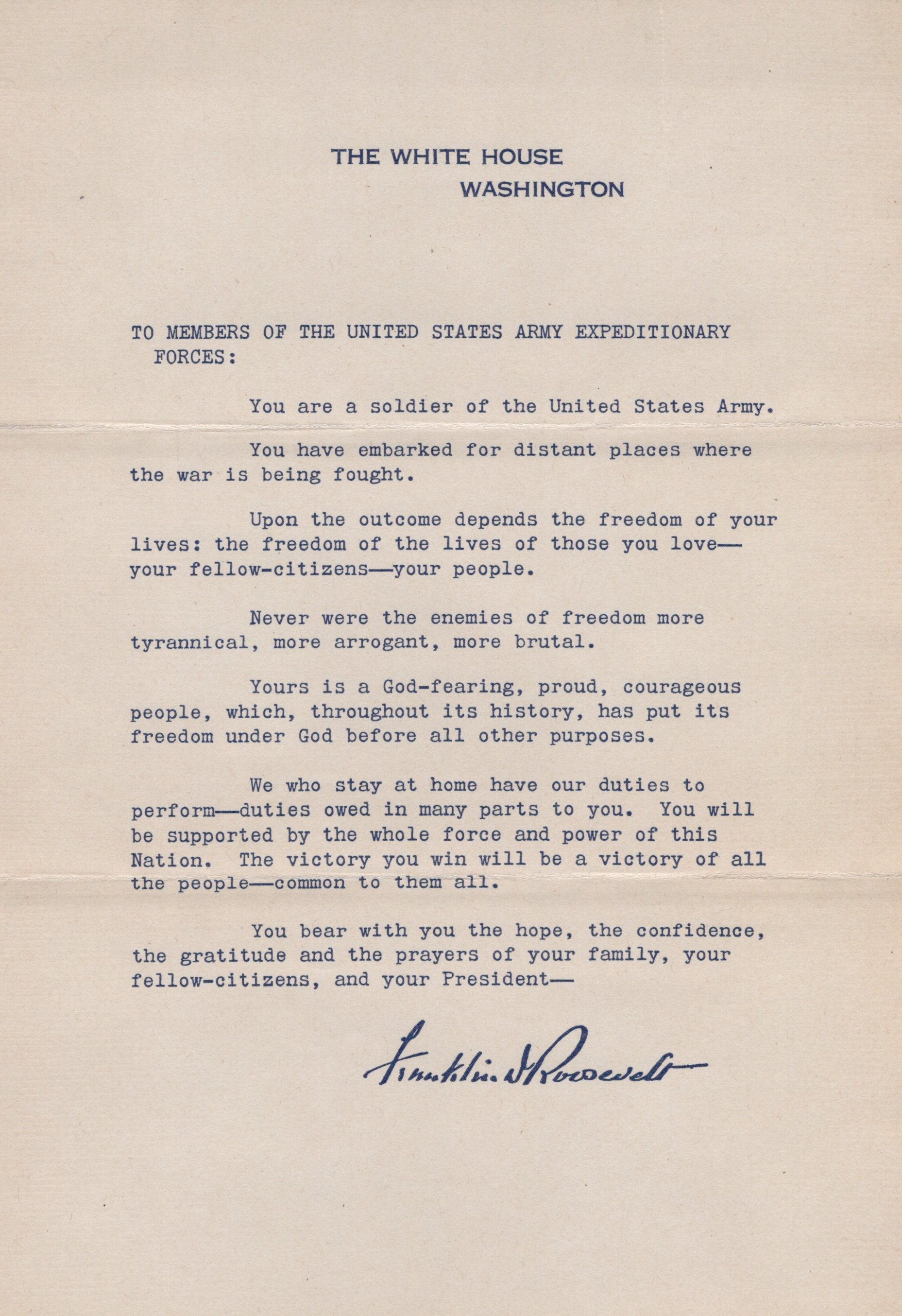 - Roosevelt Letter to Army Expeditionary Forces members with original envelope. Good shape.