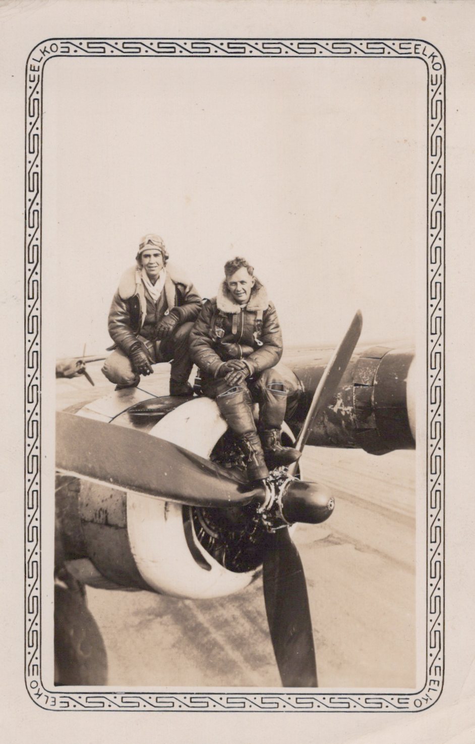 - Photo of two aviators sitting on an aircraft wing and propeller.