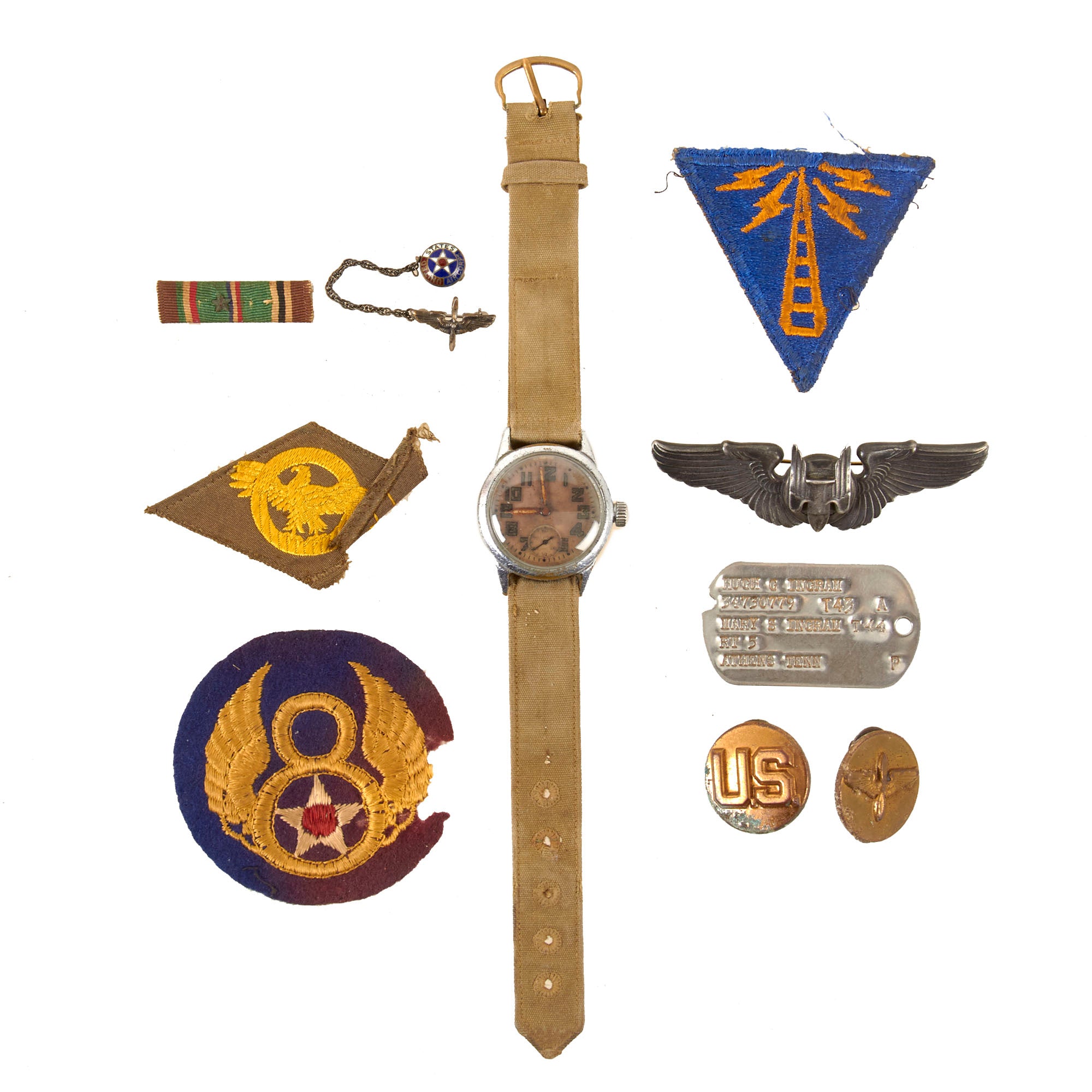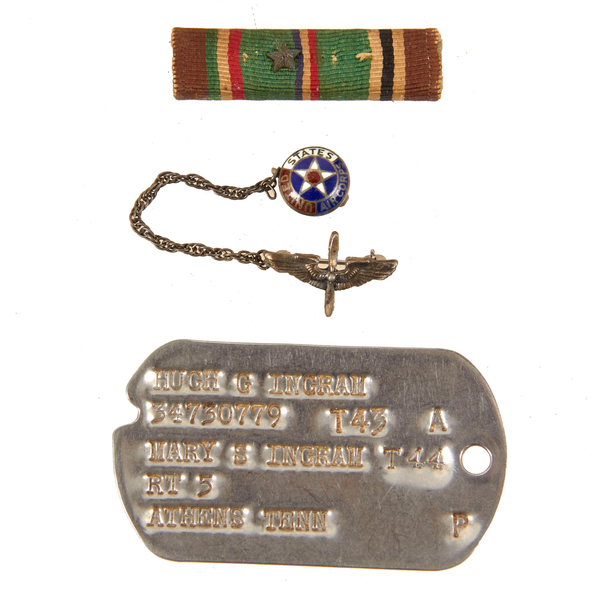 Original Items. One-of-a-Kind Group. This is the ordnance watch and dog tag grouping of Hugh G. Ingram of the Army Air Forces. Ingram enlisted on April 17th, 1943, but we can’t find very much information on his service. The group includes a set of Sterling Aerial Gunner Wings which are etched on the rear with ELLIS 15126468, identifying them to another member of the AAF, Ray C Ellis. We aren’t sure if they served together, but there is more research to be done.