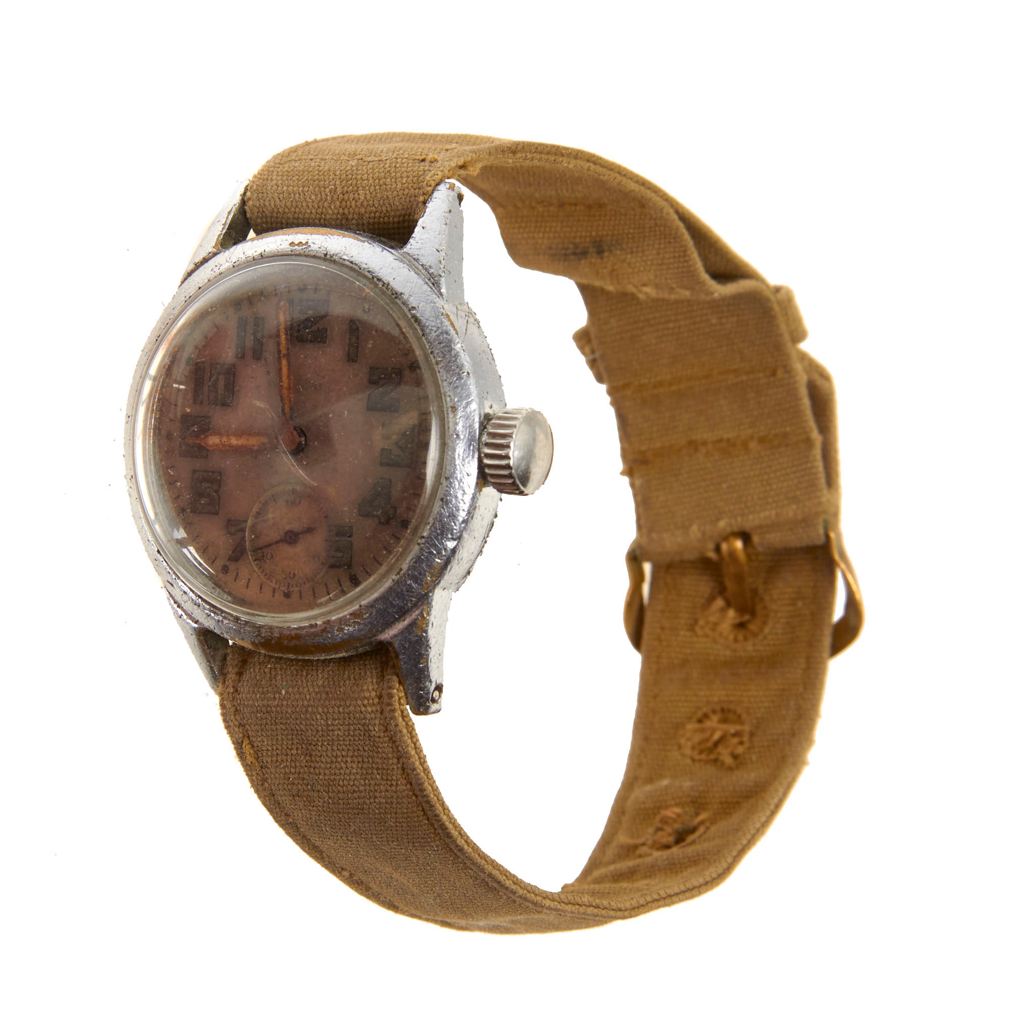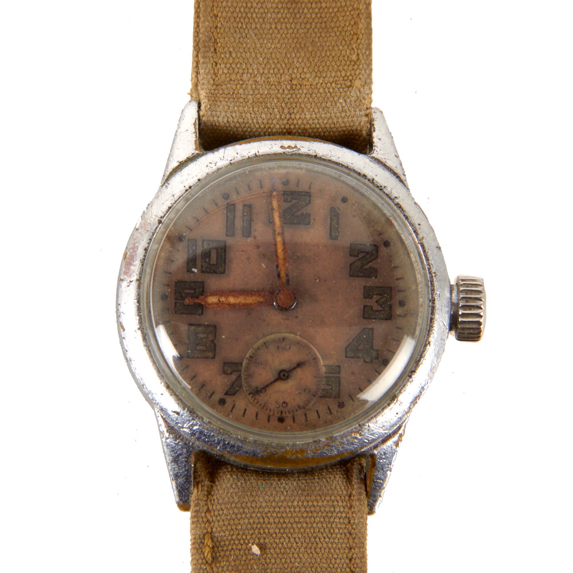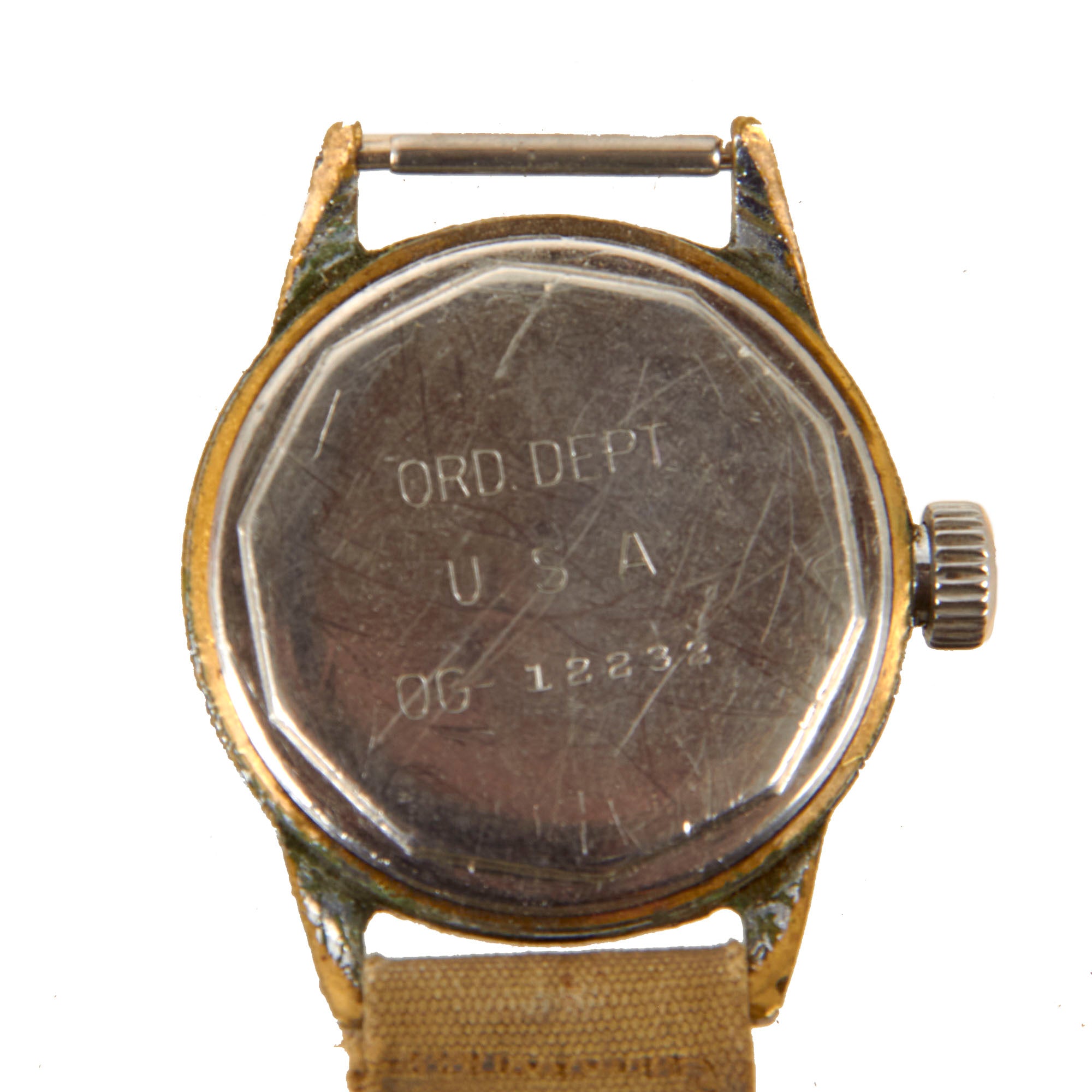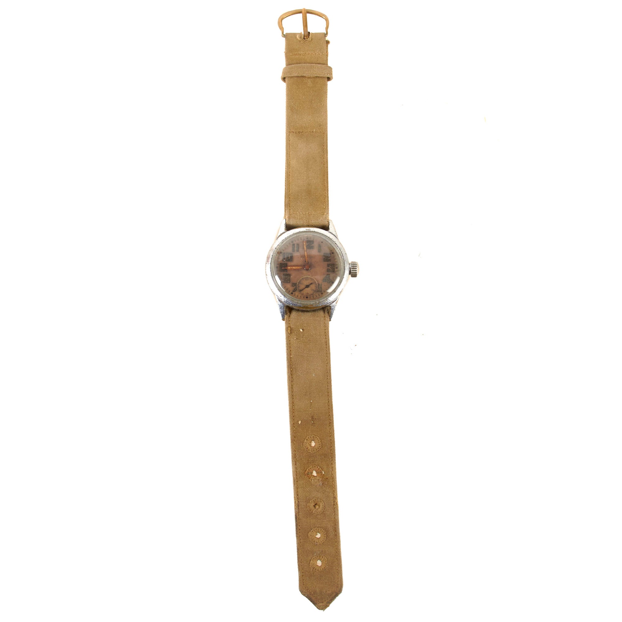 The ordnance watch is not marked by a maker, but still runs as far as we can tell, however we can not guarantee that it will keep good time and not stop occasionally. It has what appears to be the original band, and it is stamped on the back: