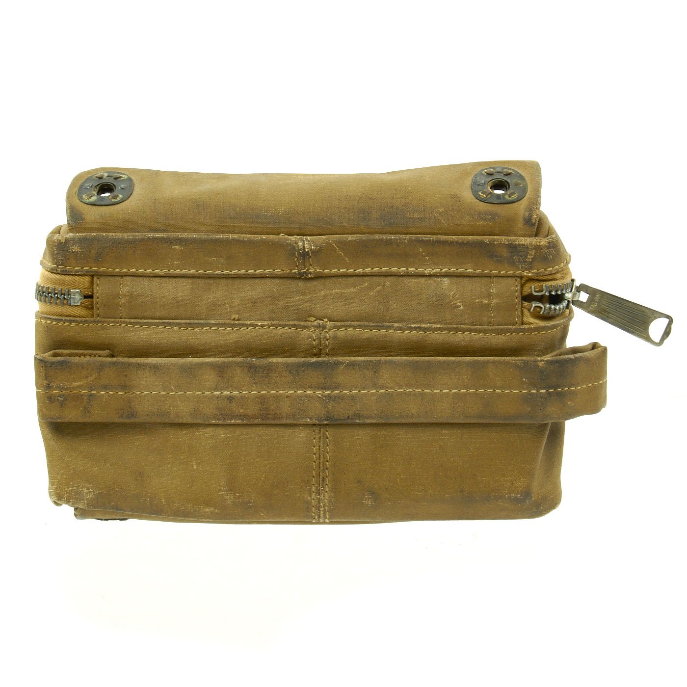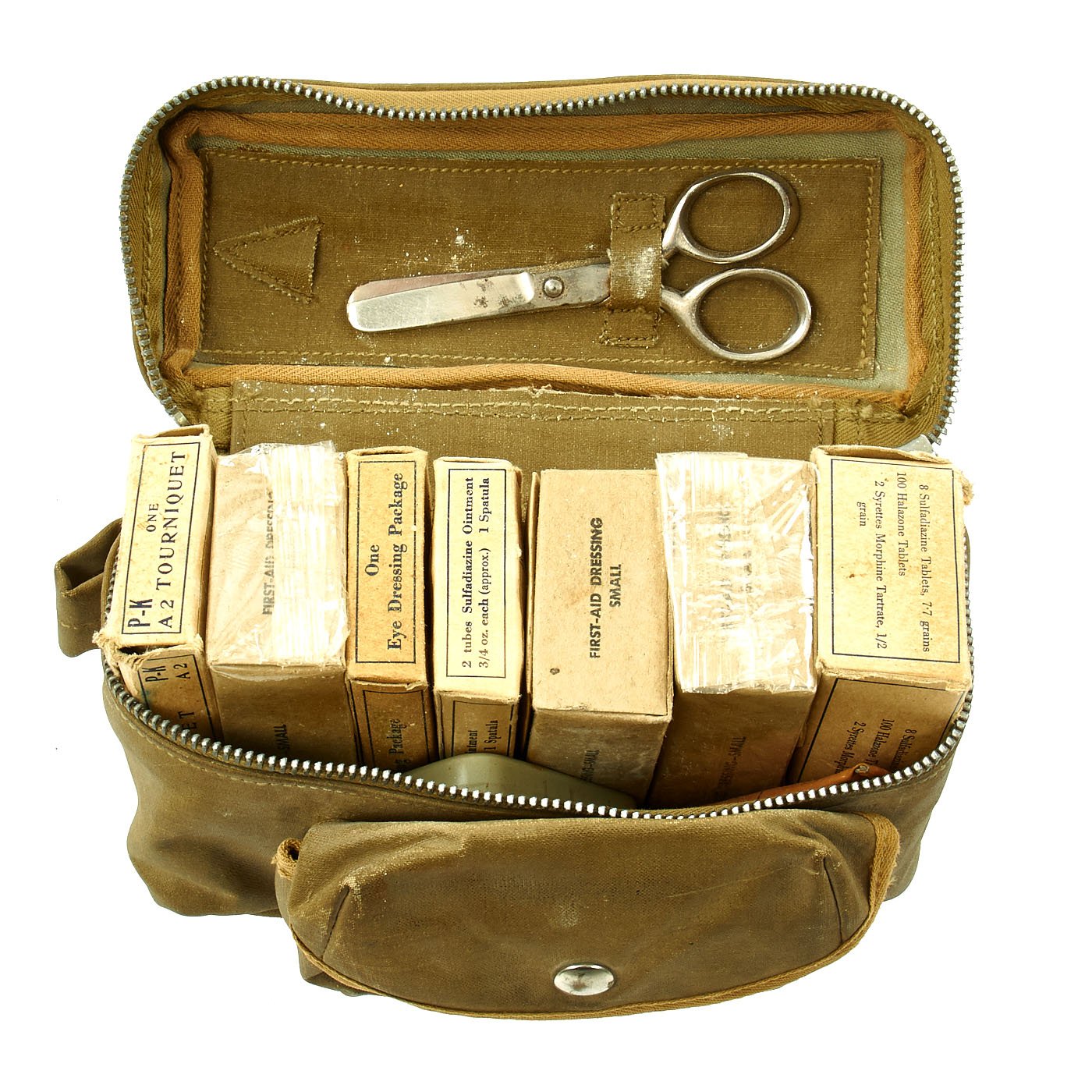 Original Items: Only One Available. This is an exceptionally rare complete Aeronautical First-Aid Kit. During WWII all military aircraft carried first aid equipment. This example is made of coated canvas, which helped protect and maintain the viability of the contents.