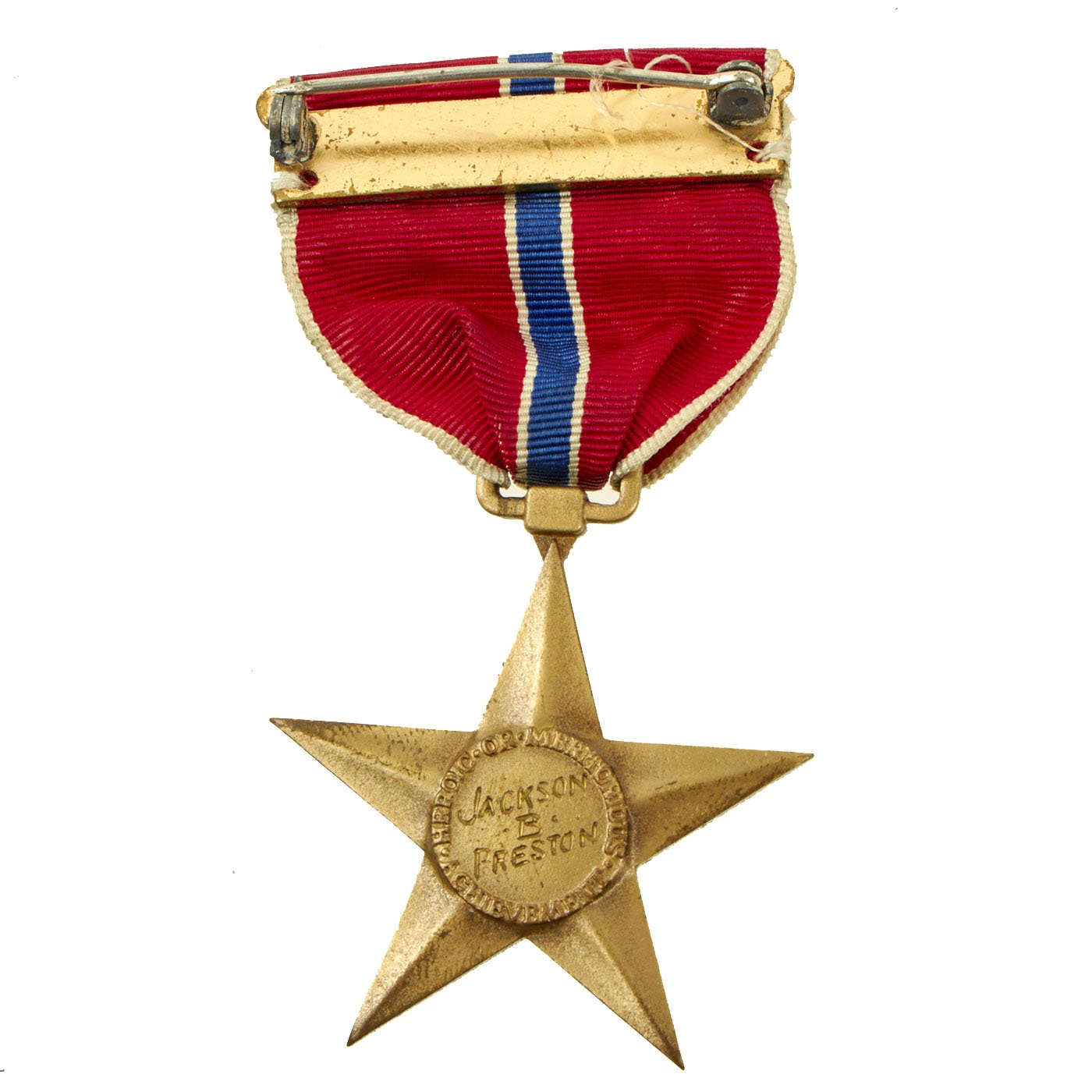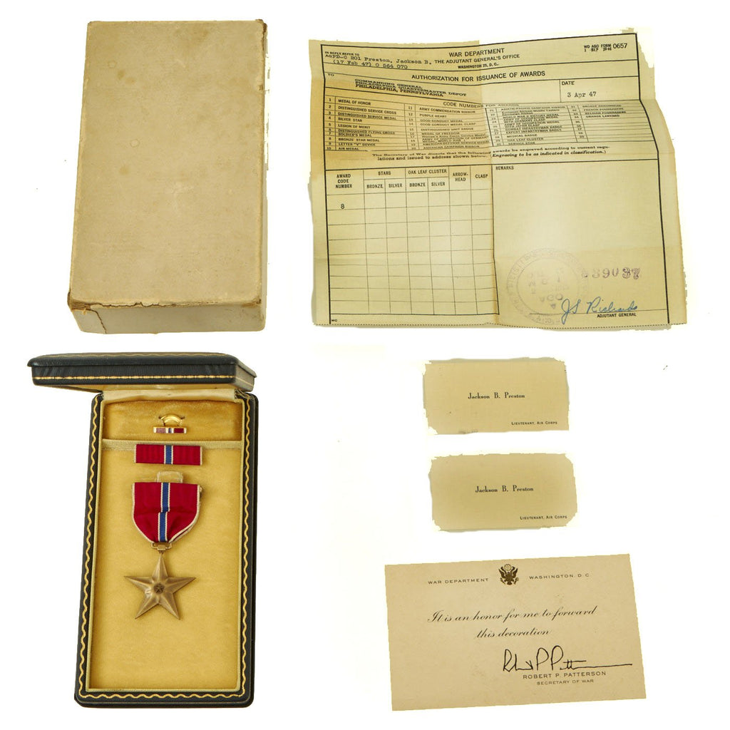 - Original Items; Only One Set Available. Lieutenant Jackson B. Preston served in the Air Corps during World War Two and earned a Bronze Star Medal. The reverse side of the medal is period engraved. The medal comes with the original case, 1947 Authorization For Issuance of Awards Certificate named to Lt. Preston, Air Corps business cards, and decoration card with autopen signature from the Secretary of War, Robert P. Patterson.