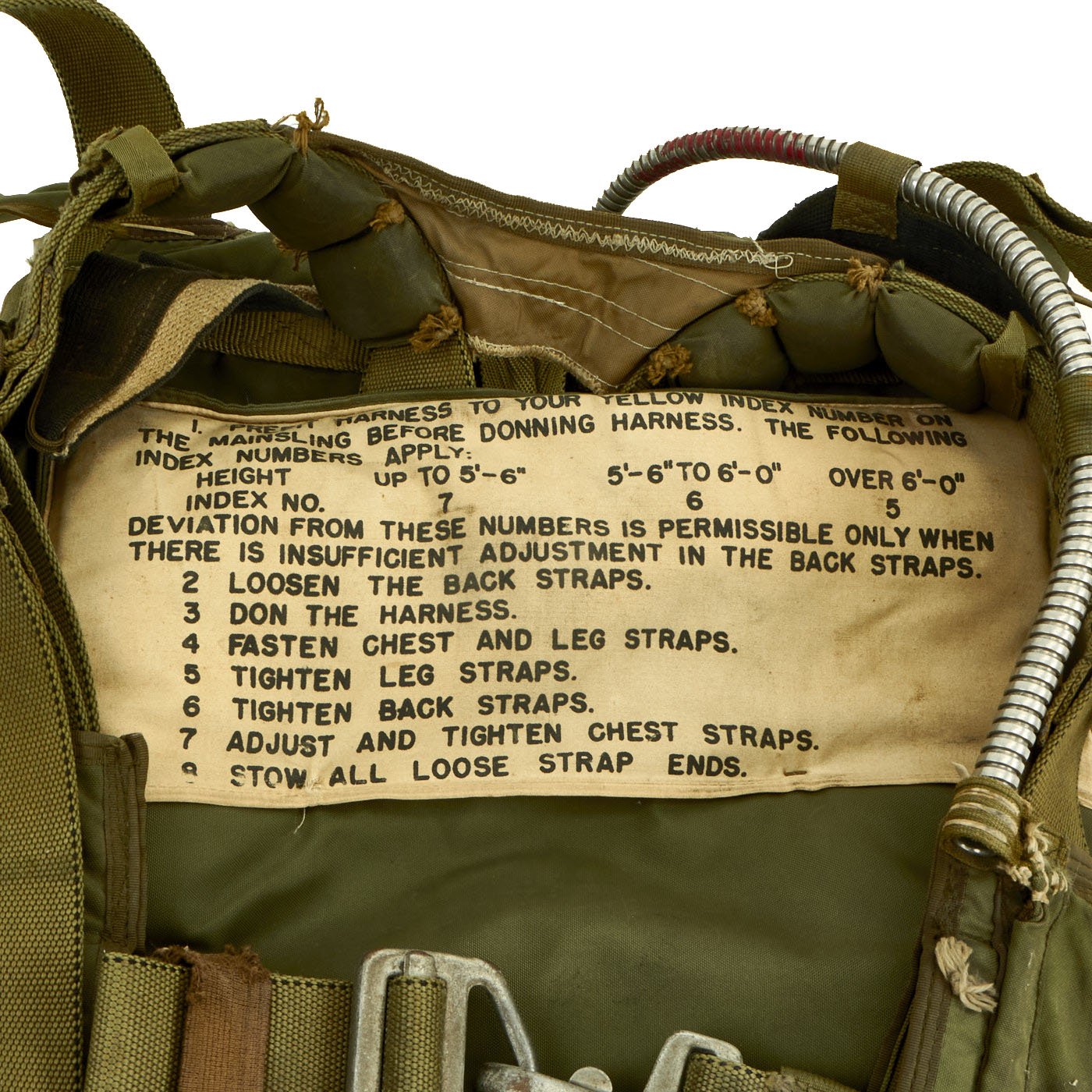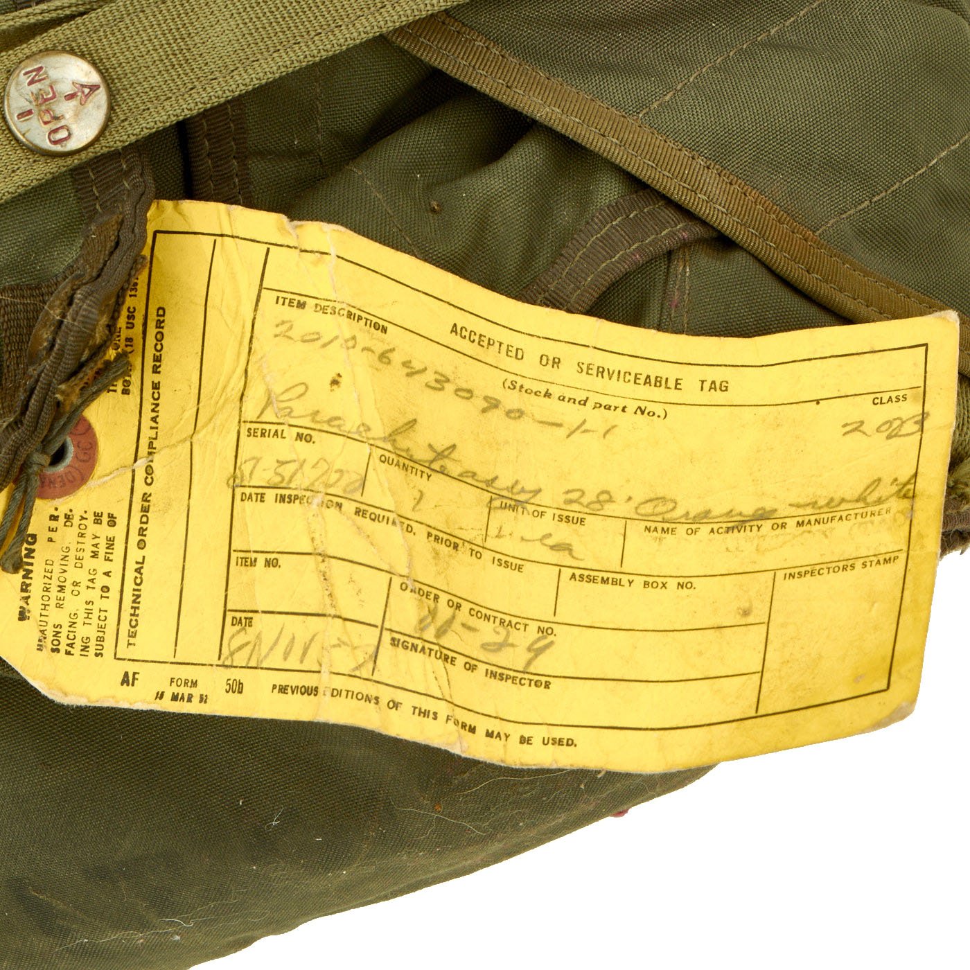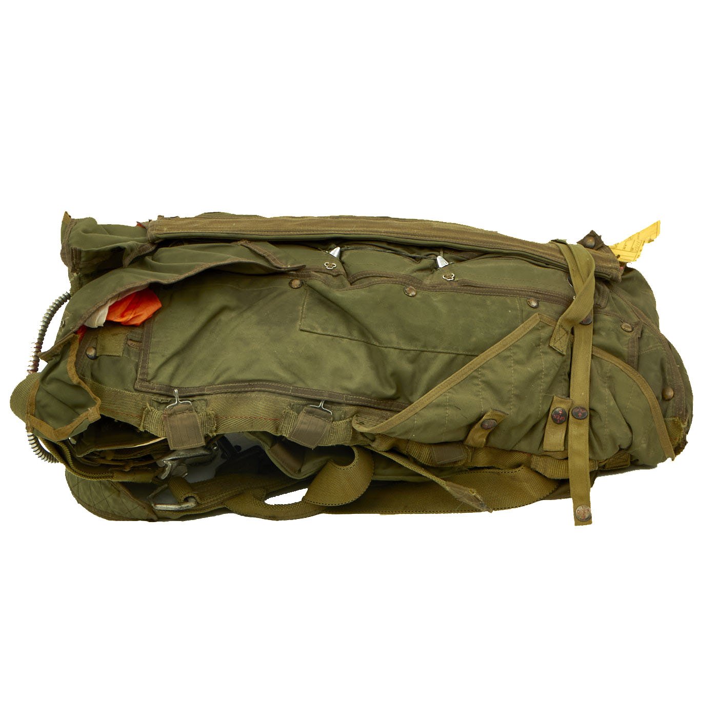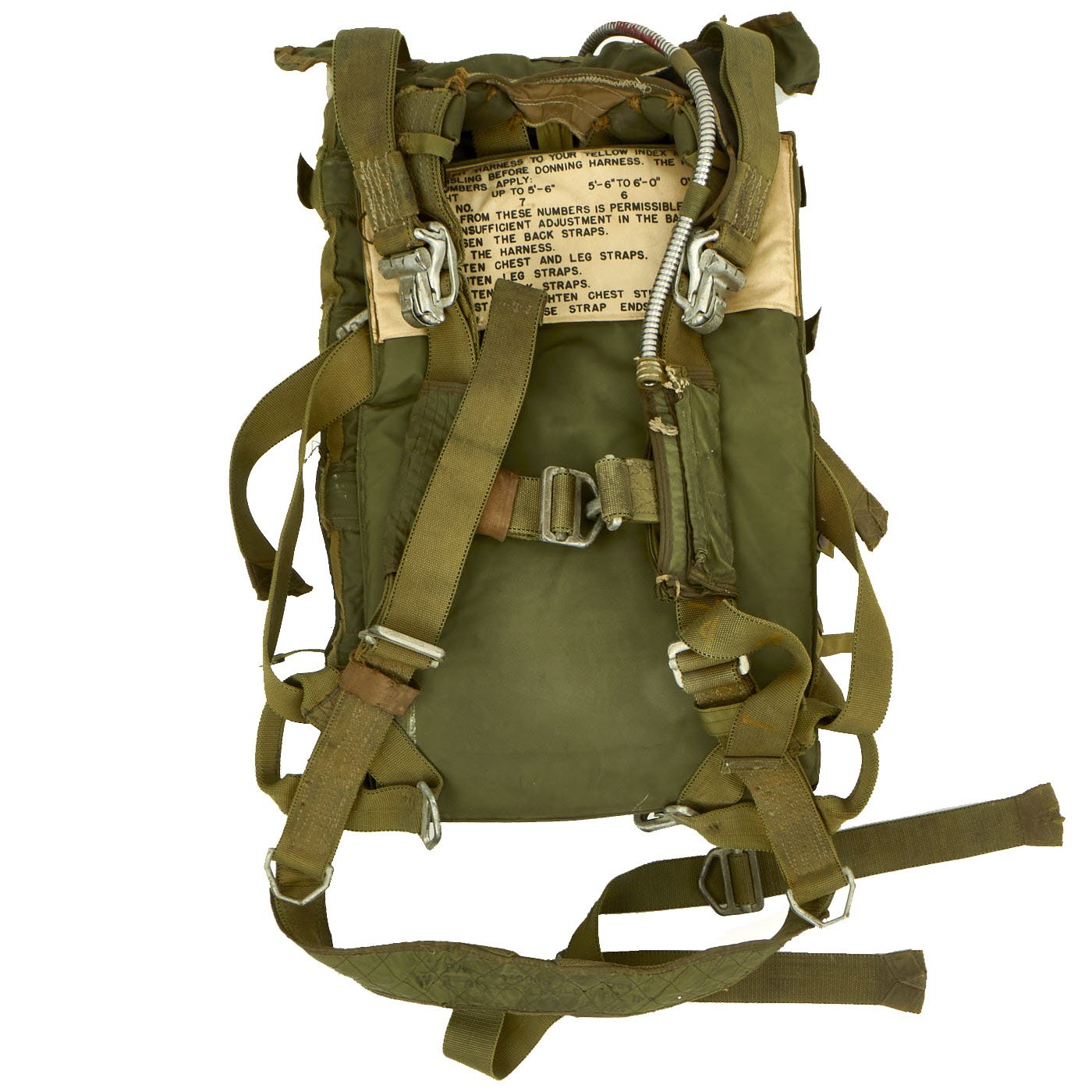 Original Item: Only One Available. Pack Part number 50J6876 dated May, 1951. This is a complete assembly with harness and orange/white nylon parachute canopy. Harness comes with its original log book with entries dating from 1951 through 1957. Some markings on the assembly are present but illegible, while the date is.