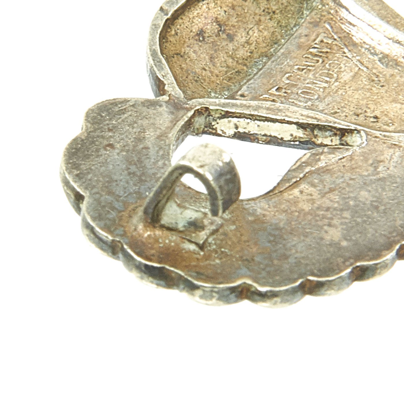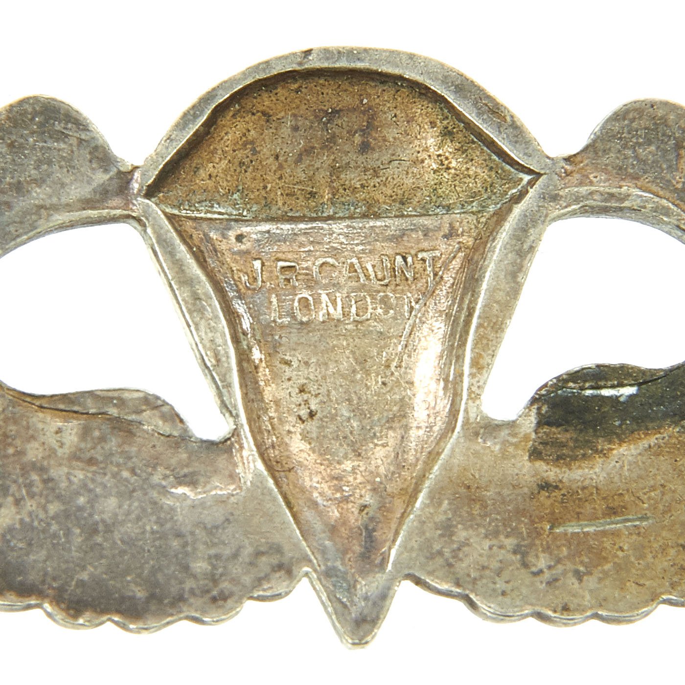 • Original Item: Only One Available. This is an exceptionally rare set of British-Made Silver Airborne jump wings with a pin back fastener. The reverse is stamped with J.R. GAUNT / LONDON on the inside of the parachute. During WWII U.S. forces were stationed in Britain for some time prior to the D-Day invasion, and as such local businesses started to supply items, as it was much easier than having them shipped from the U.S. The wings have a lovely pin back, which is fully functional.