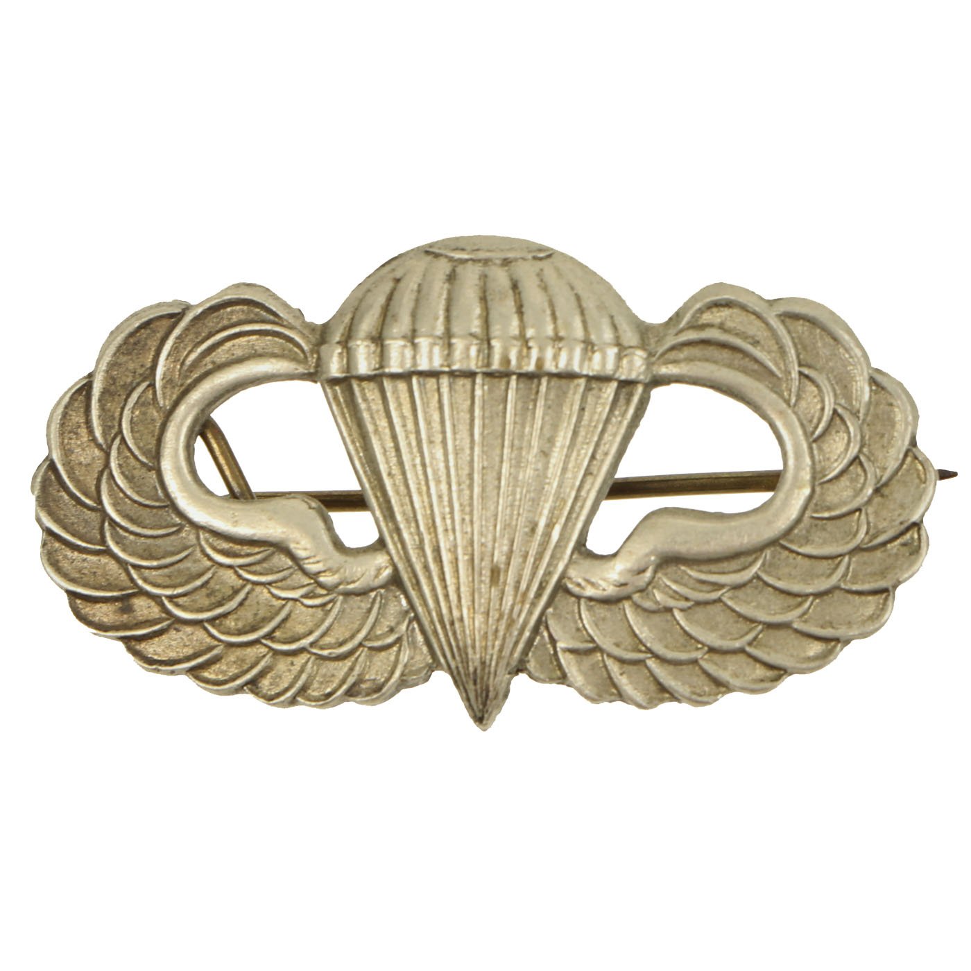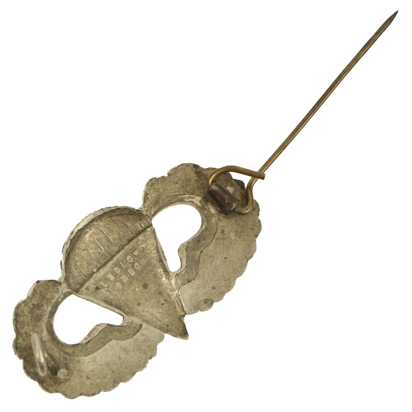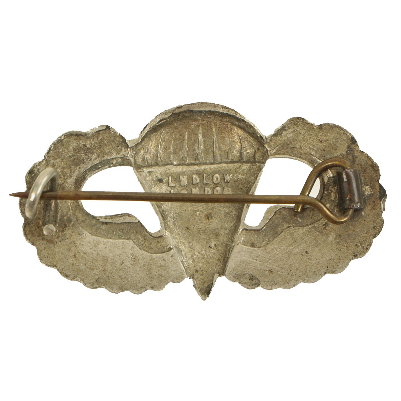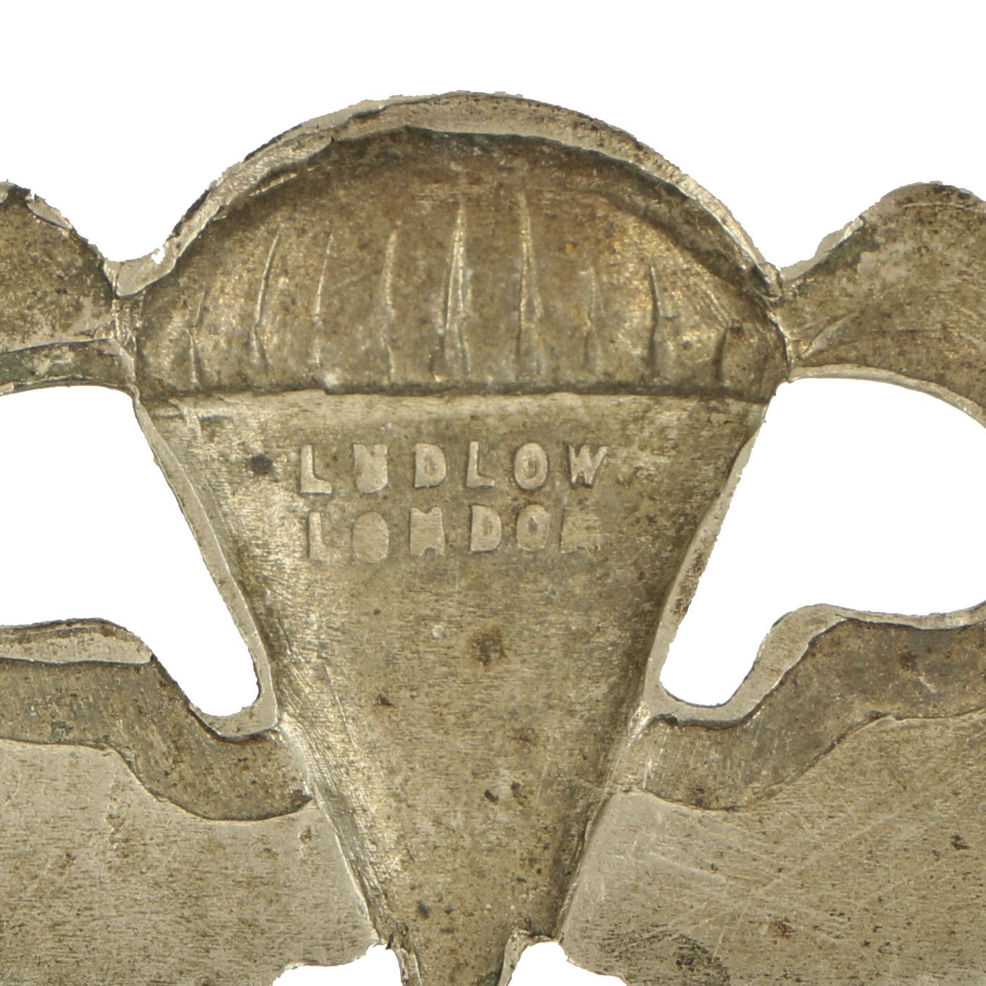 Original Item: Only One Available. This is an exceptionally rare set of British-Made Silver Airborne jump wings with a pin back fastener. The reverse is marked with LUDLOW / LONDON on the inside of the parachute. During WWII U.S. forces were stationed in Britain for some time prior to the D-Day invasion, and as such local businesses started to supply items, as it was much easier than having them shipped from the U.S. The wings have a lovely pin back, which is fully functional.