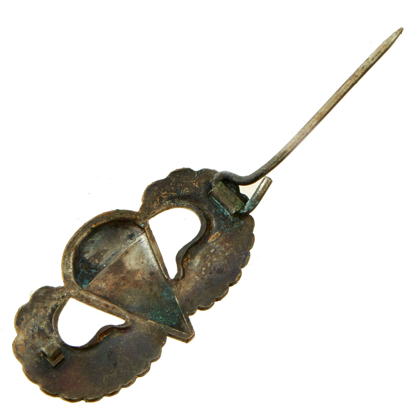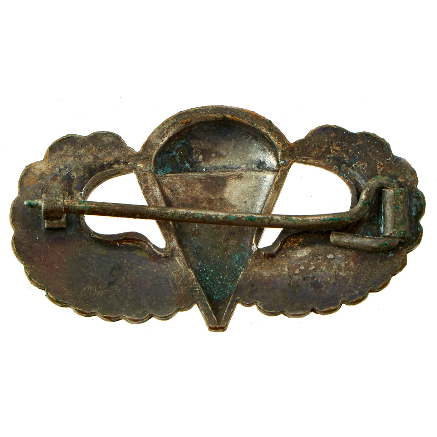 Original Item: Only One Available. This is an exceptionally rare set of British-Made silver washed brass Airborne jump wings with a pin back fastener. During WWII U.S. forces were stationed in Britain for some time prior to the D-Day invasion, and as such local businesses started to supply items, as it was much easier than having them shipped from the U.S.. American Made wings are marked, but those made in England often were not, such as this example. The wings retain a little of the silver wash.