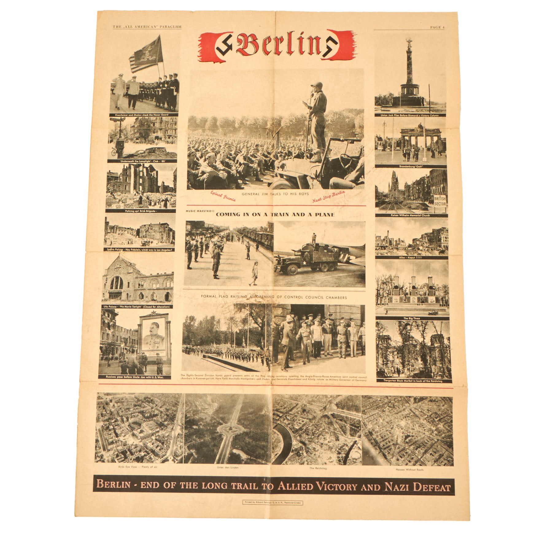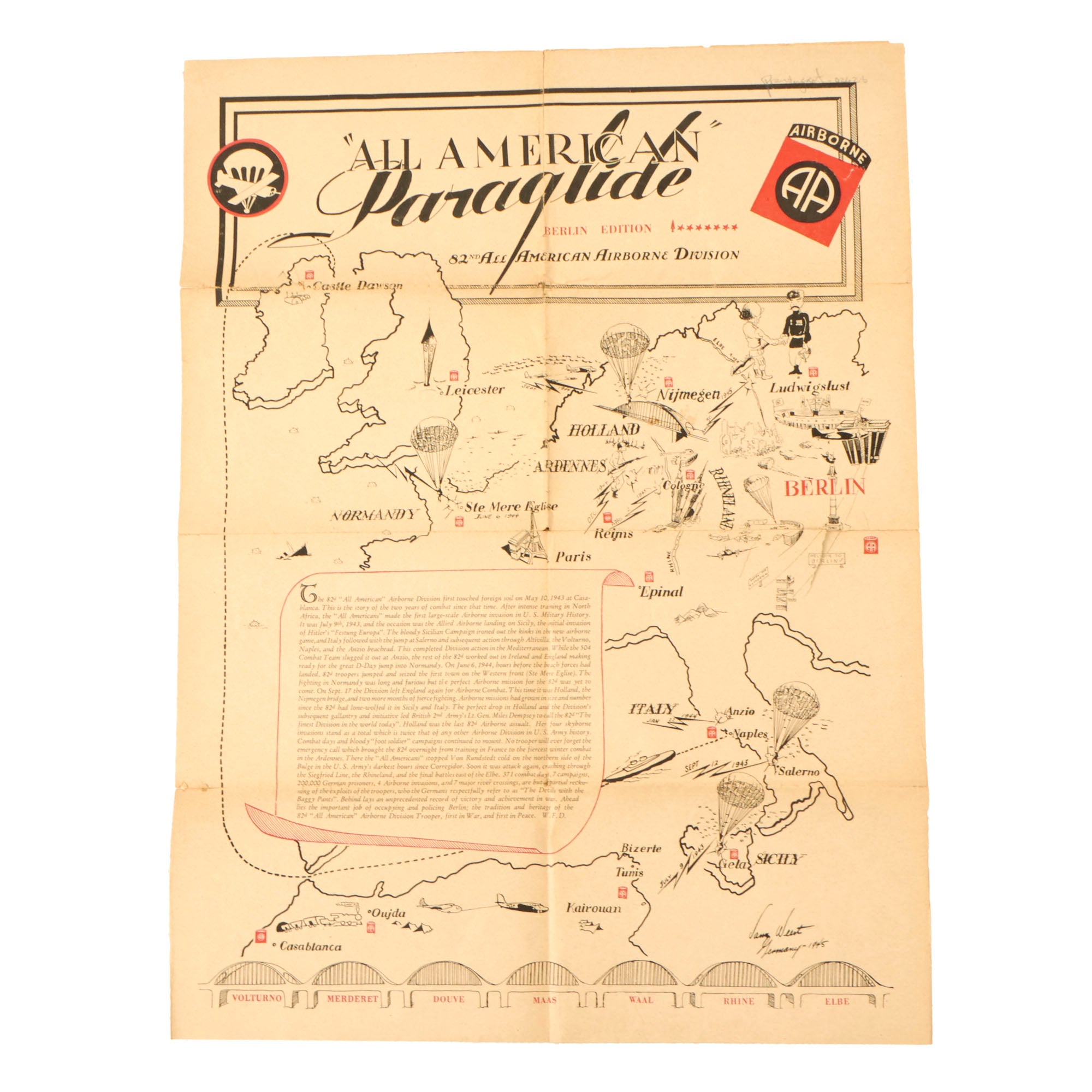 - Berlin Edition of the “All American Paraglide” magazine, heavily folded and tearing. Shows map of where men of the 82nd landed.