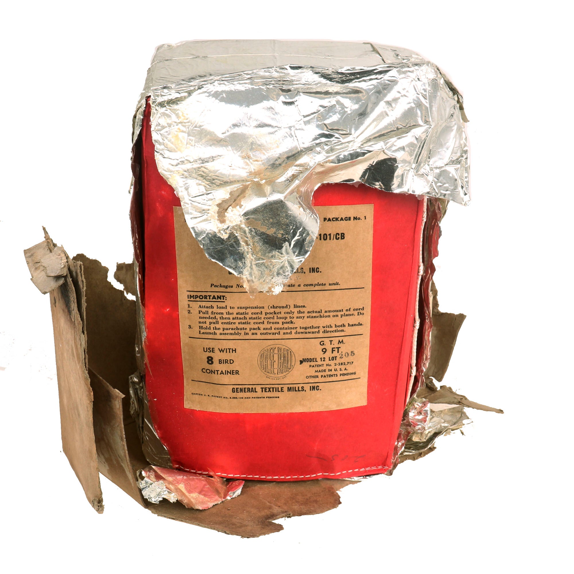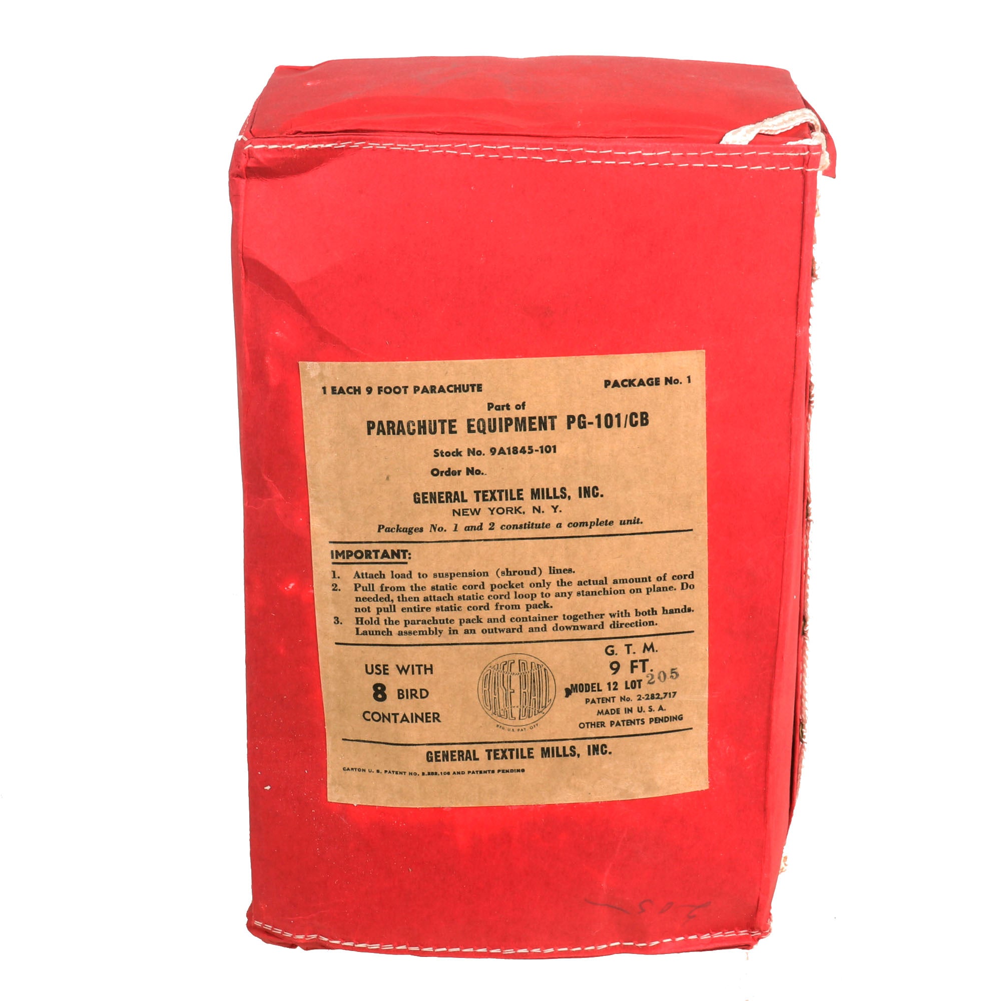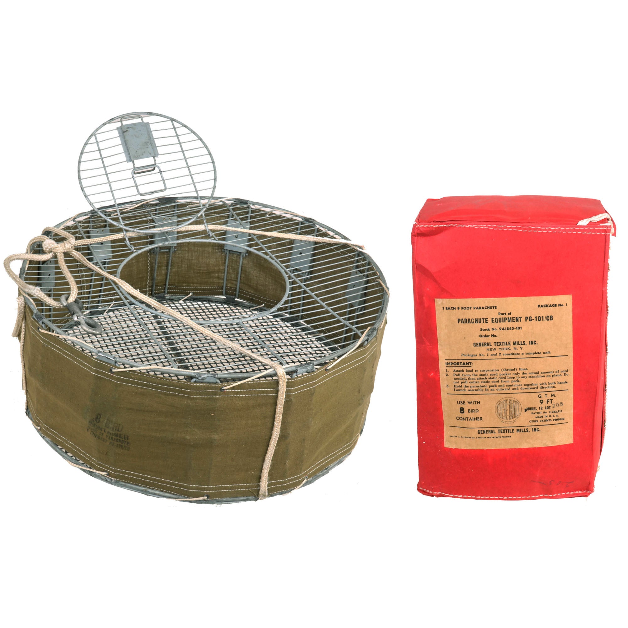 The cage is in fantastic condition with almost no flaws. The cased parachute comes in its original cardboard and reflective casing. The parachute reads 1 EACH 9 FOOT PARACHUTE PACKAGE NO 1. PART OF PARACHUTE EQUIPMENT PG-101 / CB STOCK NO. 9A1845-101. FOR USE WITH 8 BIRD CONTAINER. It is nearly impossible to find these cages in such perfect condition with their original cased parachute. You likely won’t see one like it again, don’t miss it!