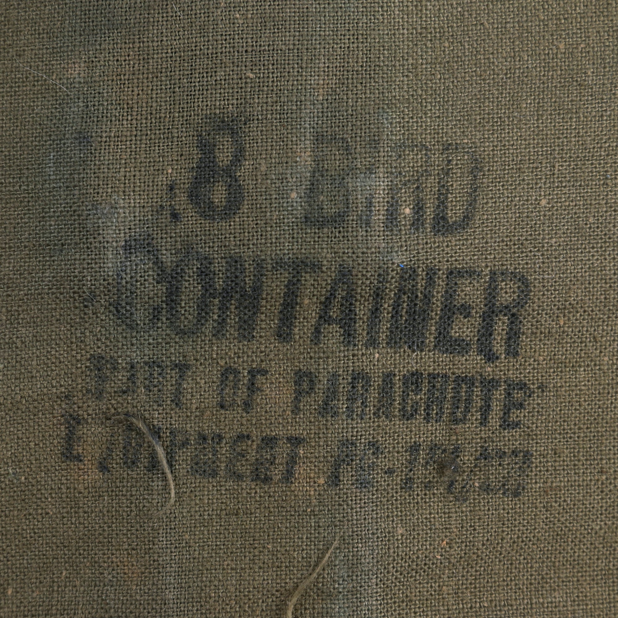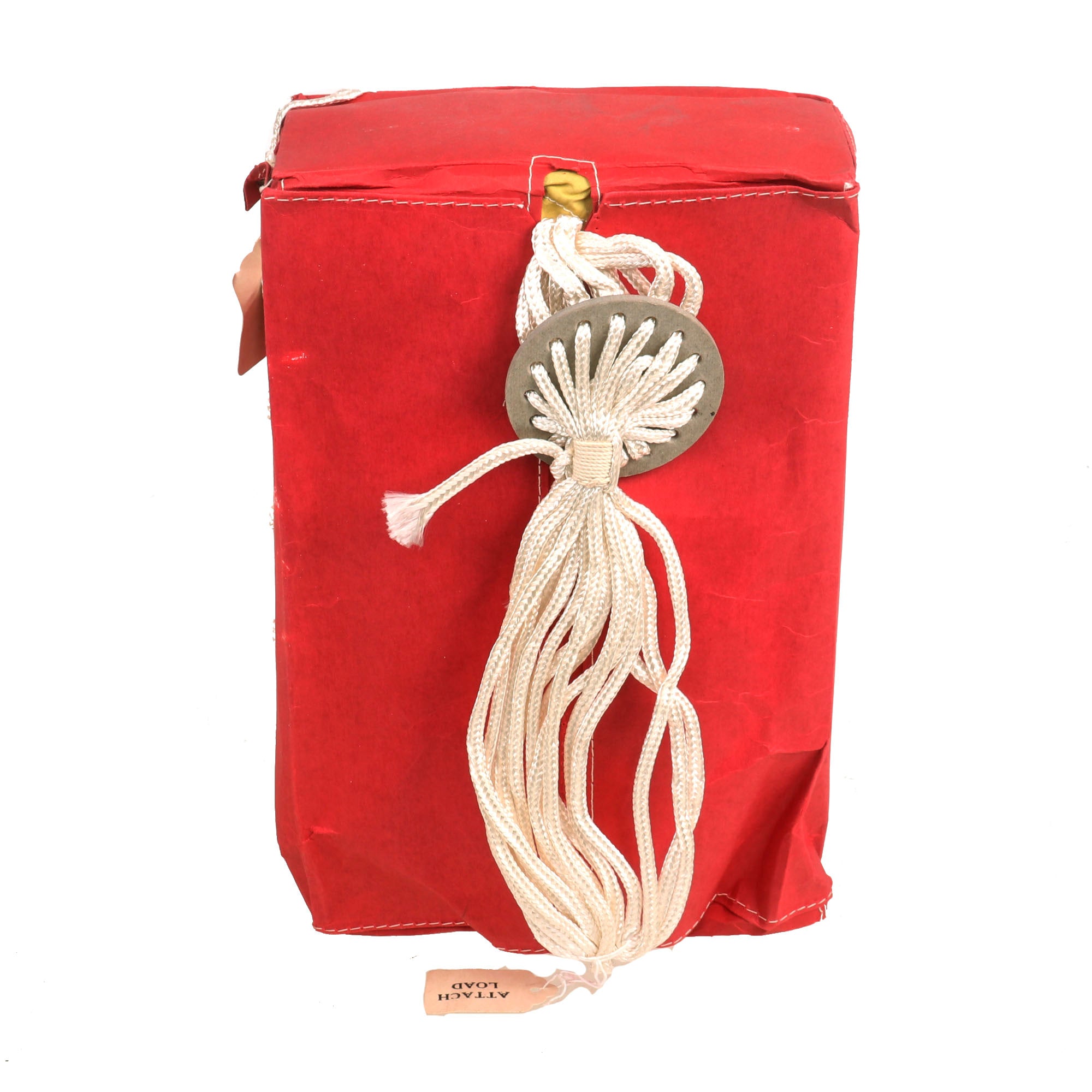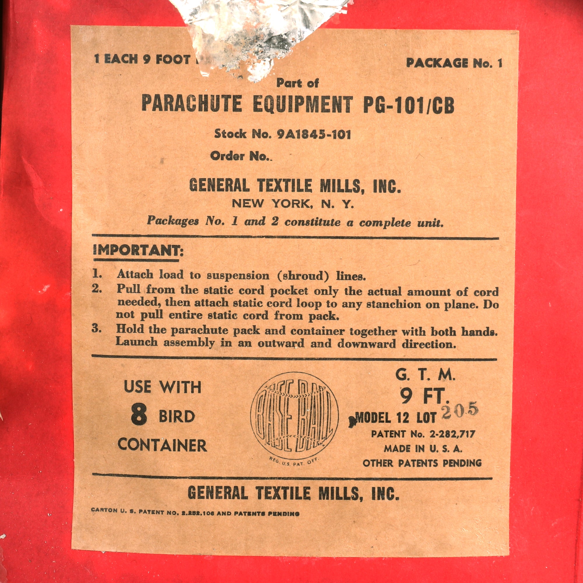 The cage is in fantastic condition with almost no flaws. The cased parachute comes in its original cardboard and reflective casing. The parachute reads 1 EACH 9 FOOT PARACHUTE PACKAGE NO 1. PART OF PARACHUTE EQUIPMENT PG-101 / CB STOCK NO. 9A1845-101. FOR USE WITH 8 BIRD CONTAINER. It is nearly impossible to find these cages in such perfect condition with their original cased parachute. You likely won’t see one like it again, don’t miss it!