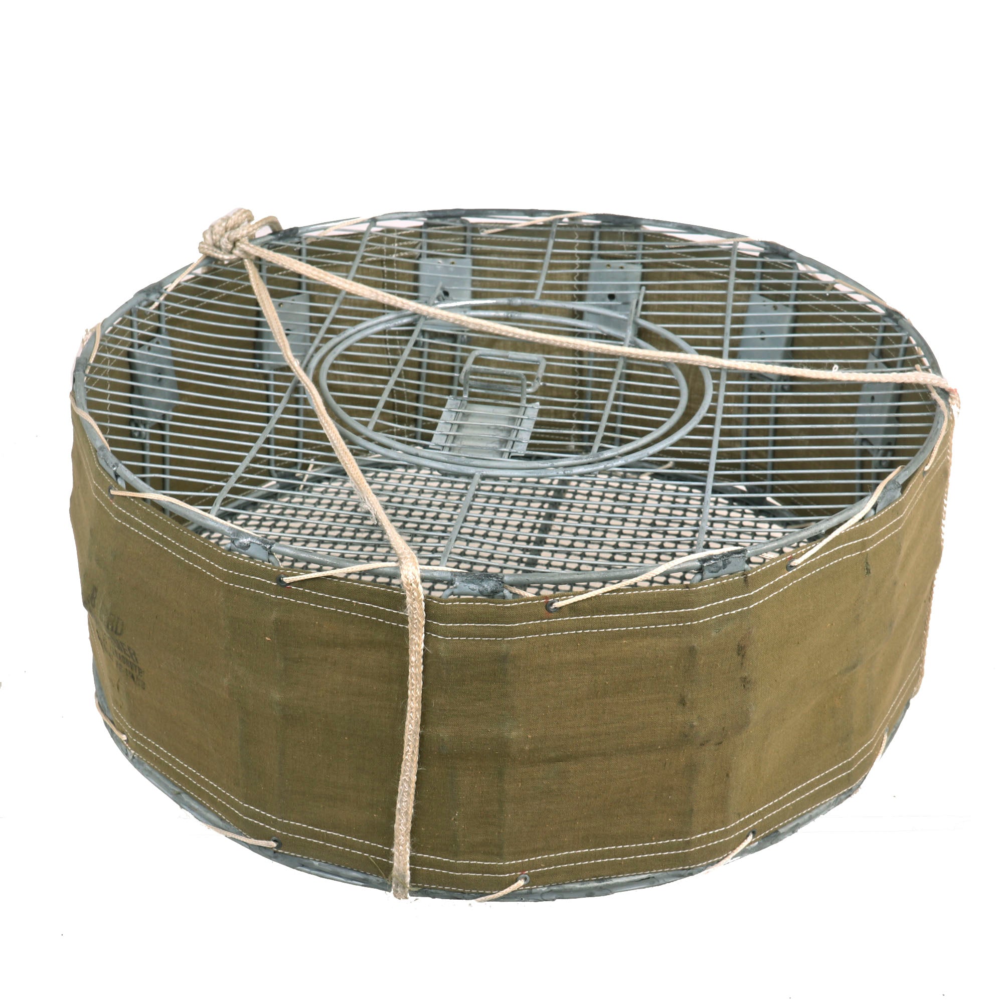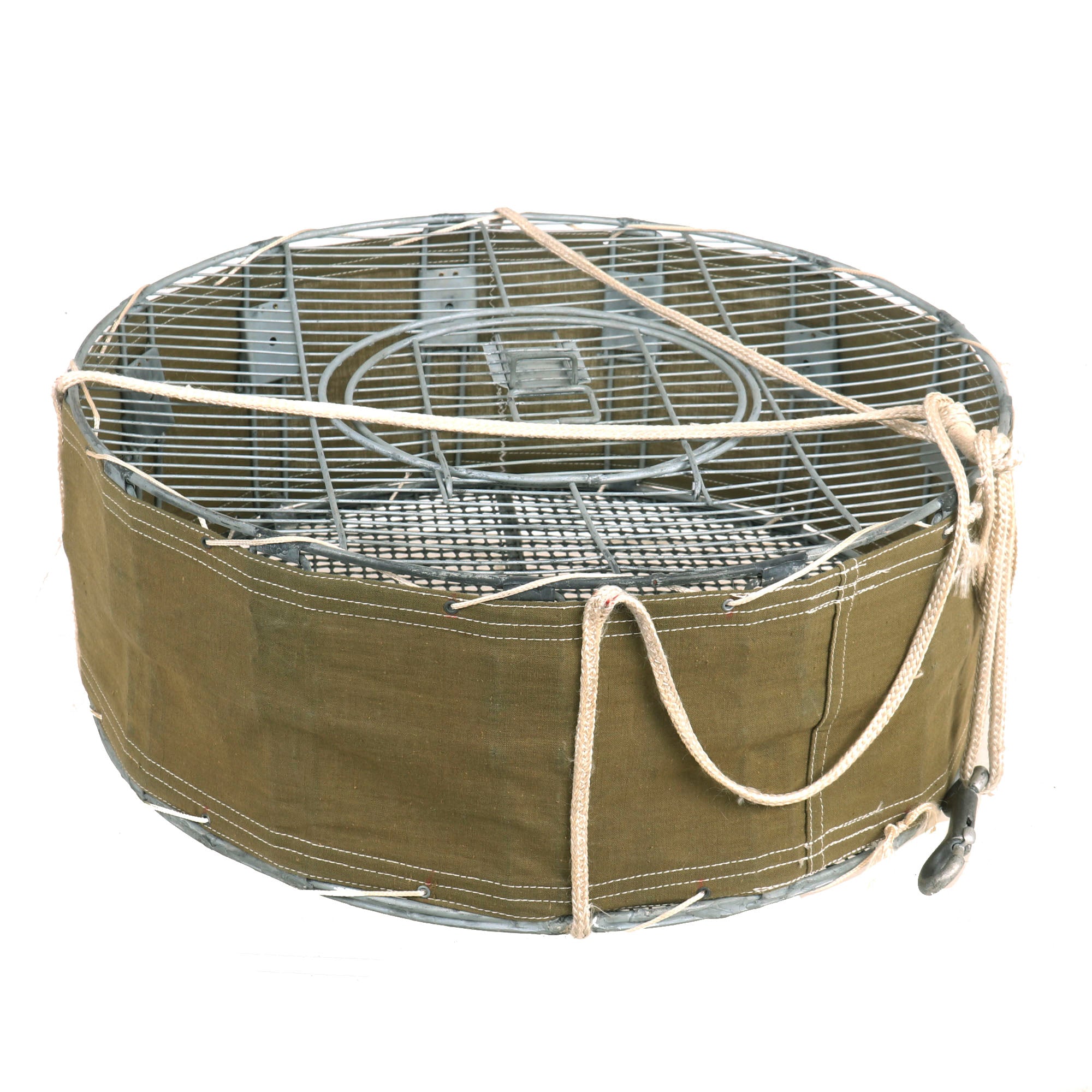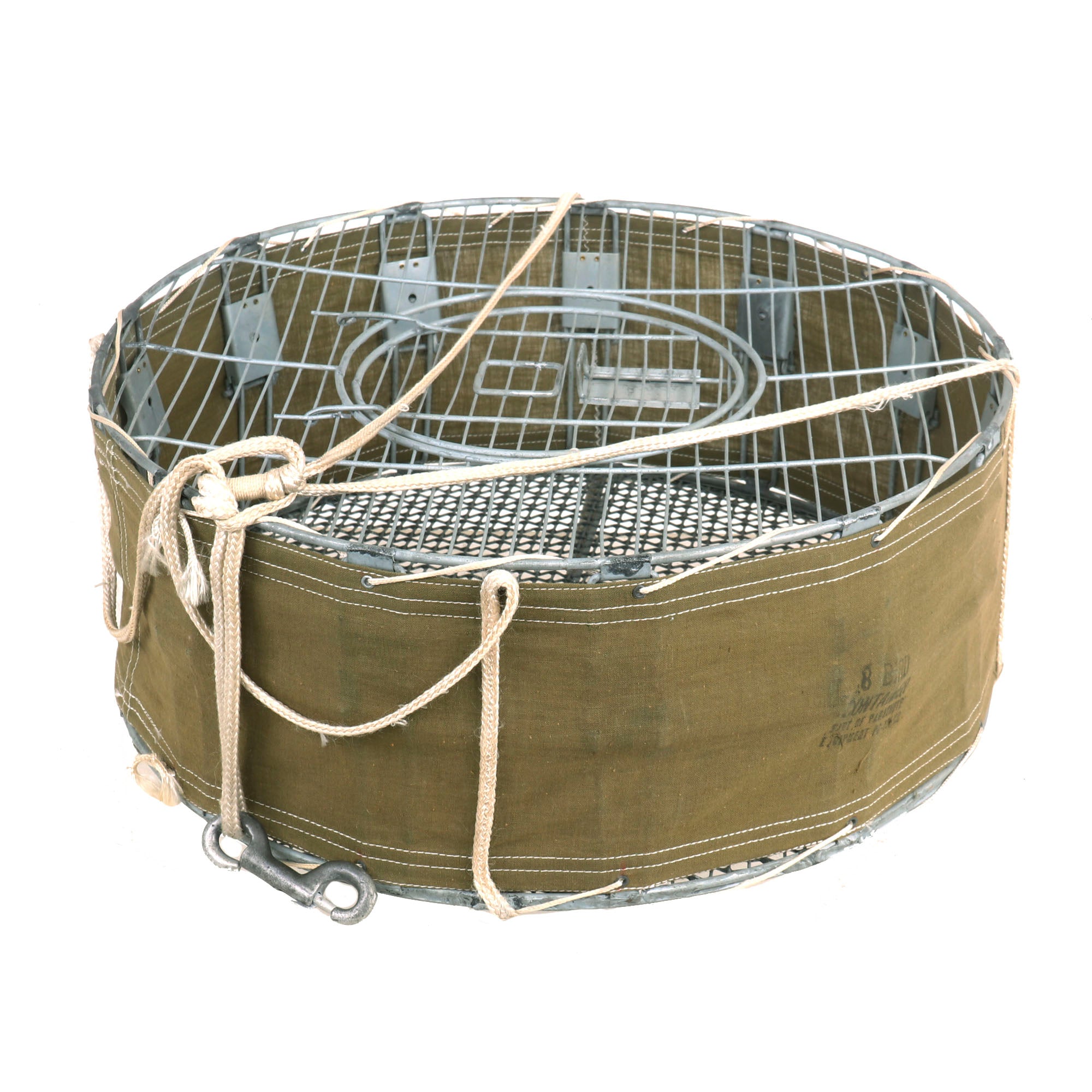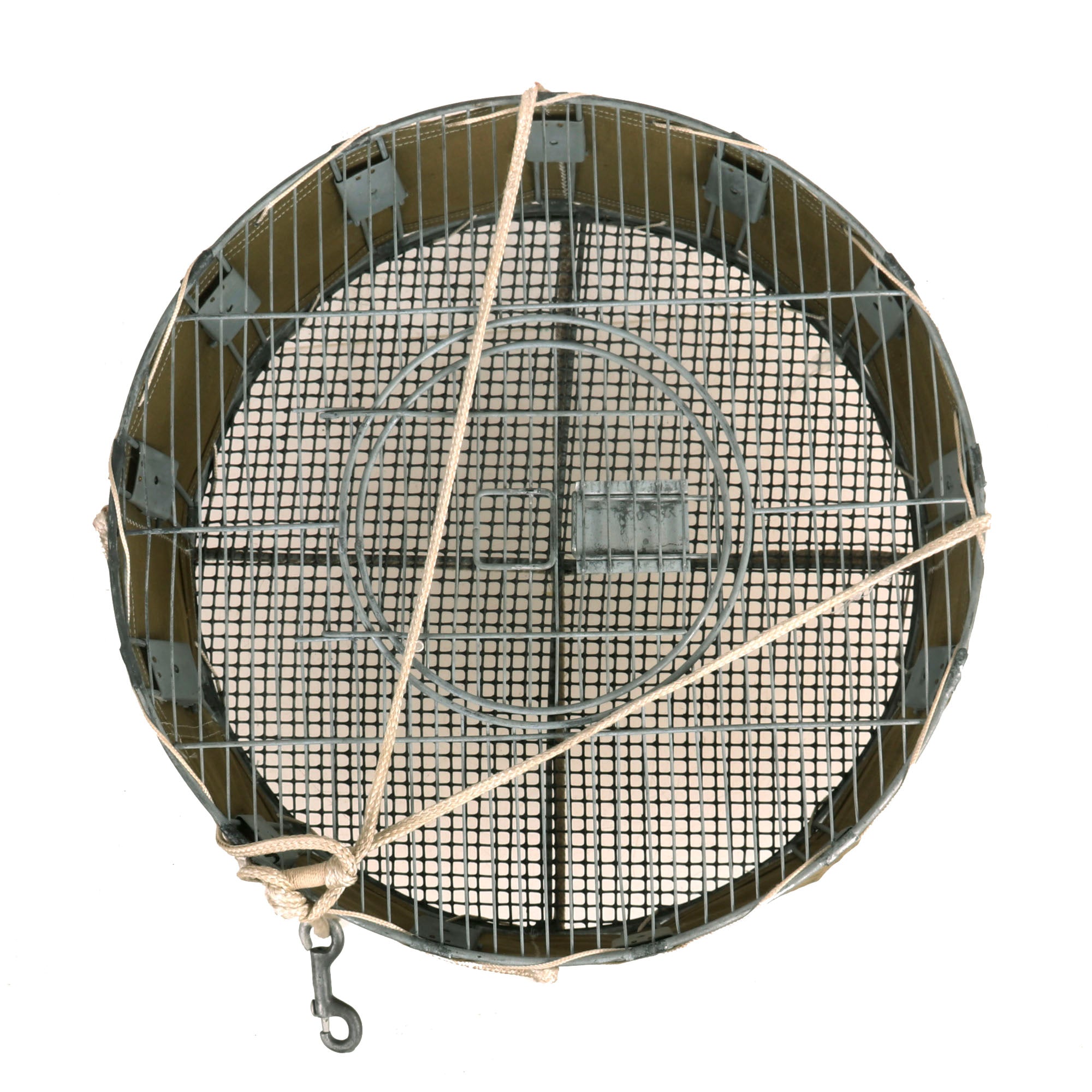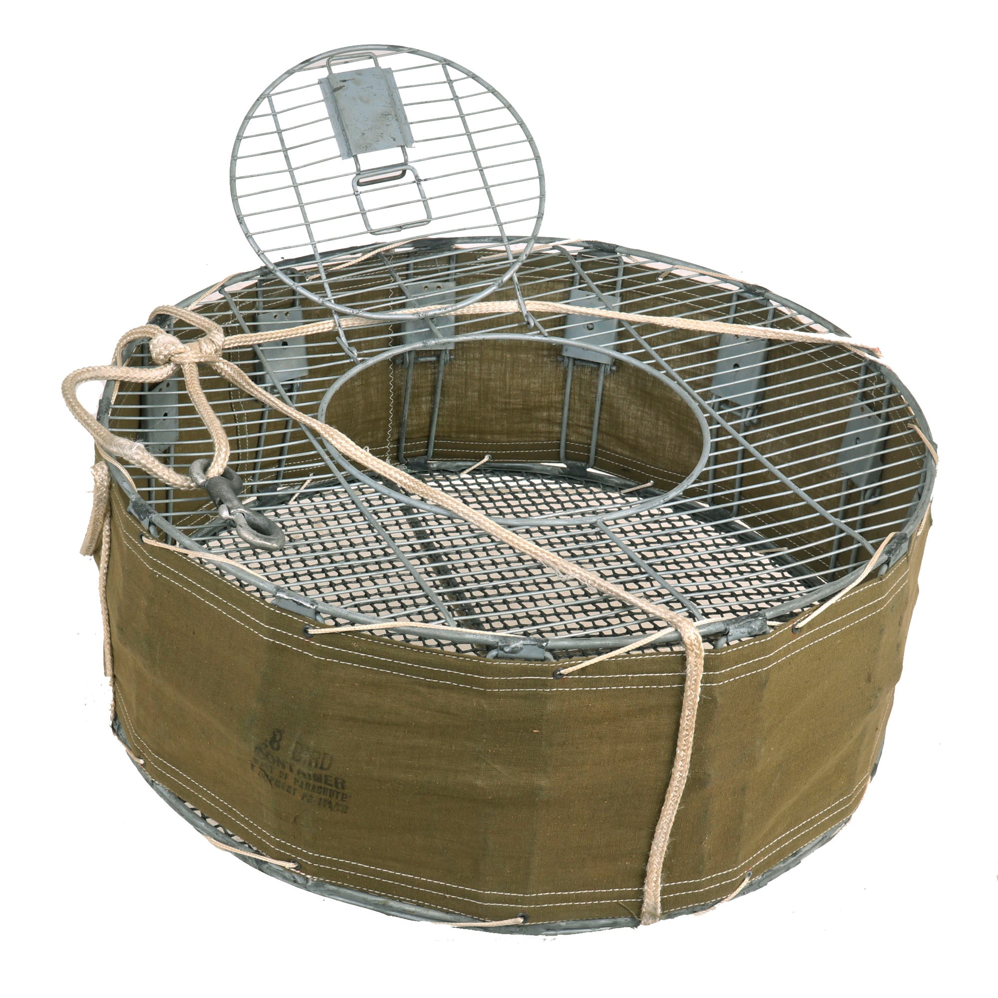 Original Item: Only One Available. This is an original WWII Airborne Signal Corps drop cage designed to carry eight homing pigeons and is complete with the hanging suspension lines, hook, and original white silk parachute. This specially designed cage allowed 8 birds to be safely dropped where needed. As long as the pilot followed procedures, the birds could reach their destination. This is the most complete and best condition example of these that we have ever encountered. It measures: 17 inches in diameter and is 7 inches tall. The side is ink stamped: