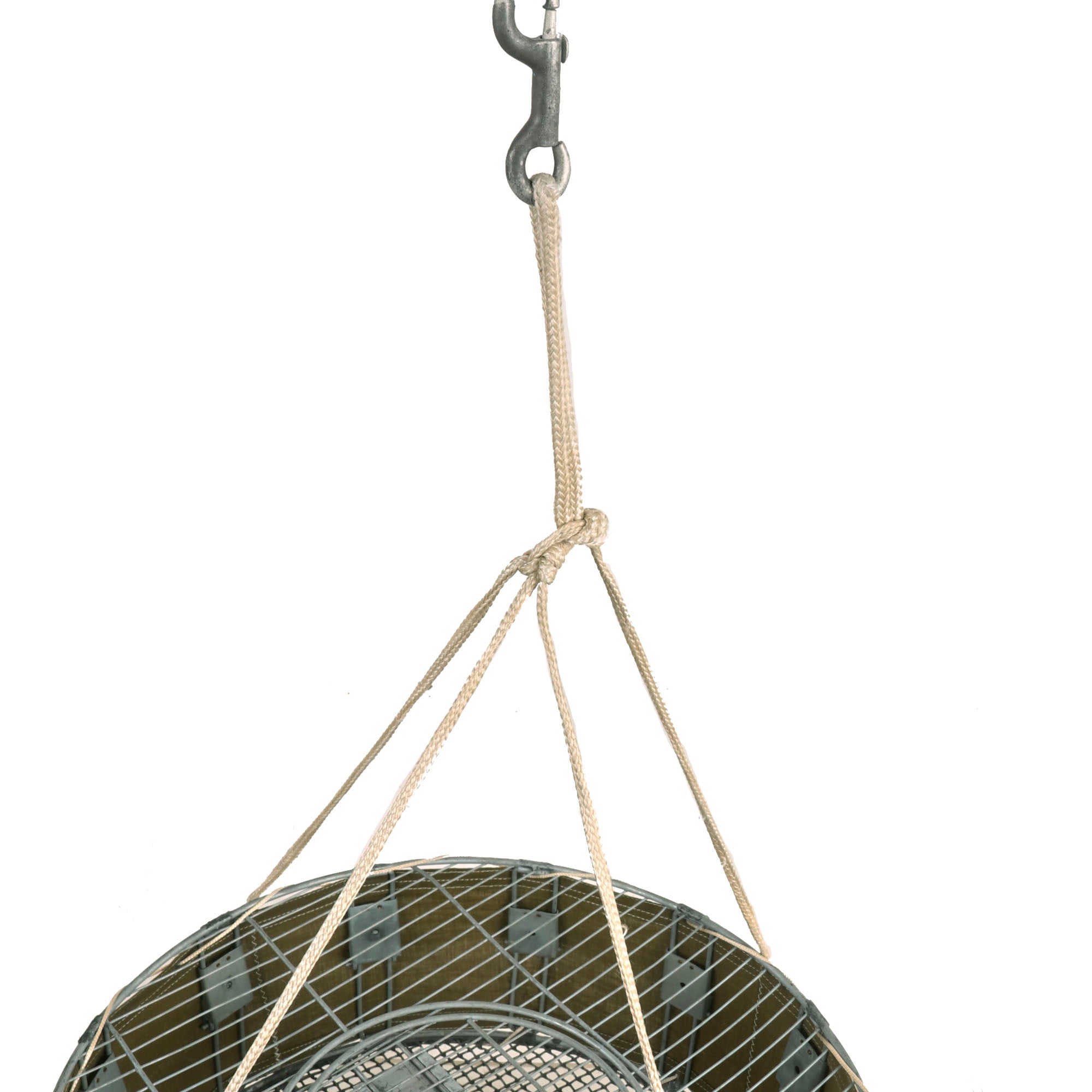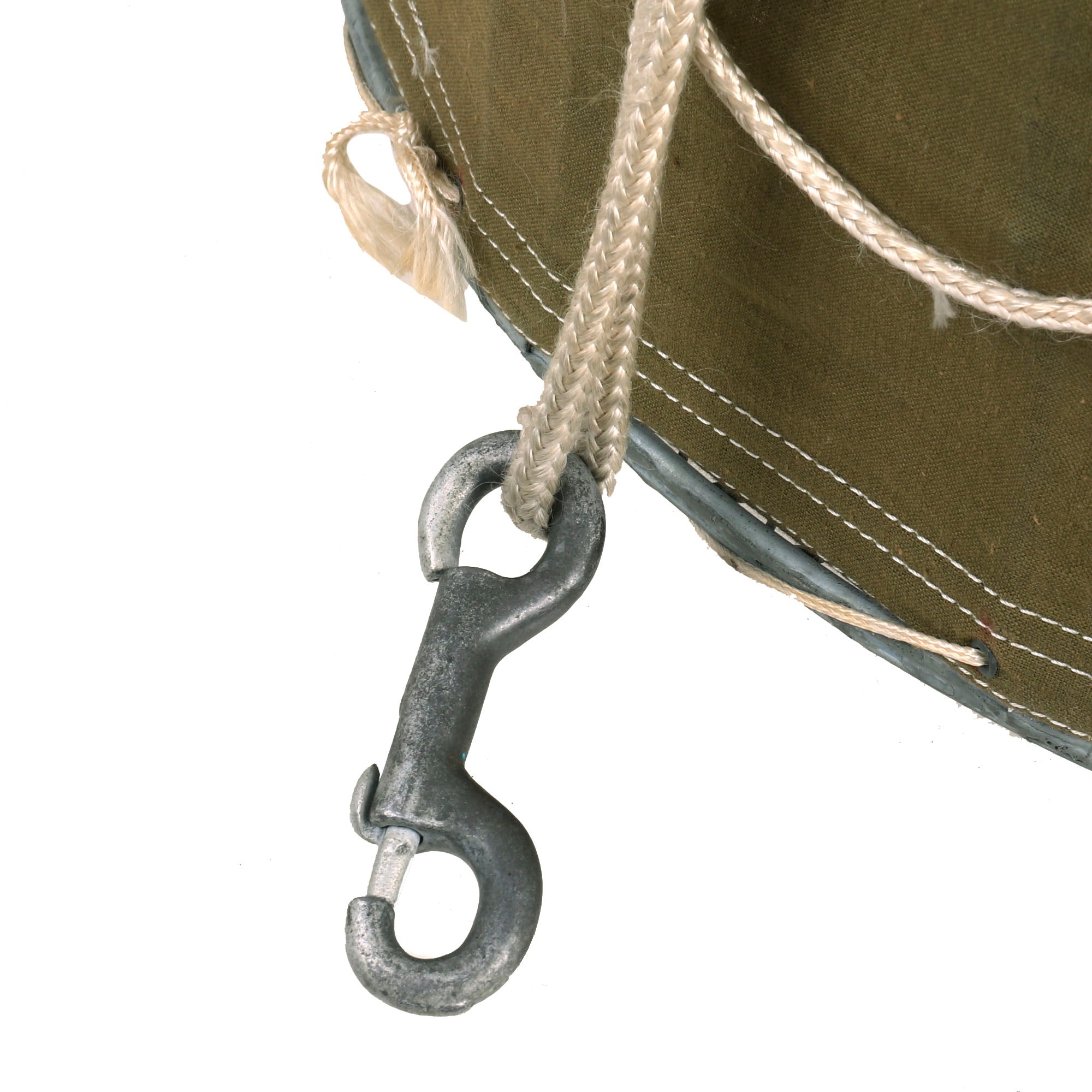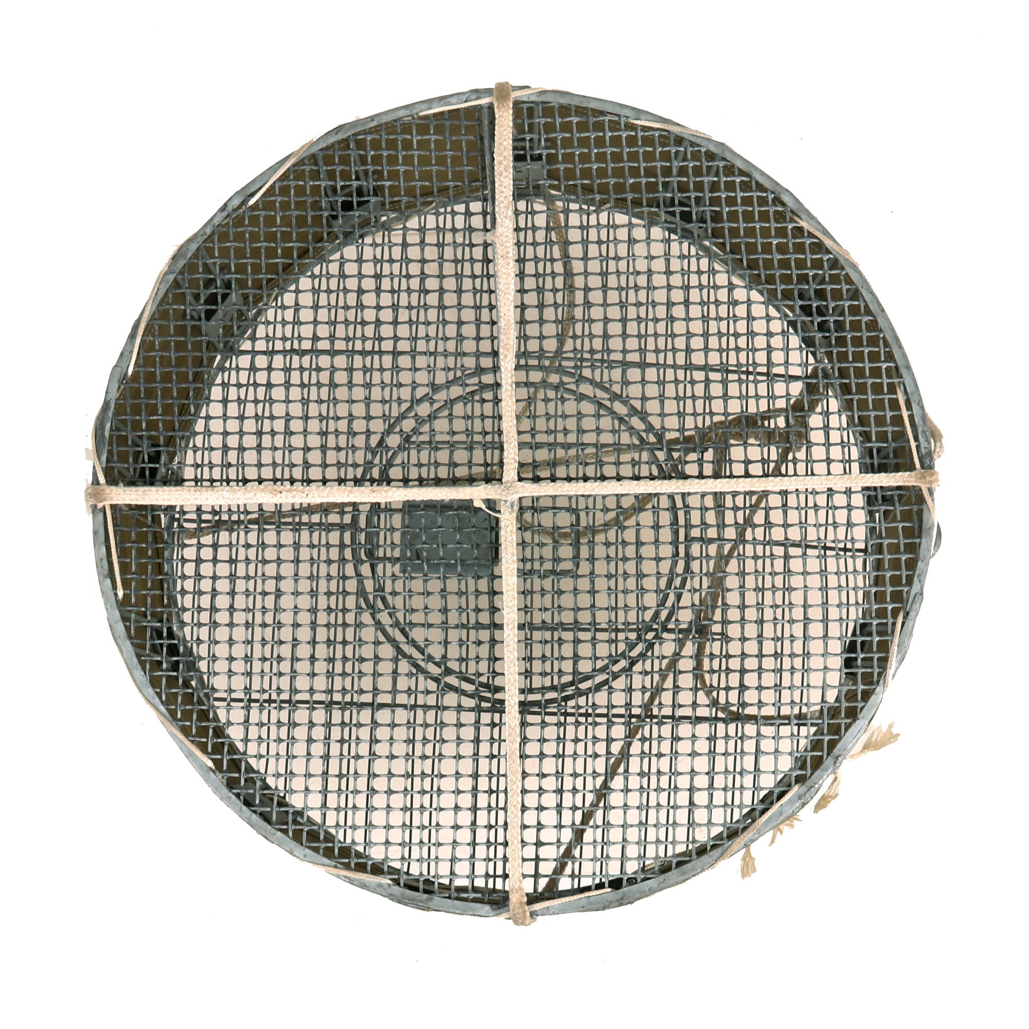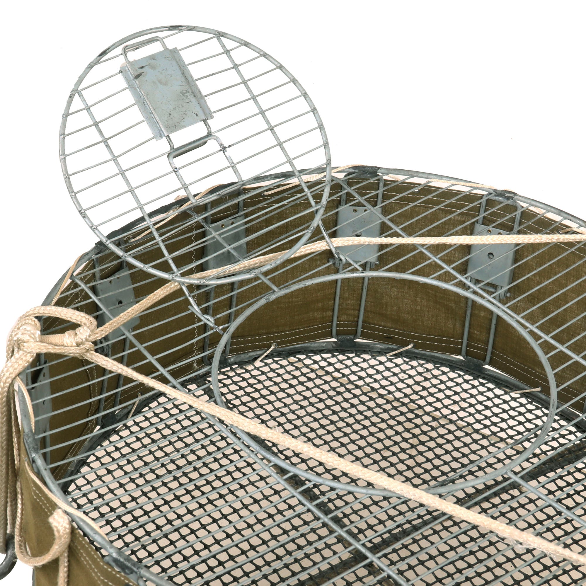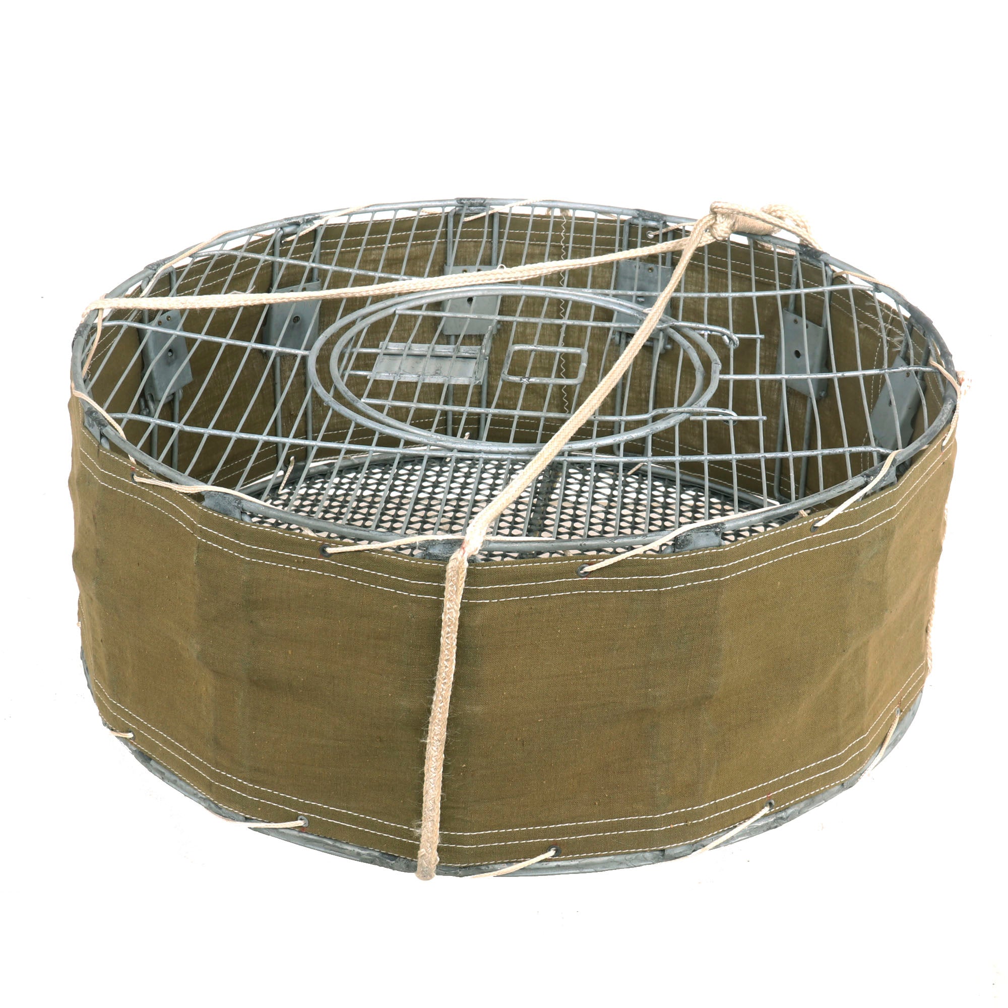 Original Item: Only One Available. This is an original WWII Airborne Signal Corps drop cage designed to carry eight homing pigeons and is complete with the hanging suspension lines, hook, and original white silk parachute. This specially designed cage allowed 8 birds to be safely dropped where needed. As long as the pilot followed procedures, the birds could reach their destination. This is the most complete and best condition example of these that we have ever encountered. It measures: 17 inches in diameter and is 7 inches tall. The side is ink stamped: