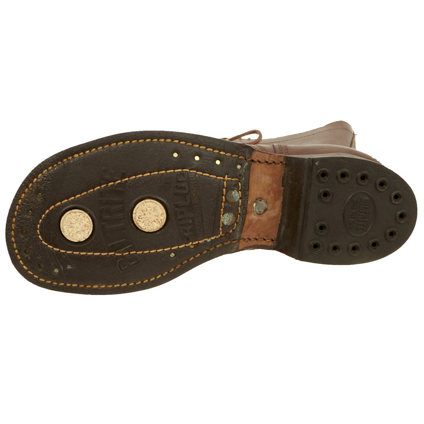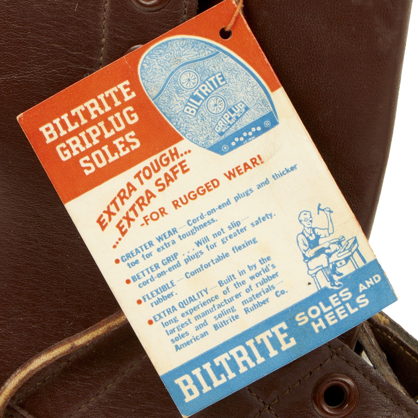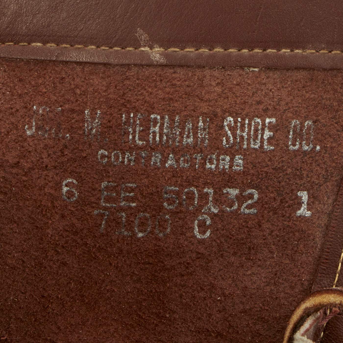 This is a New Old Stock (NOS) pair of jump boots manufactured by The Joseph M. Herman Shoe Company of Millis, Massachusetts. The are size 6 and feature BILTRITE heels and soles. We were told by the pervious owner that this very pair of boots appears in one of the volumes of the book Heroes in our Midst by John Angolia. These boots are in mint condition having never been walked in and still have the original maker tag. They were commercially made and appear to be late war manufacture.