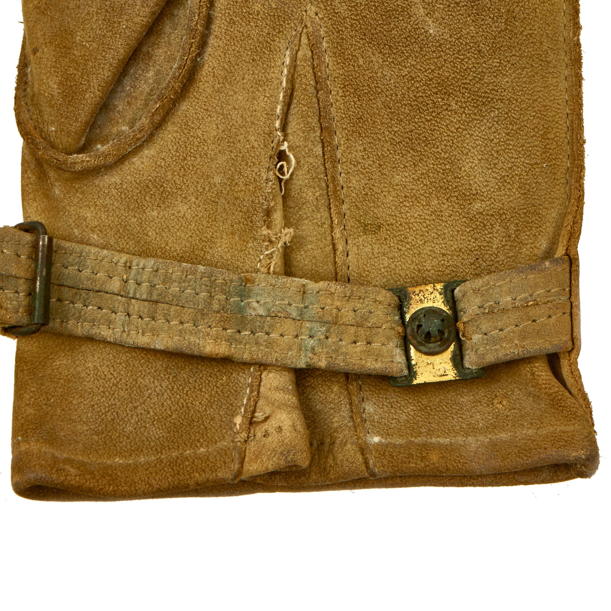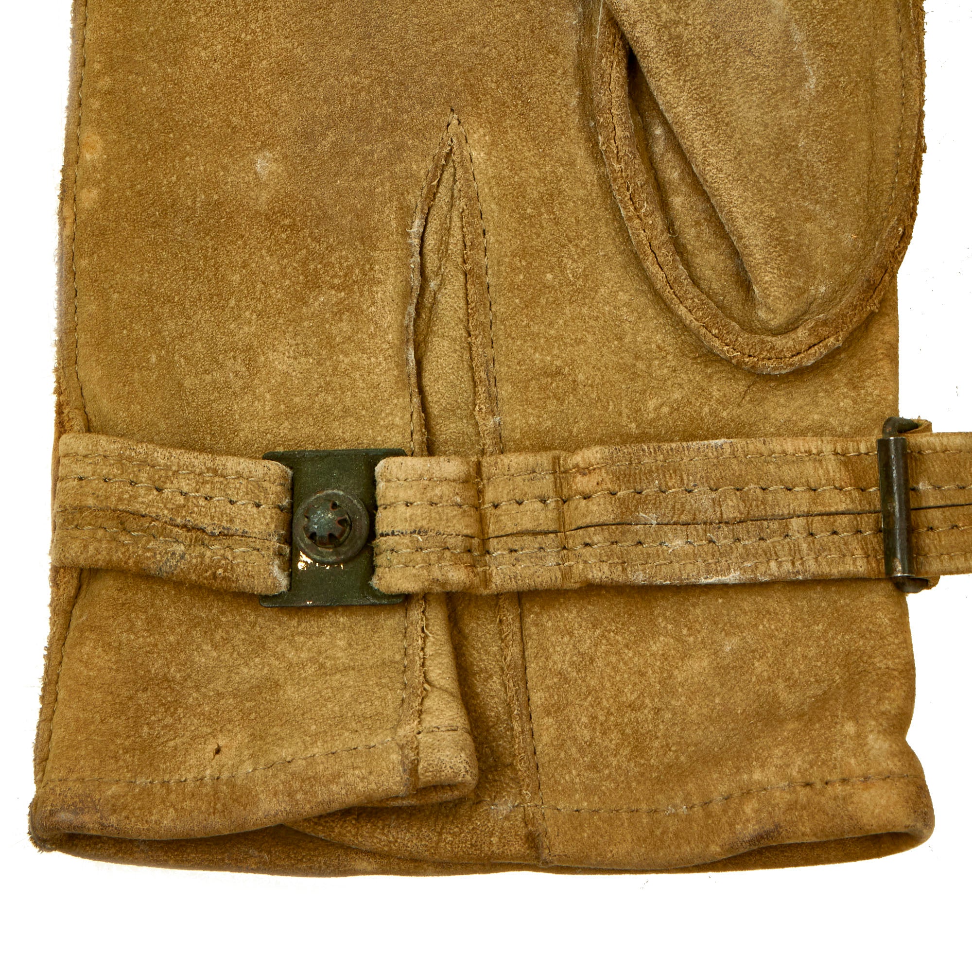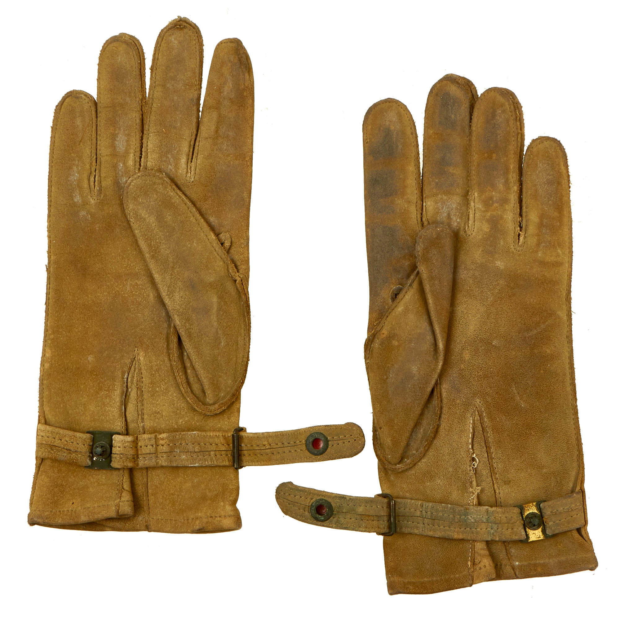 Original Item: Only One Pair Available. These are nearly impossible to find on the market today: an authentic pair of World War Two United States Airborne Paratrooper Leather Gloves as used by Paratroopers on D-day! These gloves were originally designed to be cavalry riding gloves, but were adopted for use by US airborne paratroopers during WWII as well as various other “specialty” type soldiers. They were issued with and without buckles, and this pair is the Type II version with the buckle adjustment for the wrist closure. This variation is an odd one as they have a button snap and roll buckles.