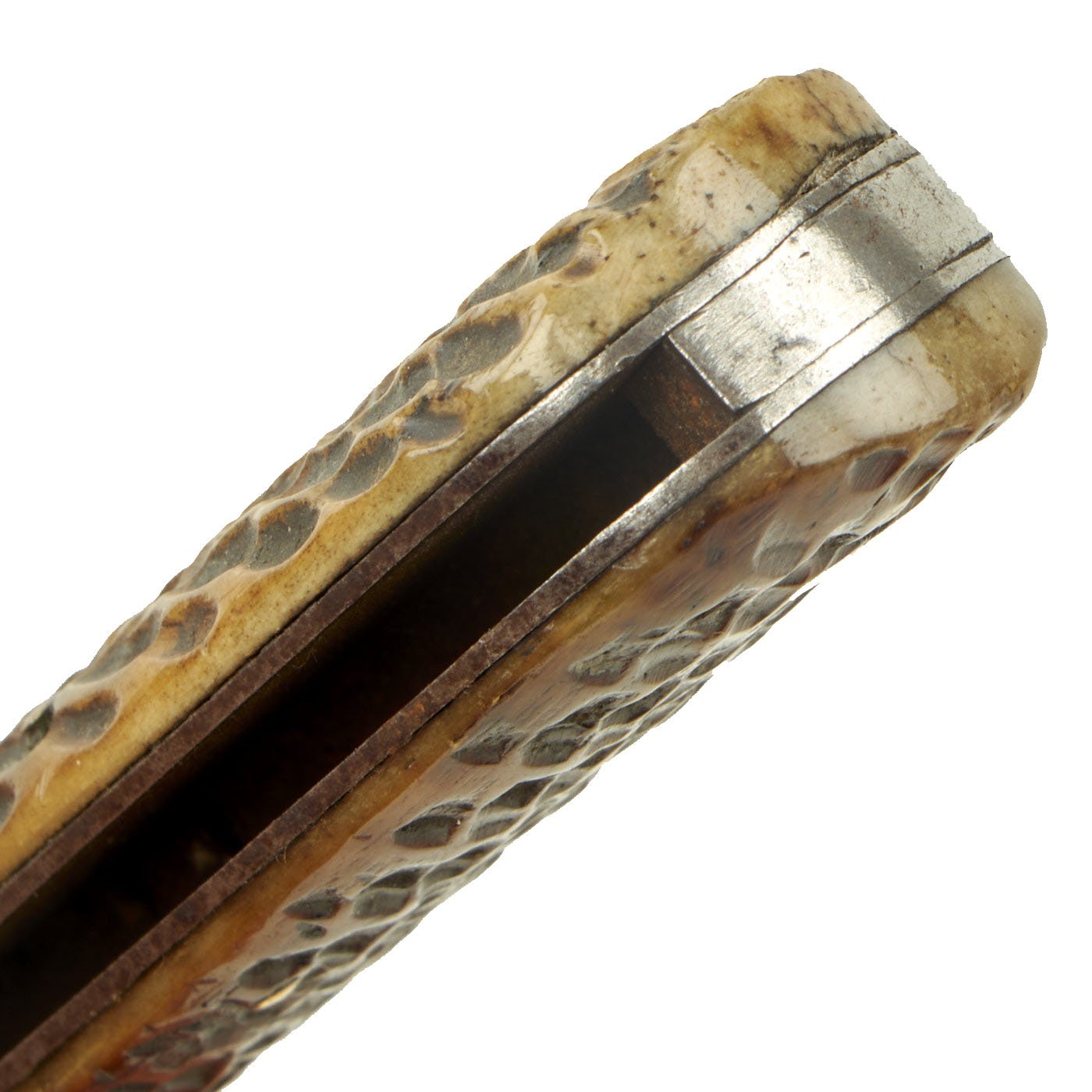 These blade markings definitely identify it as the early No.1 version, and it bears the correct jigged bone handle. These were available in a smaller 7 1/4" size, and in this larger 8 3/4" size, with a 4 inch clip point blade. The blade has been sharpened numerous times over the years, so it is a bit shorter than when issued (3 1/2"), but it still functions properly and is relatively sharp. It also has a nice oxidized patina from use and exposure. The bone handle has a very nice color, and is solid with a great aged look.