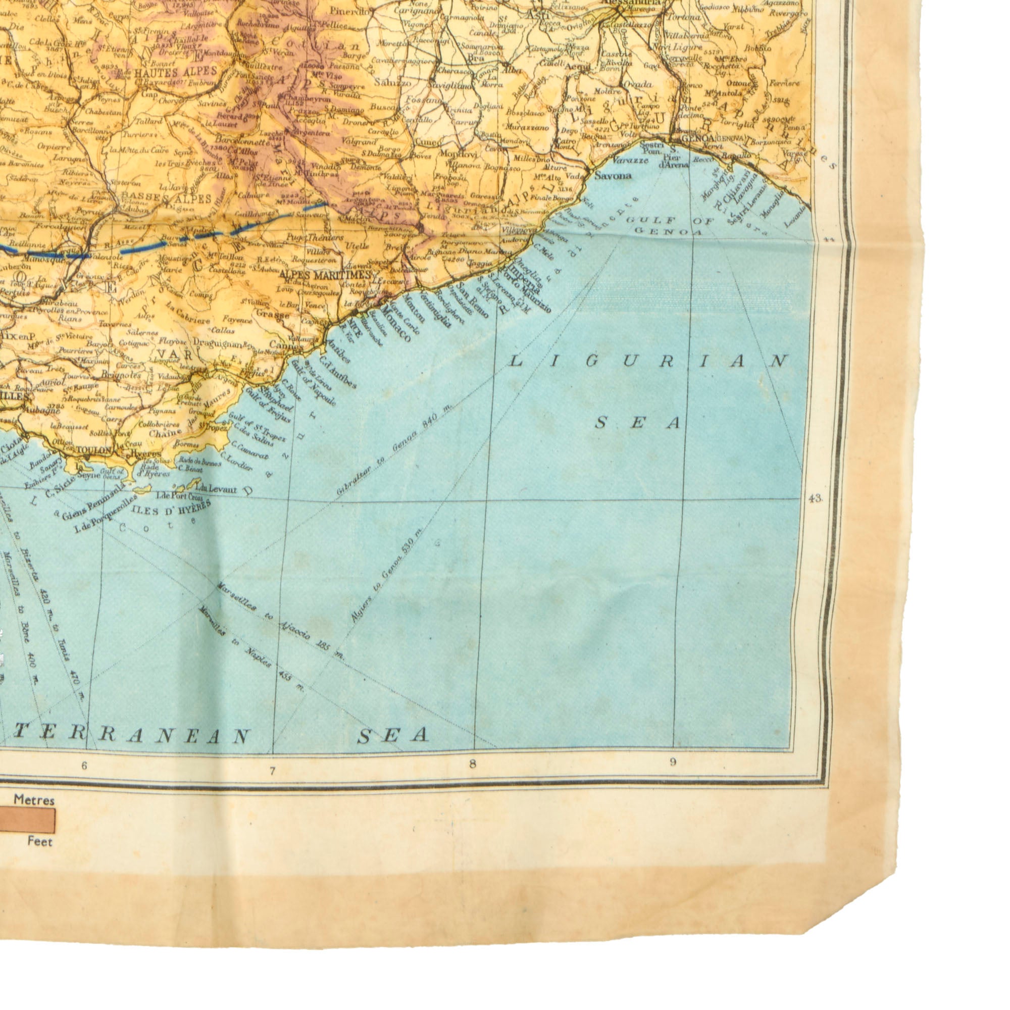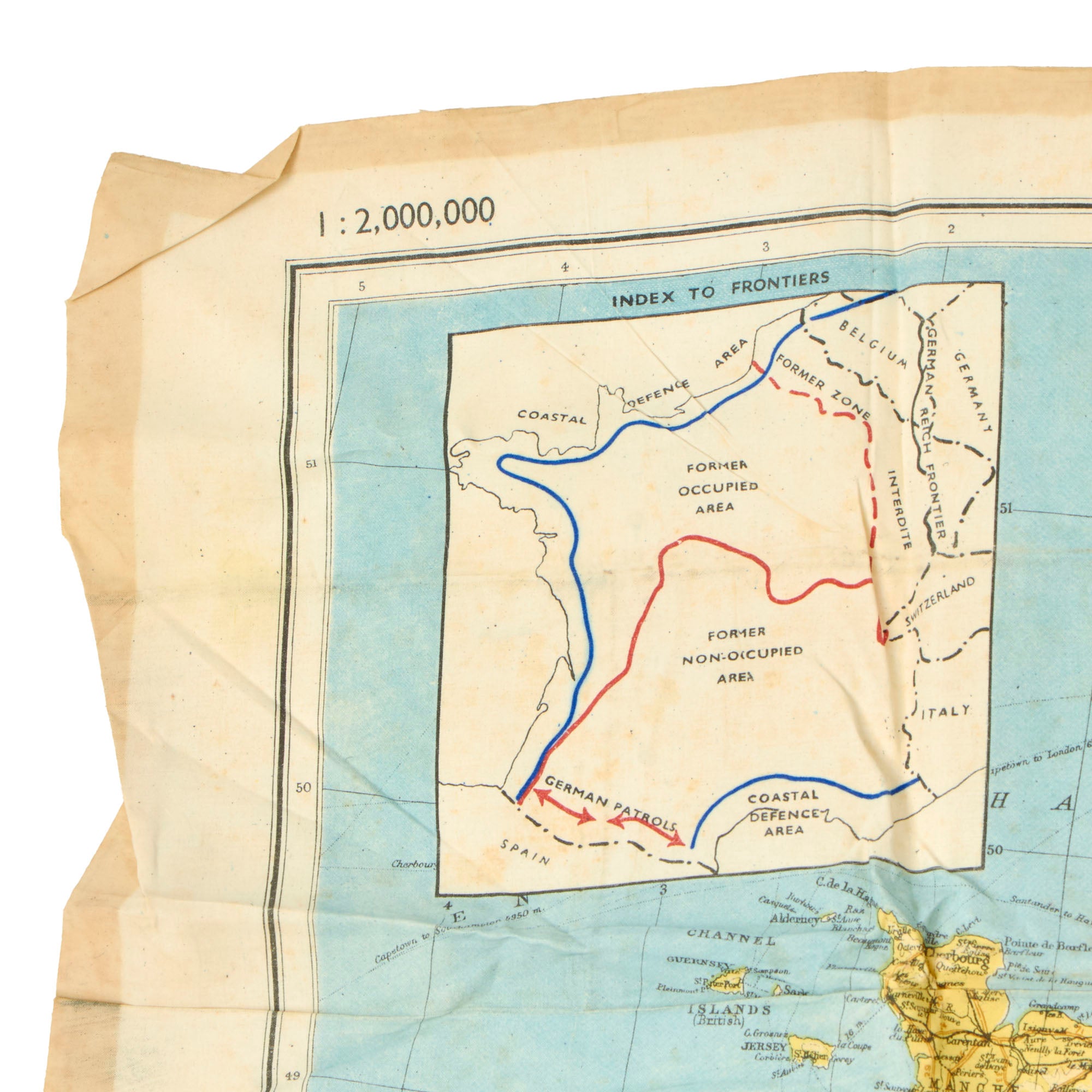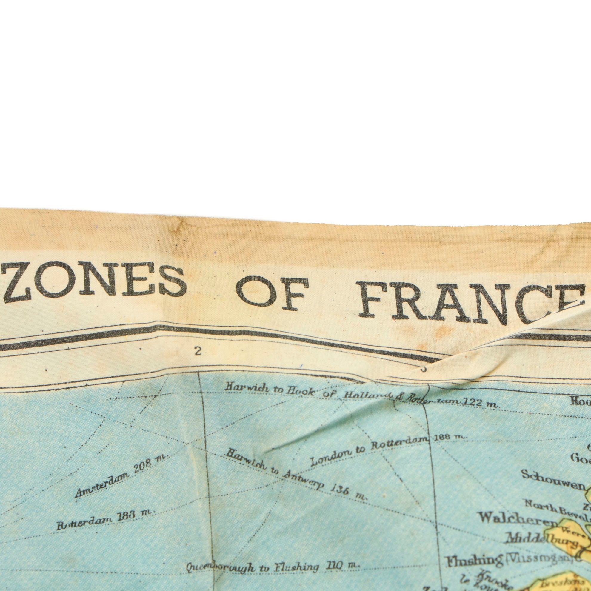 Original Item: Only One Available. This is a rare hard to find March 1944 dated "Zones of France", Scale 1:2.000.000, silk map. On D-Day, this map was mainly worn by US airborne troops around their neck.